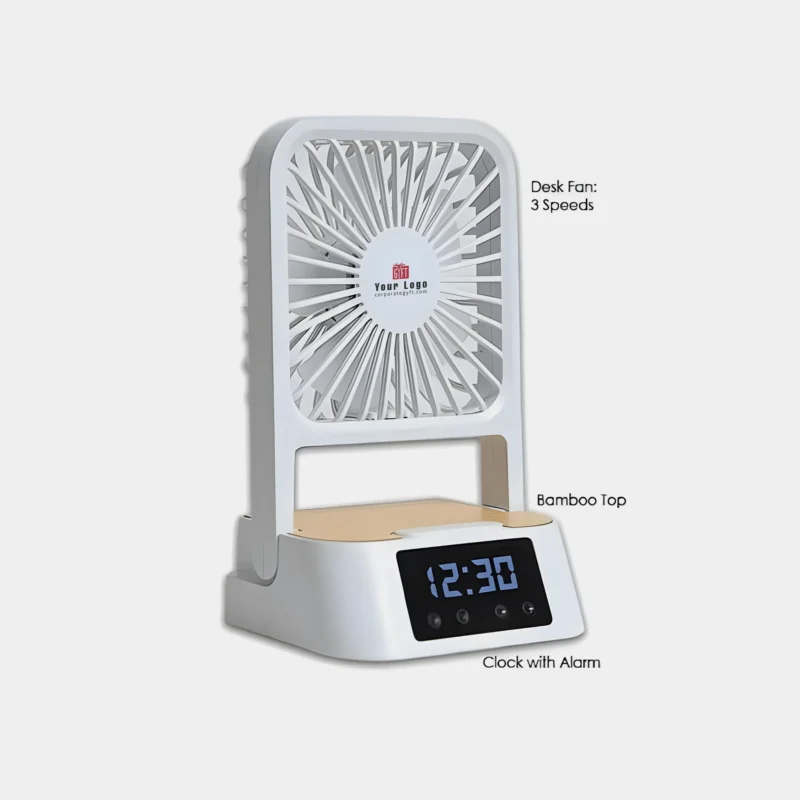 Designed to bring multiple desk essentials together in one compact form, the 5-in-1 desktop fan features a natural bamboo top that adds a premium look while fitting neatly on office desks, study tables, or bedside setups; is built in a slim 18.5×10×3.4 cm size to save space and maintain a clean workspace; is powered by an in-built 1200 mAh rechargeable battery for convenient cordless operation; and is integrated with a mobile stand, charging hub, desk clock with alarm, and a desk fan offering three adjustable speed levels, along with space available for custom logo and design printing, making it suitable for office desks, study tables, bedside use, and corporate gifting.