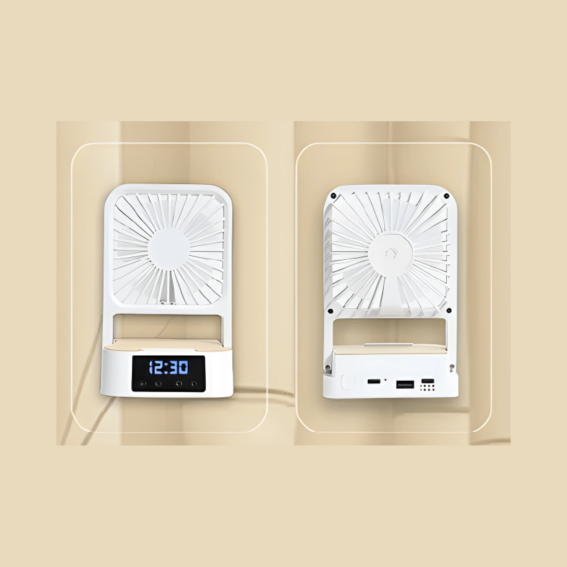 - Functions: Fan, clock, alarm, mobile stand and charging hub
