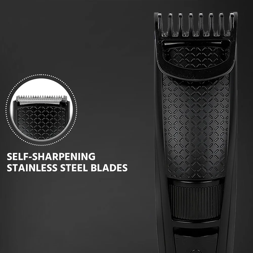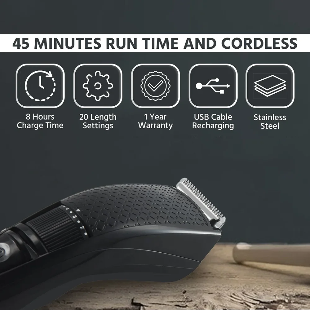 Cordless trimmer features self-sharpening stainless steel blades and 20 adjustable length settings (0.5–10 mm) for precise grooming. Quick-charge and USB-rechargeable design offer 45 minutes runtime per charge, while detachable, washable heads ensure easy cleaning. Rounded-tip blades provide a skin-friendly experience, making it ideal for travel, office grooming, and corporate gifting with space for custom branding.