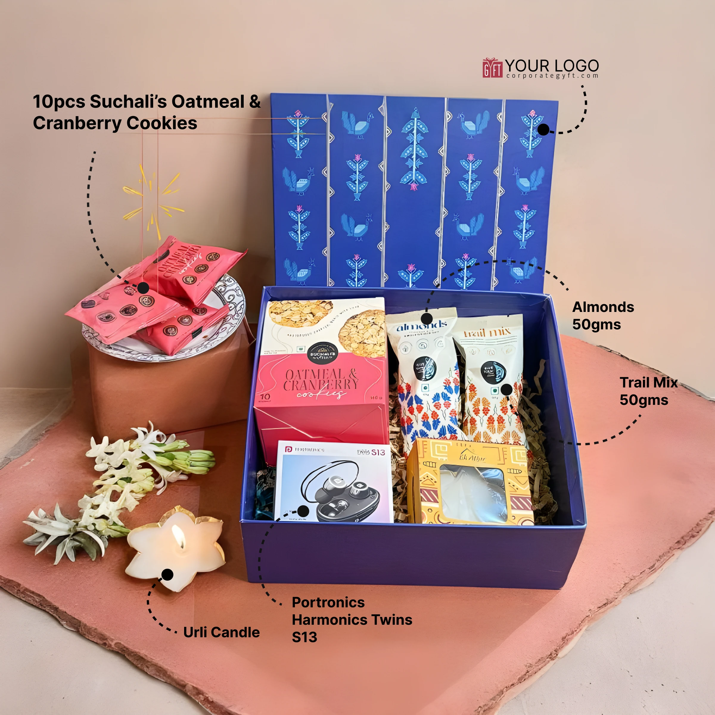 Make Diwali special with this thoughtfully curated hamper combining technology, gourmet treats, and festive décor. It features Portronics Harmonics Twins S13 earbuds, artisanal cookies, premium almonds, and trail mix for indulgent snacking. The decorative Urli candle adds a warm festive glow to any setting. Packaged in an elegant premium gift box with space for personalized branding, this hamper is perfect for gifting to friends, family, employees, and clients, making every celebration memorable.