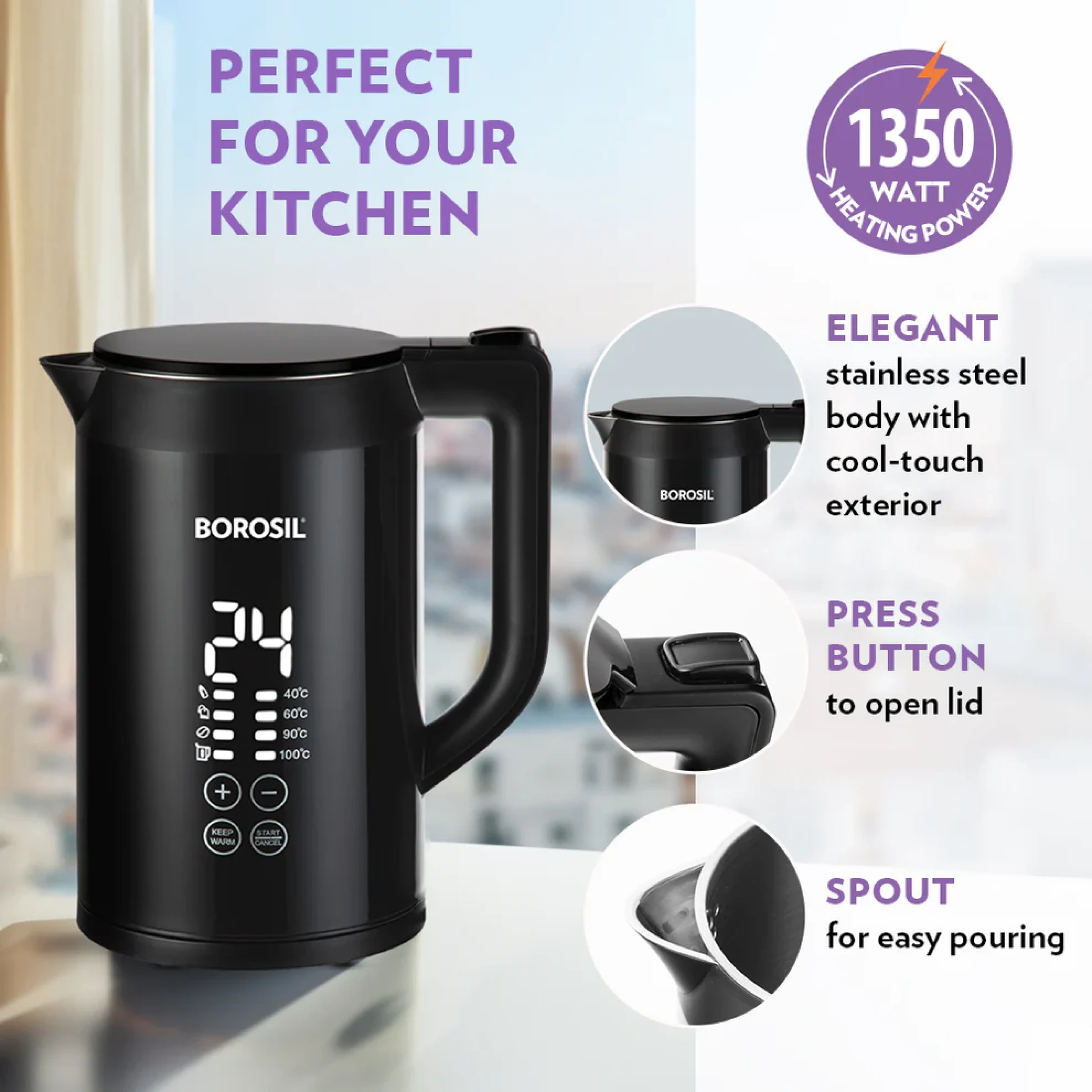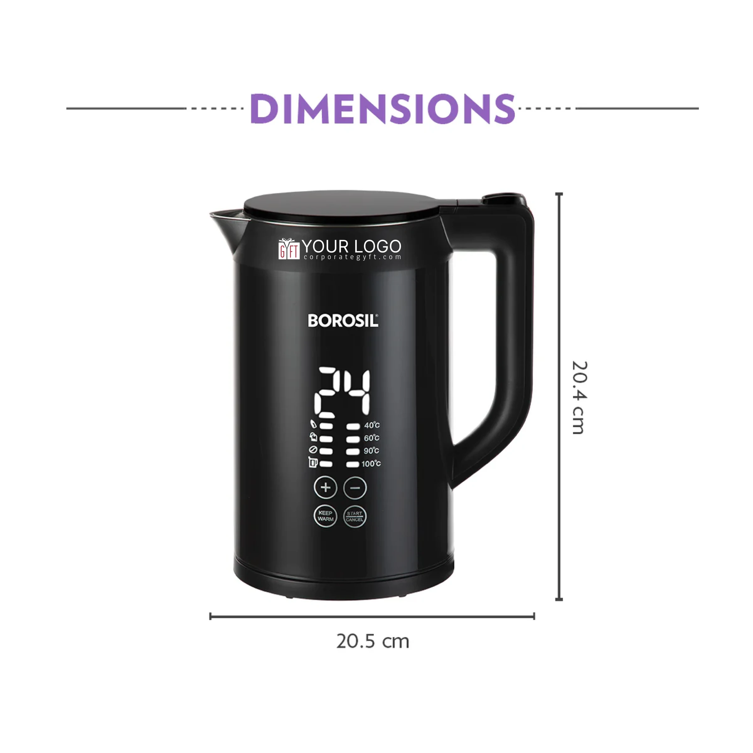 The Borosil digital electric kettle is a premium kitchen appliance designed for quick and convenient boiling. Made from food-grade stainless steel, it features a cool-touch exterior, concealed heating element, and a 360° detachable base for safe and easy use. The digital display and 4 preset temperature settings make it ideal for precise brewing, while the in-built keep-warm mode ensures your beverages stay hot. Additional safety features include dry boil prevention, auto shut-off, and overheat protection. Equipped with a long power cord with cord winder, this kettle is perfect for hotels, gourmet chefs, office use, festive occasions, and corporate gifting, with space available for custom logo or design printing.