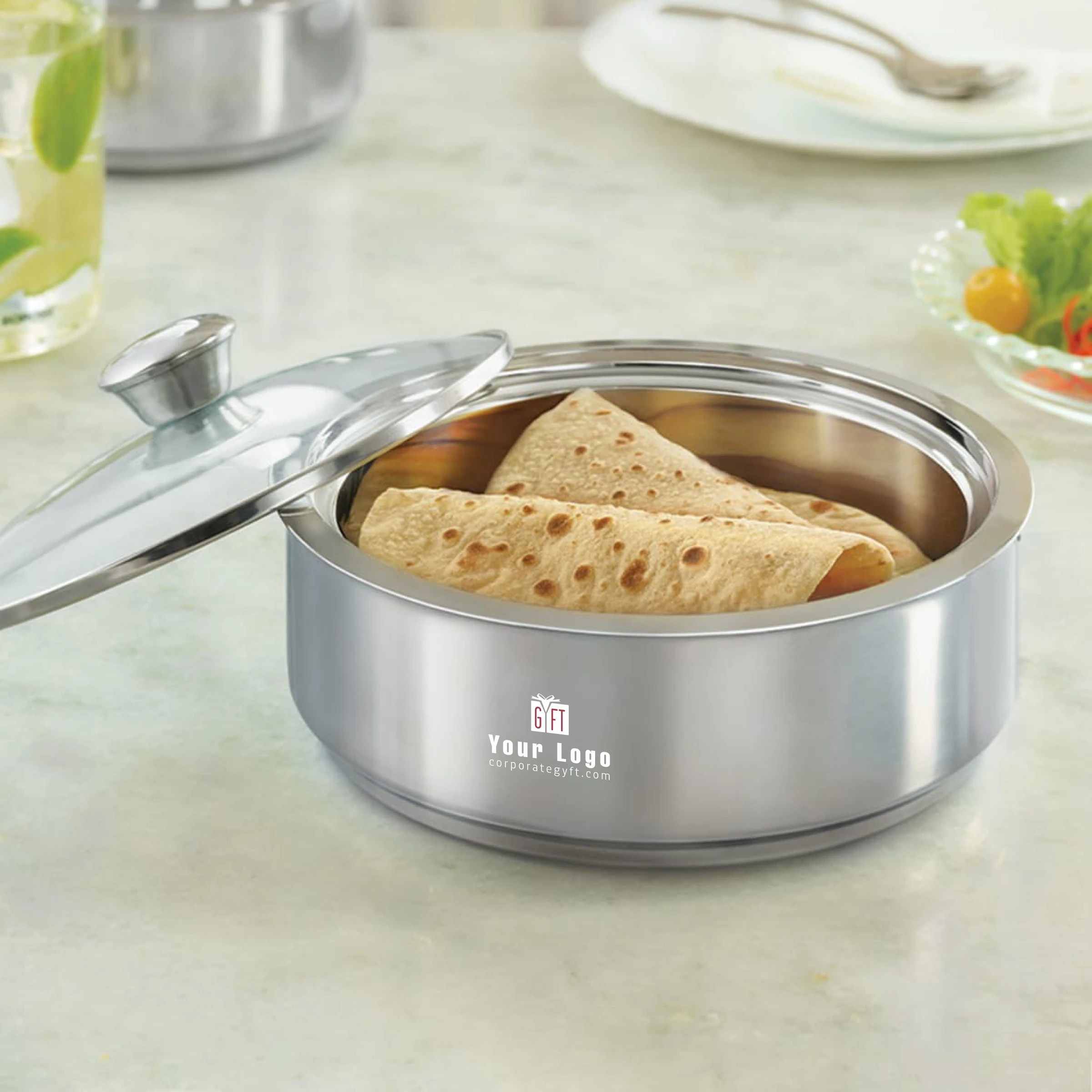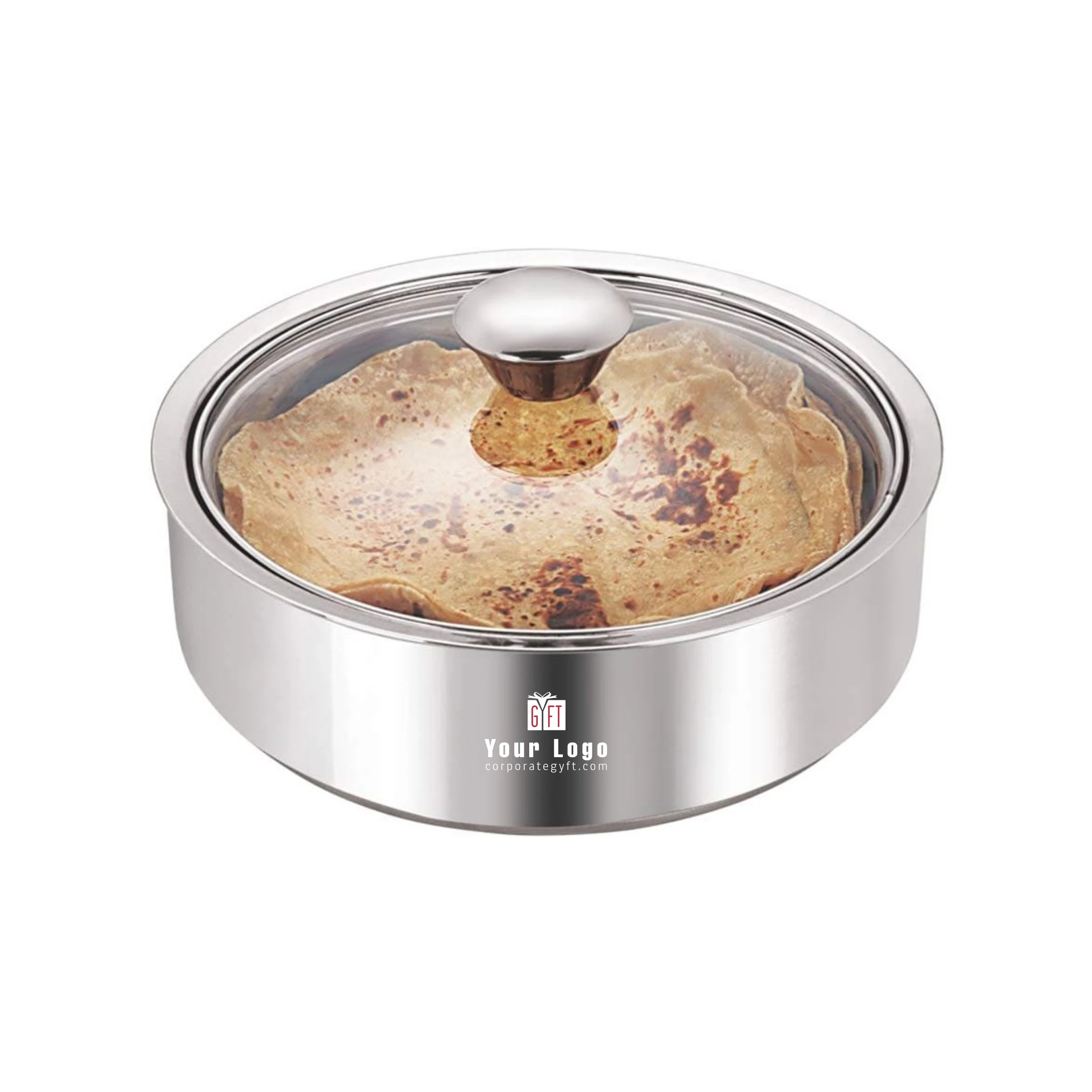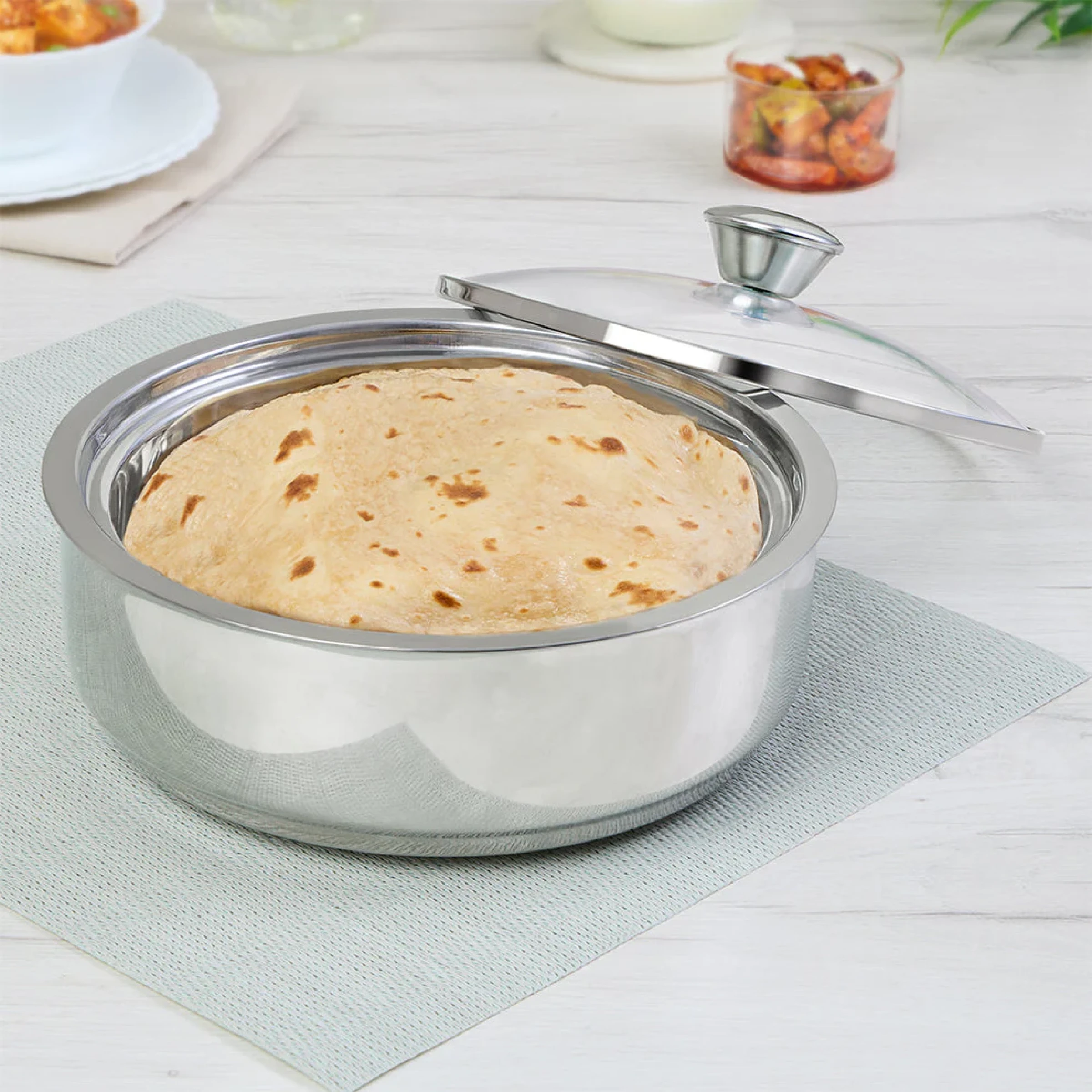 This insulated roti server is designed to keep rotis fresh and free from sogginess. Its double-walled PUF insulation retains the nutritive value of food, while the dome-shaped toughened glass lid ensures steam condensation slides away without touching the rotis. The mirror finish stainless steel body and interior add durability and easy cleaning, making it both functional and elegant.