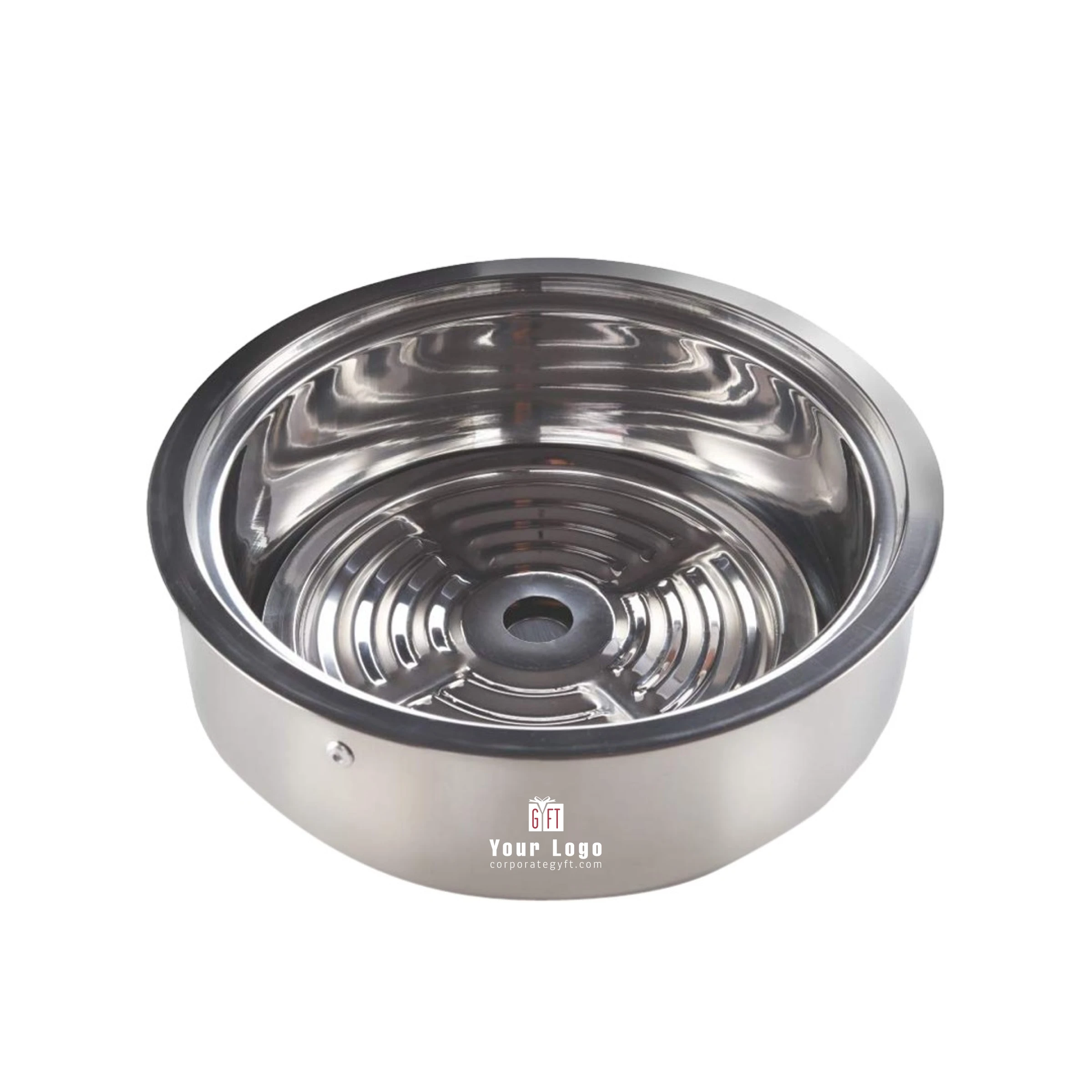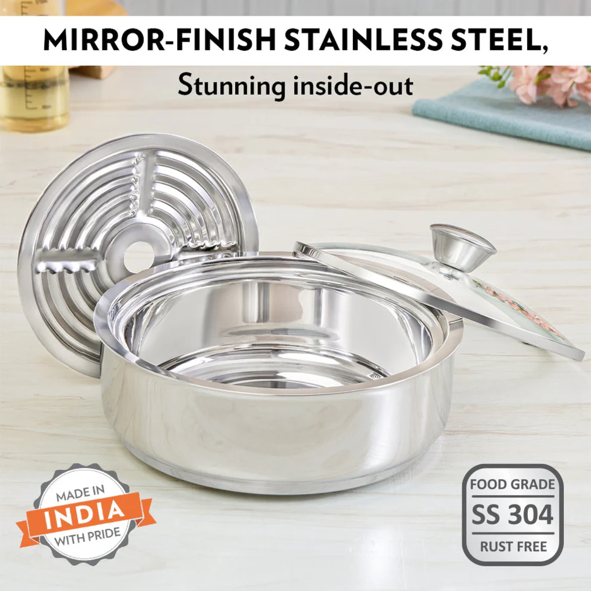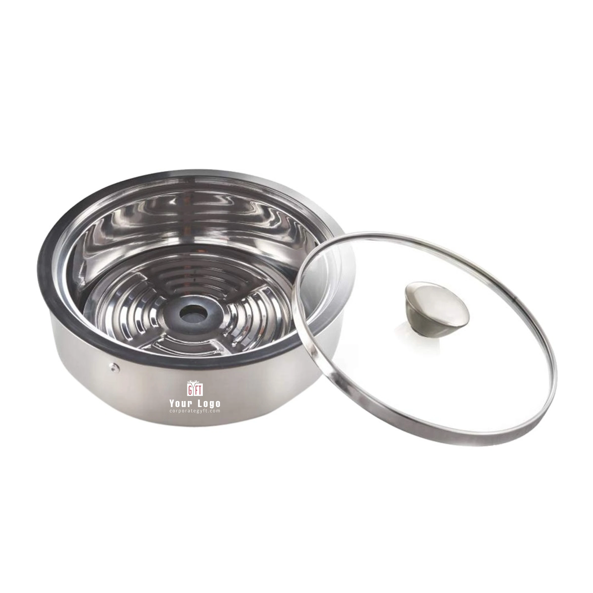 This insulated roti server is designed to keep rotis fresh and free from sogginess. Its double-walled PUF insulation retains the nutritive value of food, while the dome-shaped toughened glass lid ensures steam condensation slides away without touching the rotis. The mirror finish stainless steel body and interior add durability and easy cleaning, making it both functional and elegant.