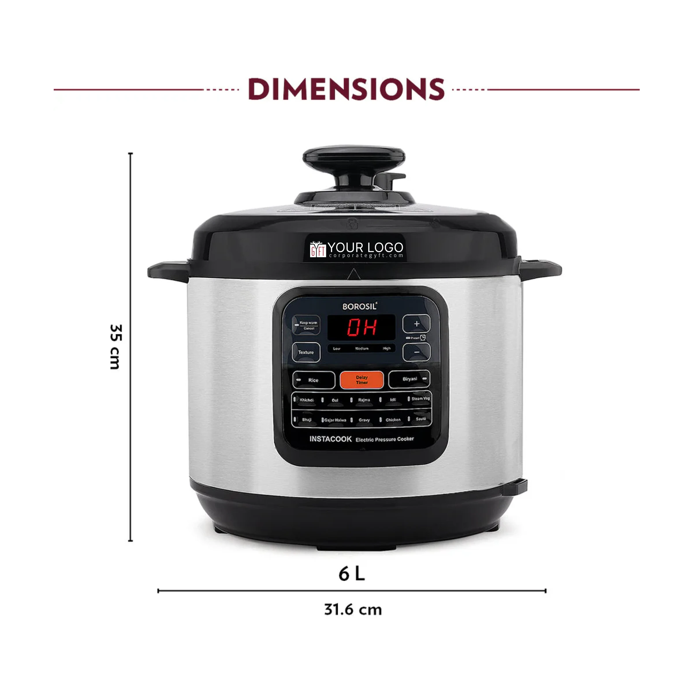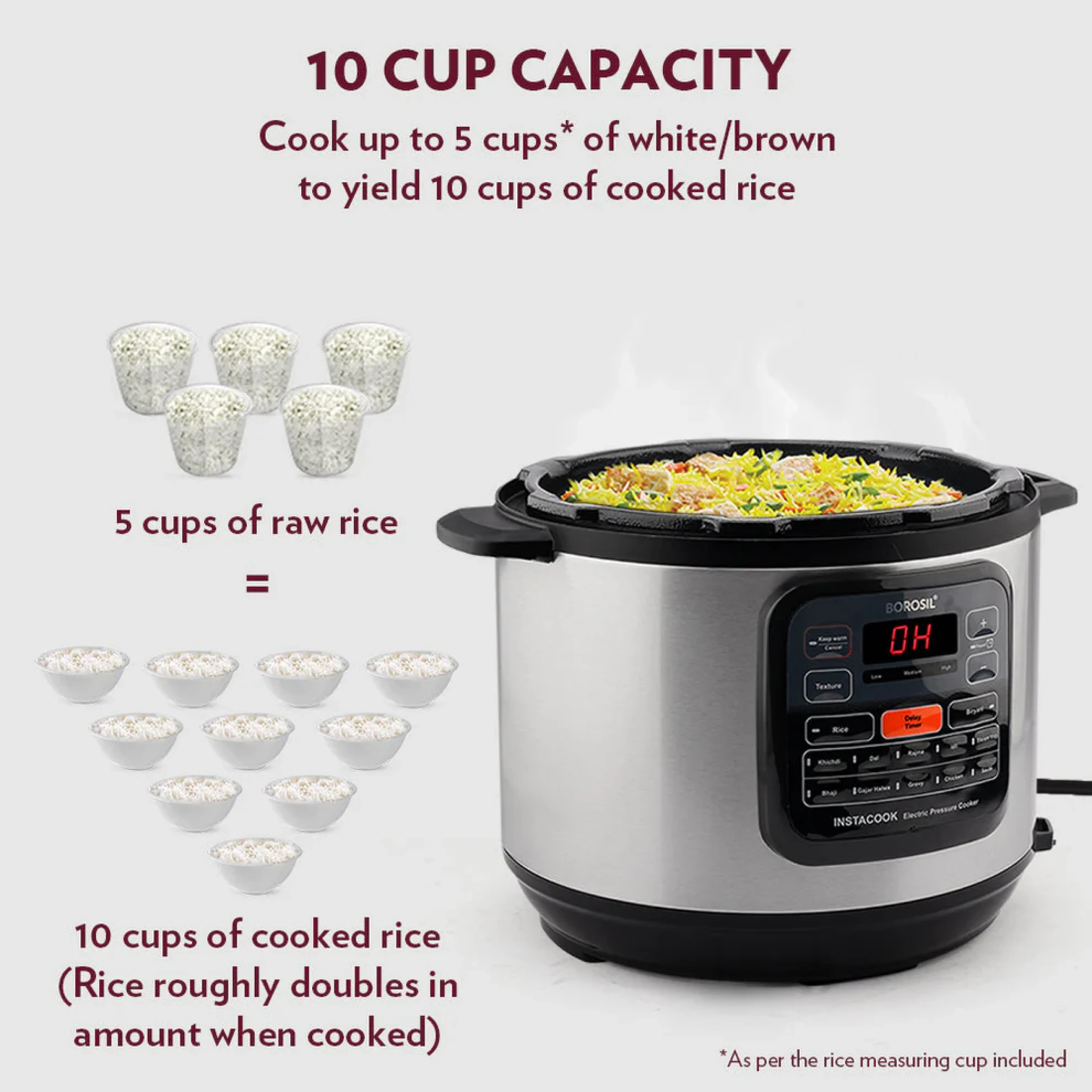 The Borosil instacook 6L electric pressure cooker makes healthy and delicious meals easy with its versatile one-pot cooking. Featuring a thick non-stick pot and durable stainless steel housing, it offers 12 digitized Indian cooking programs and a 15-hour delay timer for convenient anytime cooking. With safety-first design including seven built-in safety measures and a pressure status indicator, it ensures worry-free operation. Additional features like keep warm function, texture selection, and detachable power cord add to its user-friendly experience. Complete with essential accessories, this cooker is perfect for preparing rice, biryanis, pulaos, and much more.