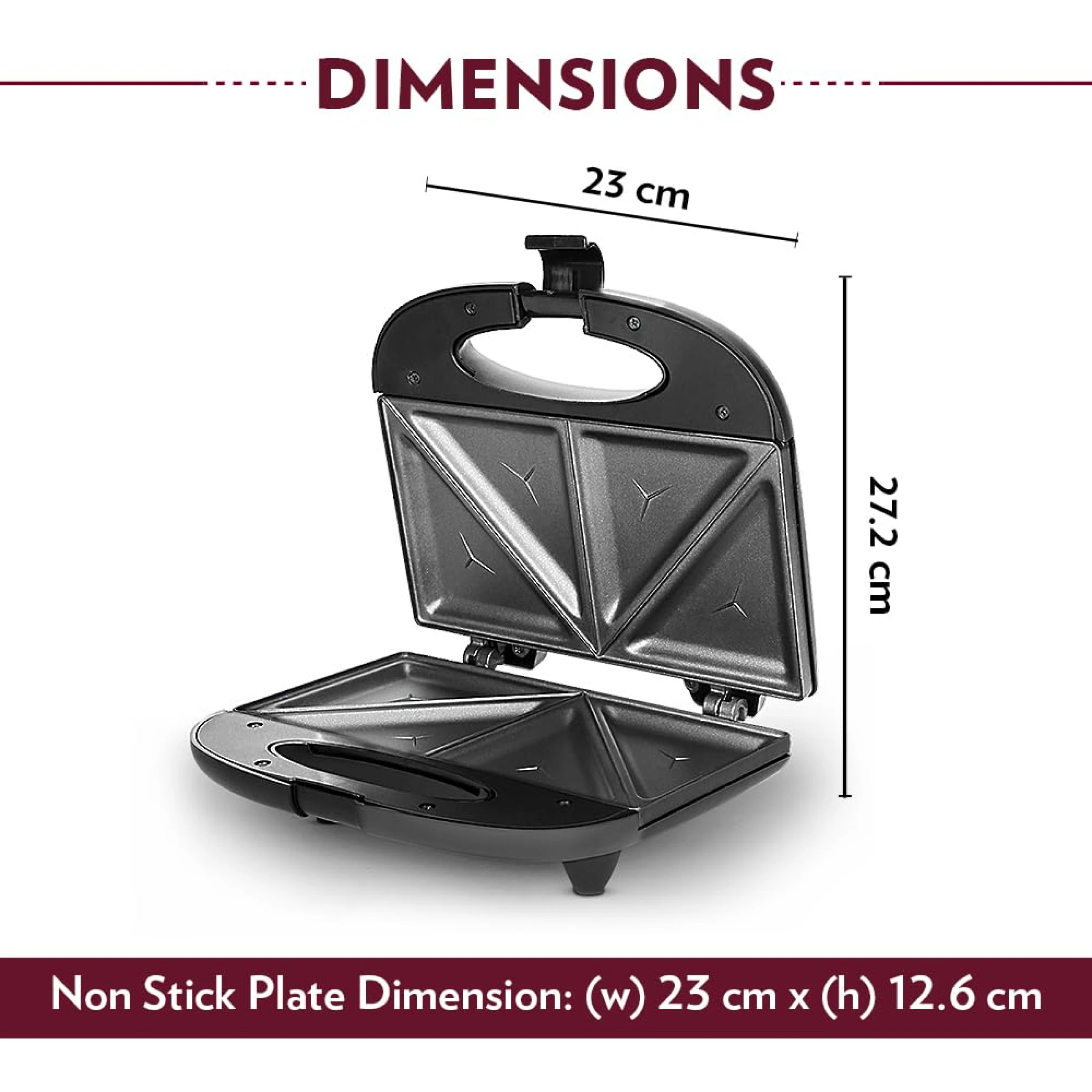 This 800-watt sandwich maker features non-stick plates that prepare two sandwiches at once with minimal butter. Designed with automatic temperature control, cool touch handle, and power indicators, it ensures safe and easy use. The stainless steel mirror finish adds elegance to your kitchen, while anti-skid legs and a cord wrap provide stability and easy storage. Perfect for quick, crispy snacks anytime.