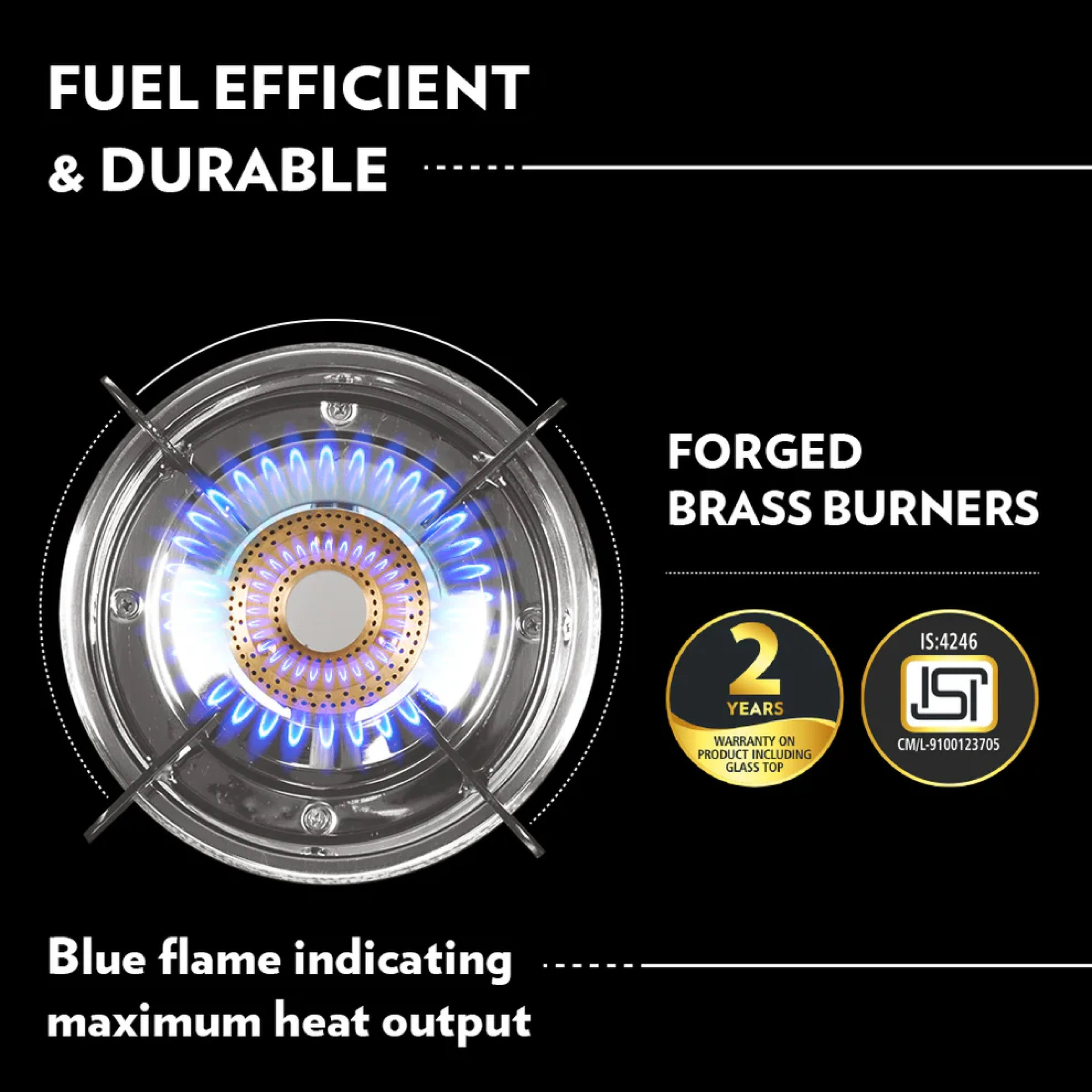 The Borosil magnum 3 burner gas stove is designed for Indian kitchens that love to cook more in less time. With three efficient brass burners, you can boil, sauté, and simmer simultaneously. Its sleek 6mm toughened glass top adds durability and style, while the 360° rotating nozzle offers flexible placement. Anti-skid legs, decorative knobs, and an easy-to-clean drip tray make it a reliable and user-friendly choice for everyday cooking.