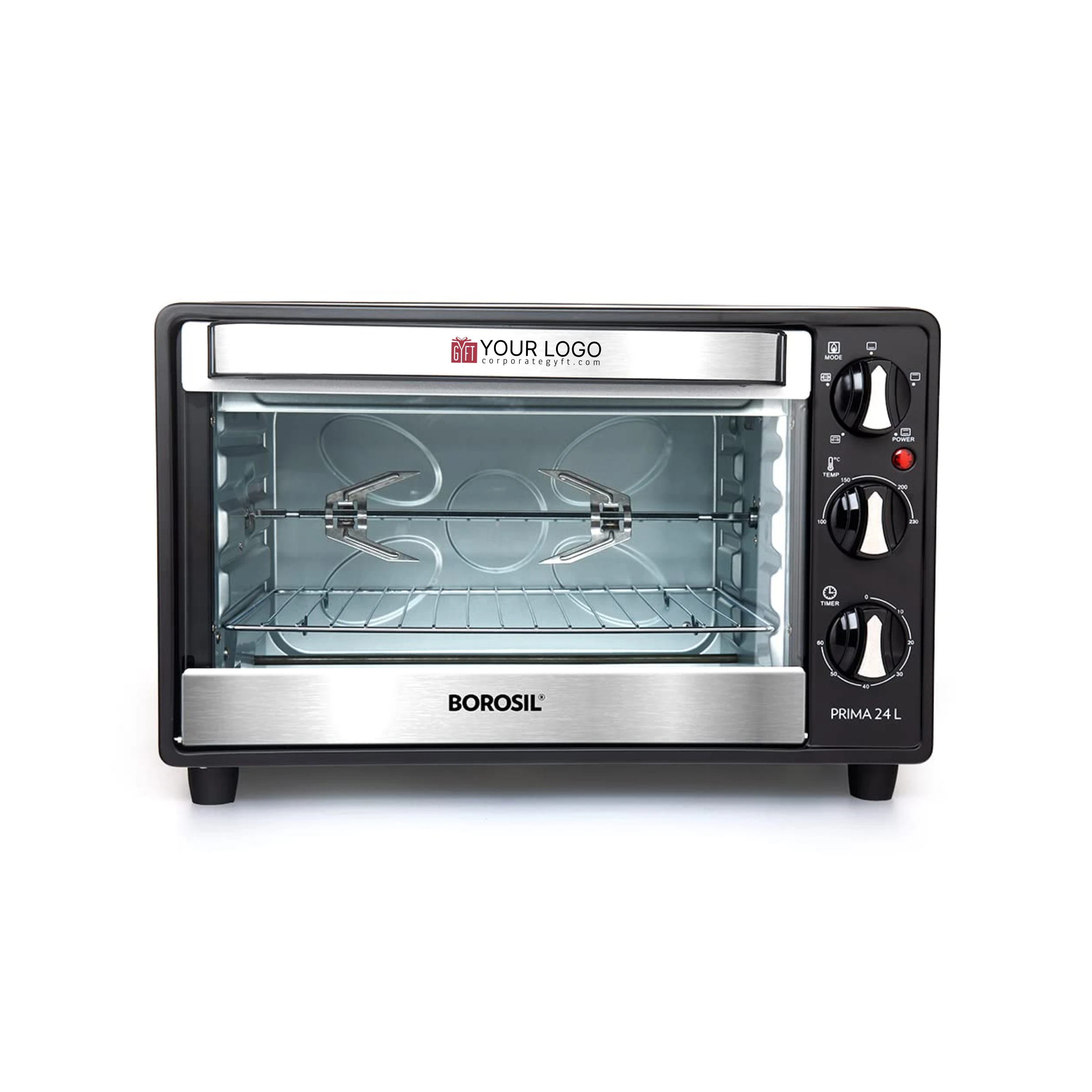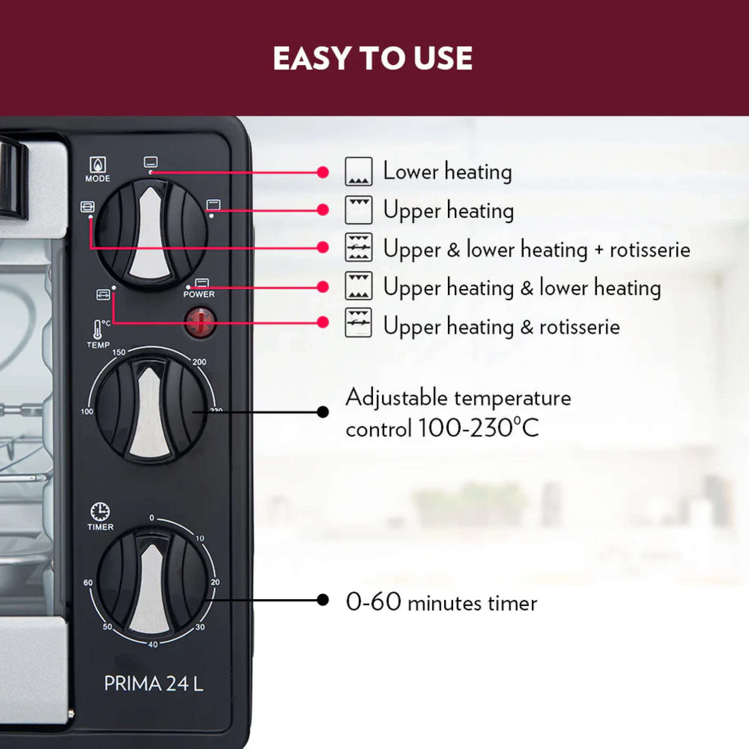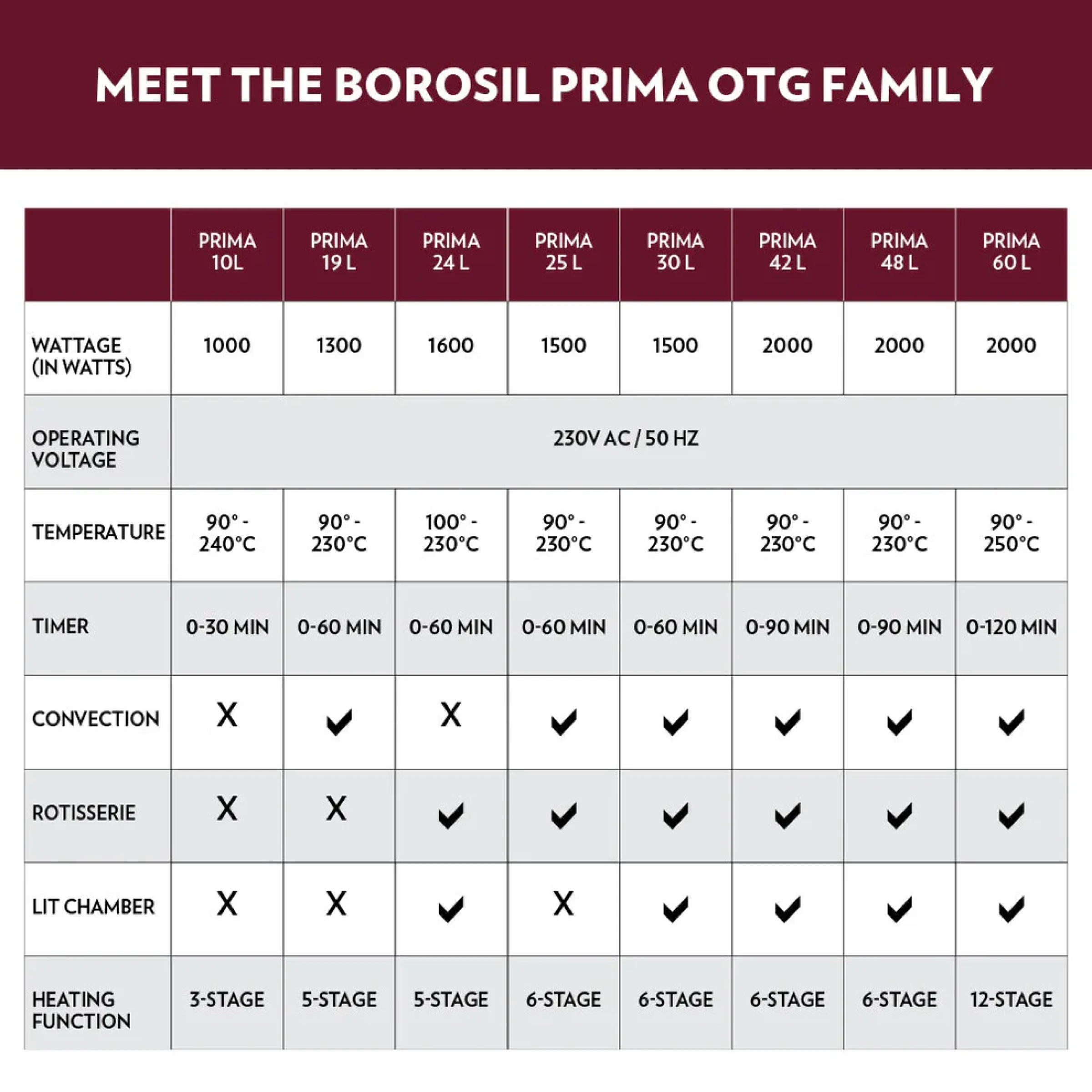 The Borosil prima 24L OTG is a perfect companion for all your baking, grilling, and toasting needs. It features 5-stage heating, adjustable temperature control (100°C–230°C), and a 0–60 minute mechanical timer for precise cooking. The motorized rotisserie ensures uniform grilling, while the removable crumb tray and protective heater frame make cleaning and safety effortless. Anti-skid feet and a baffle plate behind the handle prevent overheating, ensuring safe use every time. Compact yet powerful, this OTG is ideal for home kitchens and also makes a thoughtful gifting option for cooking enthusiasts.