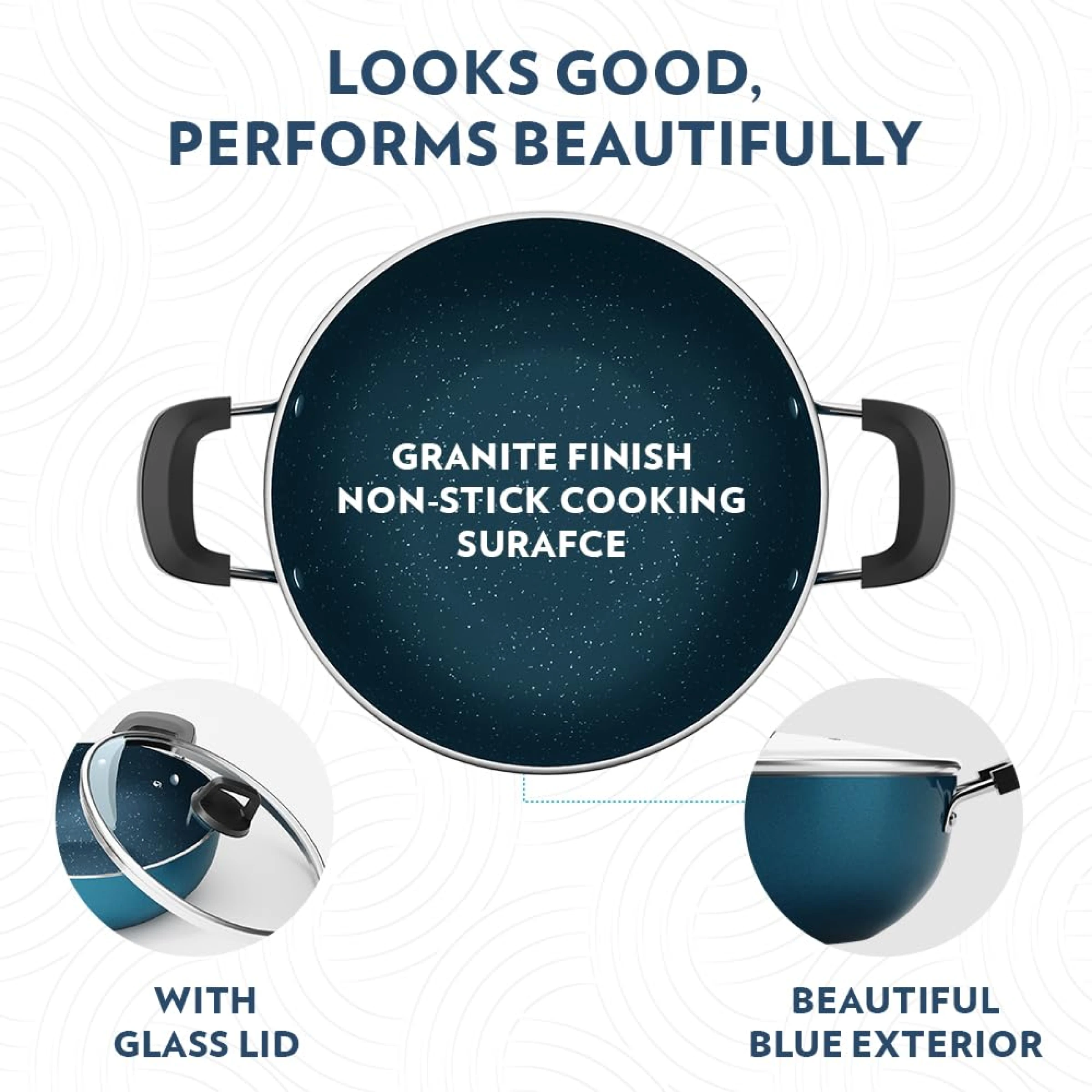 Experience effortless cooking with the Borosil pro chef non-stick kadhai. Made from lightweight aluminium with a durable non-stick finish, it ensures even heat distribution and easy cleaning. The 5-layer hygienic non-stick coating is scratch-resistant and anti-bacterial, while the stay-cool handle makes cooking safe and comfortable. Perfect for gas cooktops, this elegant blue kadhai combines style, durability, and healthy cooking in one.