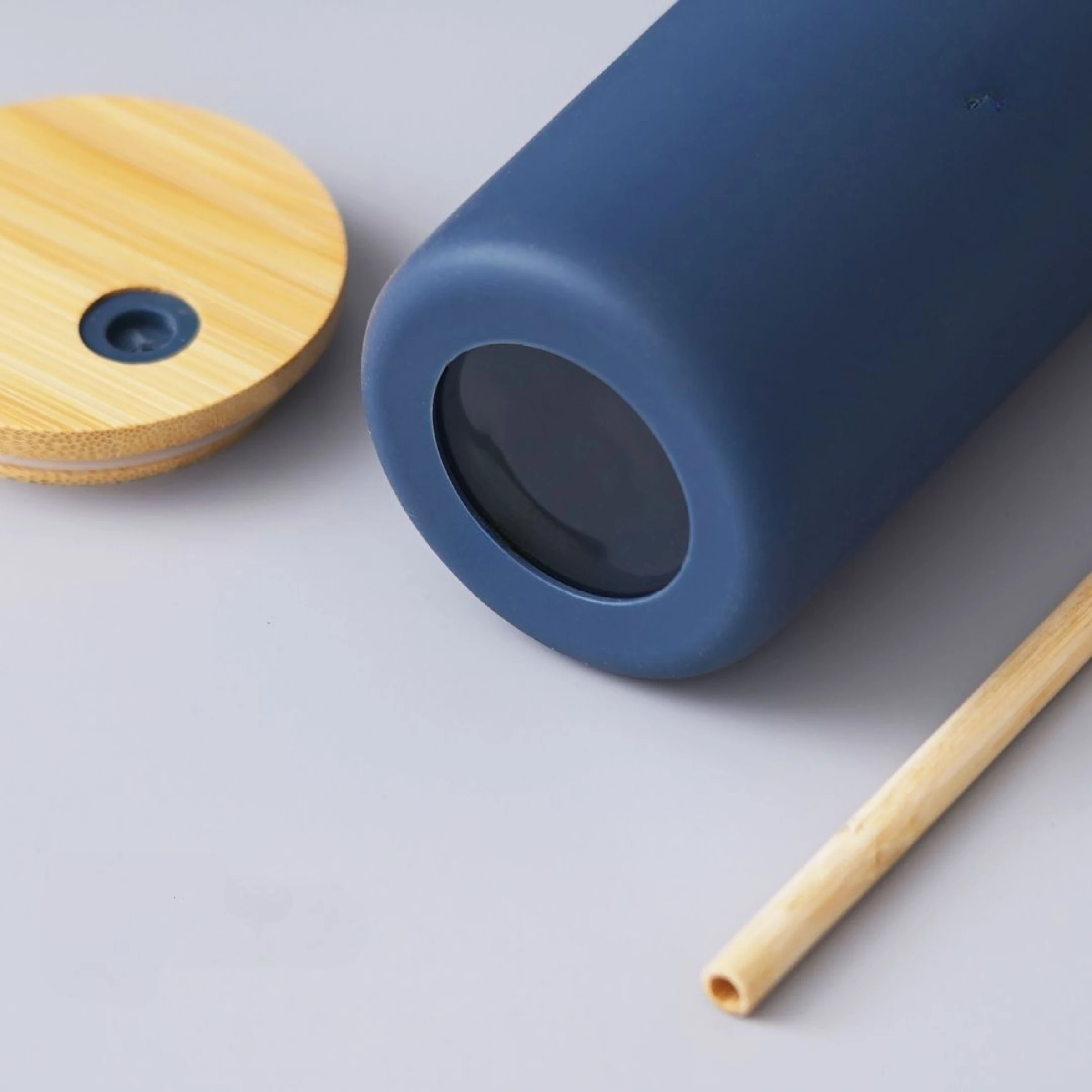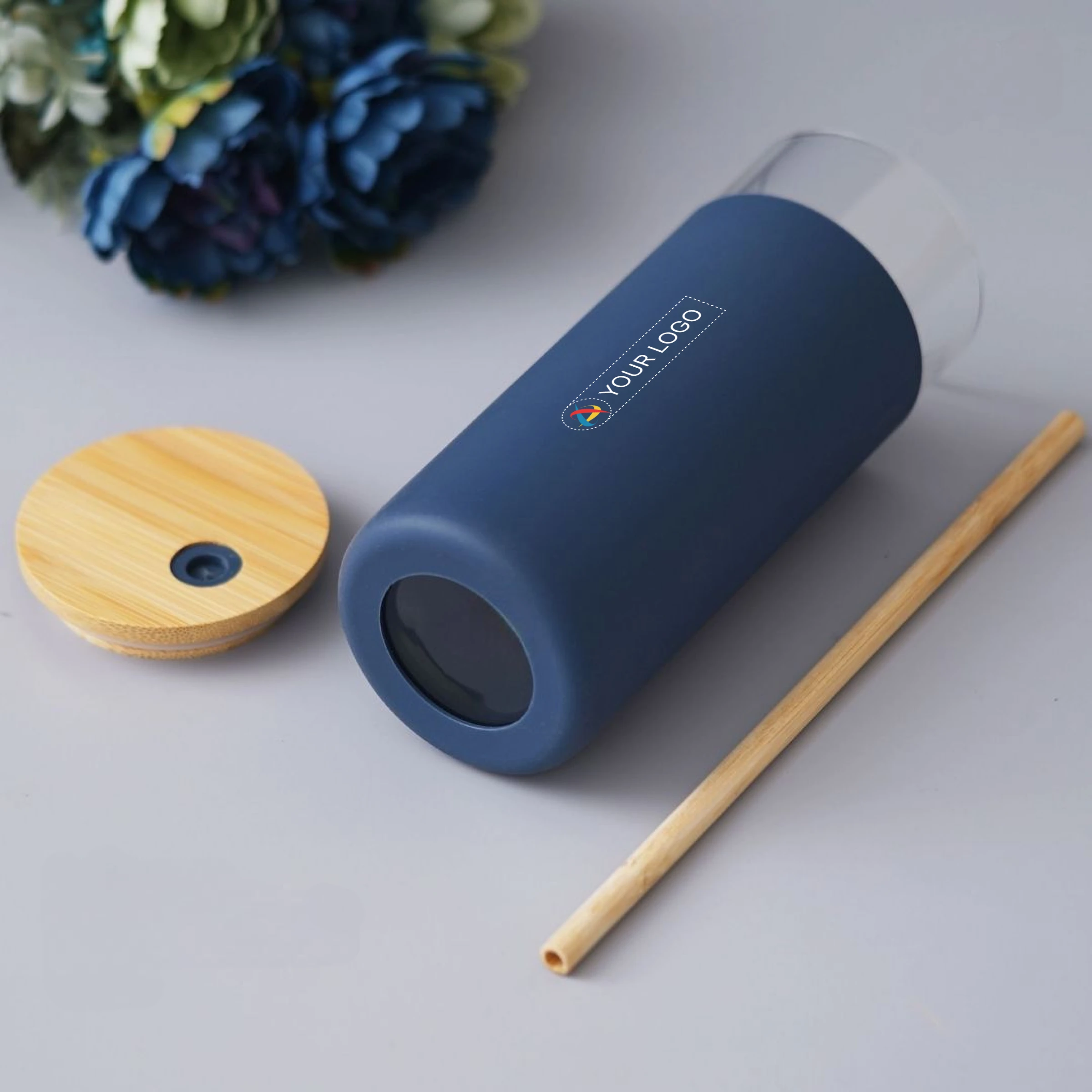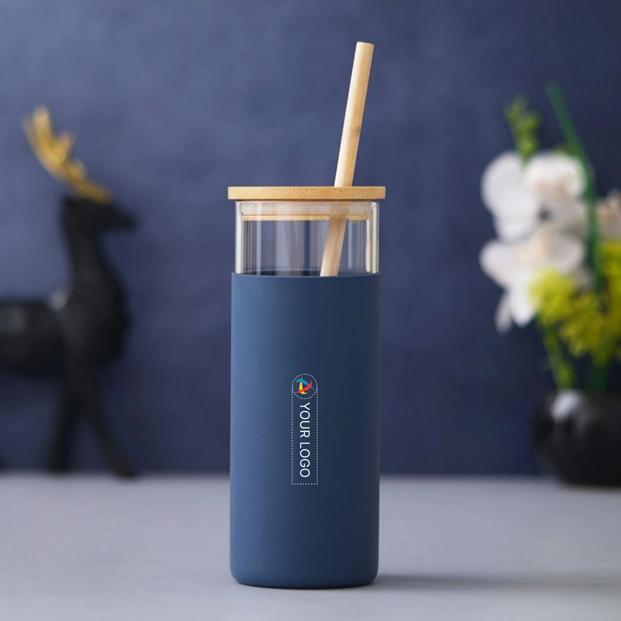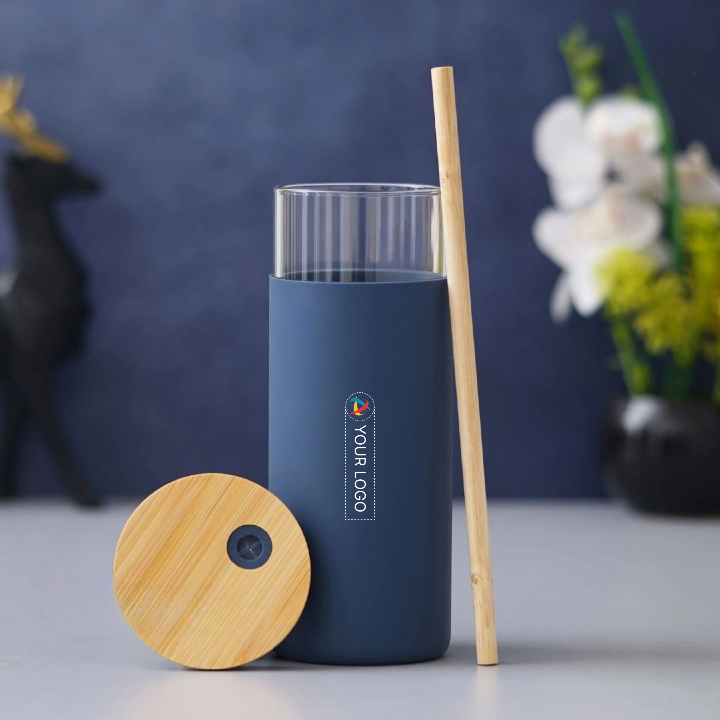 Includes a natural bamboo lid and a clear top section that enhances visibility and presentation. Comes with a straw for convenient use and features a protective silicone sleeve that ensures grip and safety. Crafted from durable borosilicate glass with a sublimation-ready surface for vibrant custom branding. Ideal for sustainable gifting campaigns, wellness hampers, eco-conscious events, and modern workplace kits.