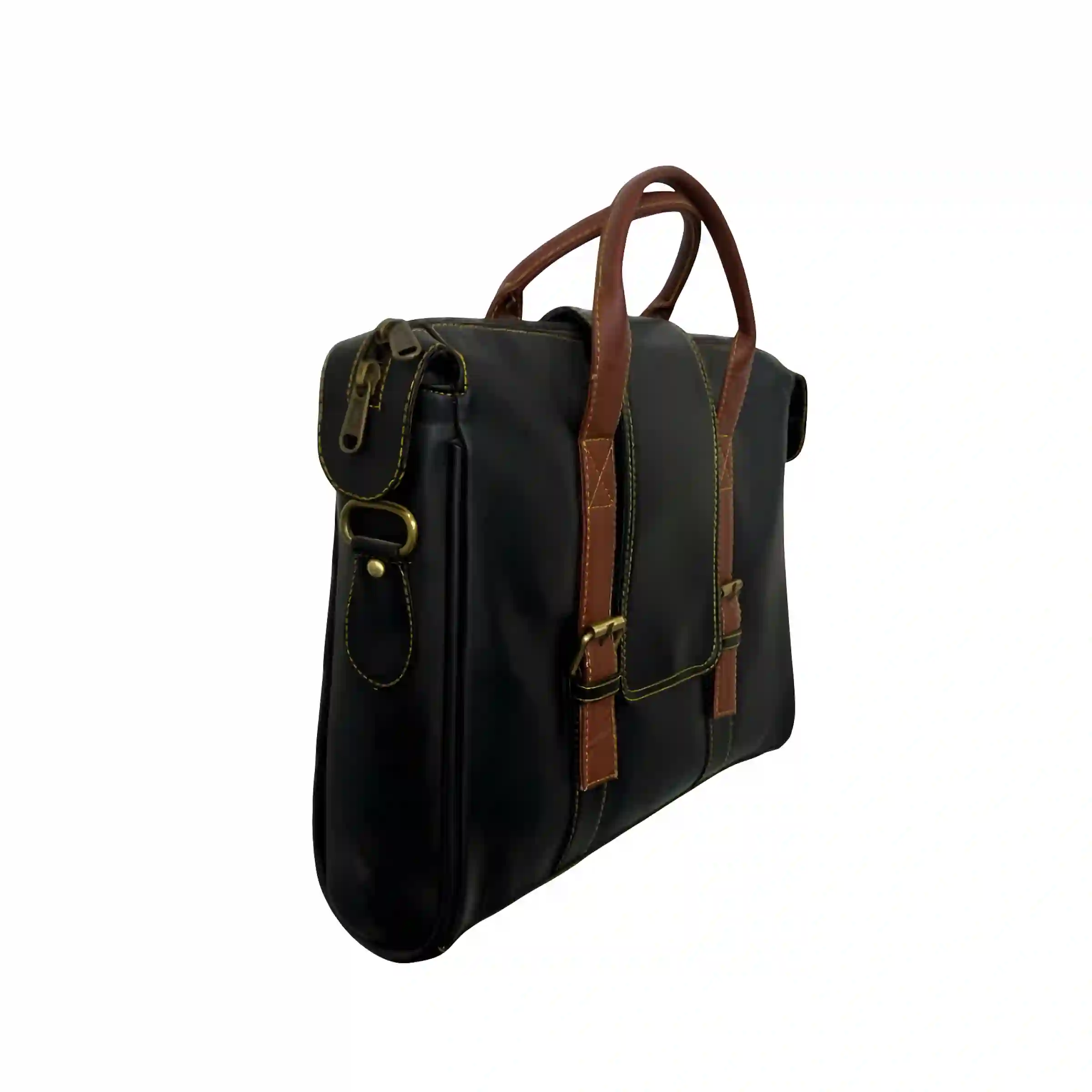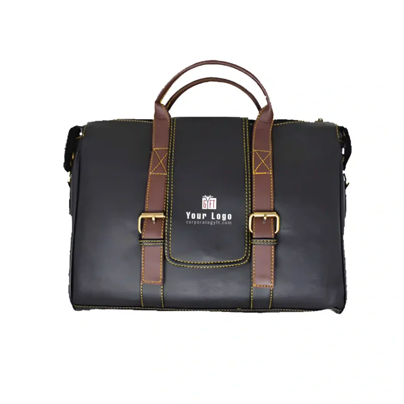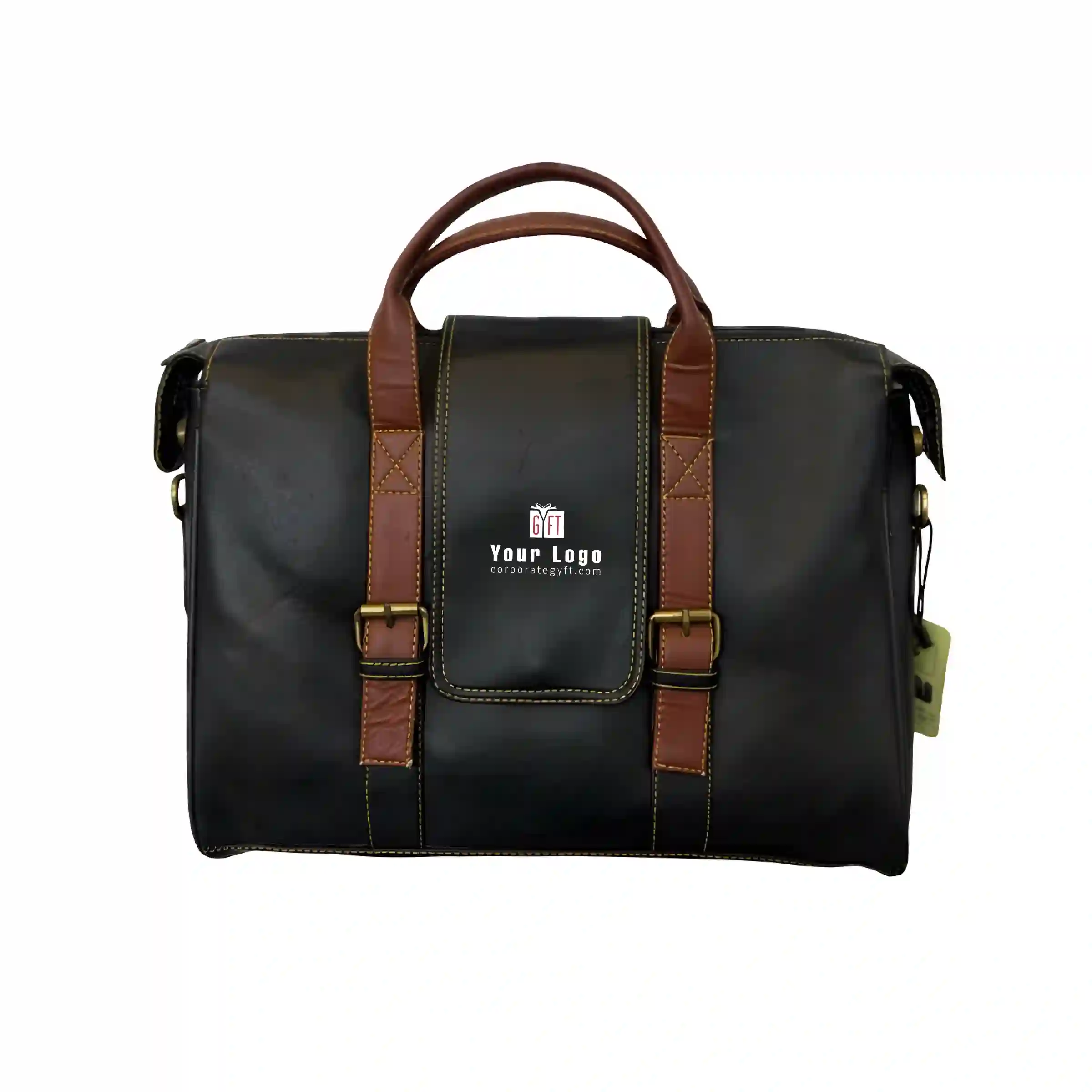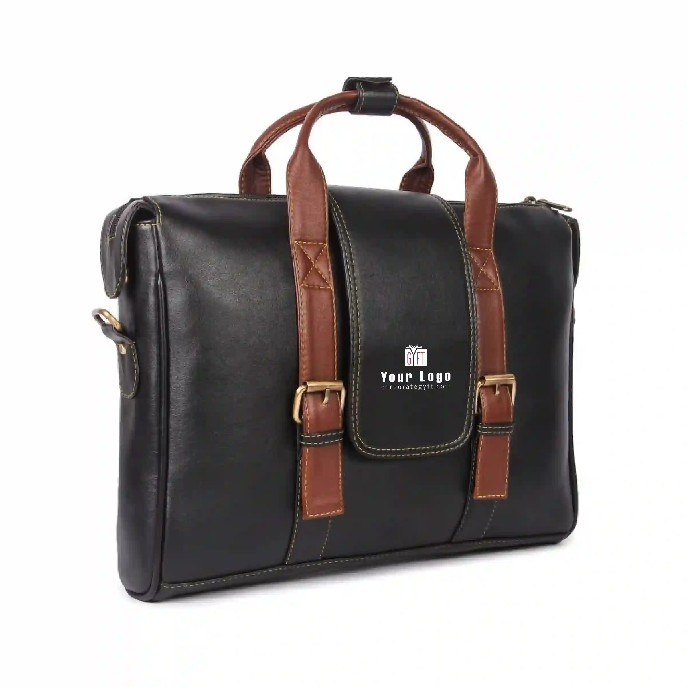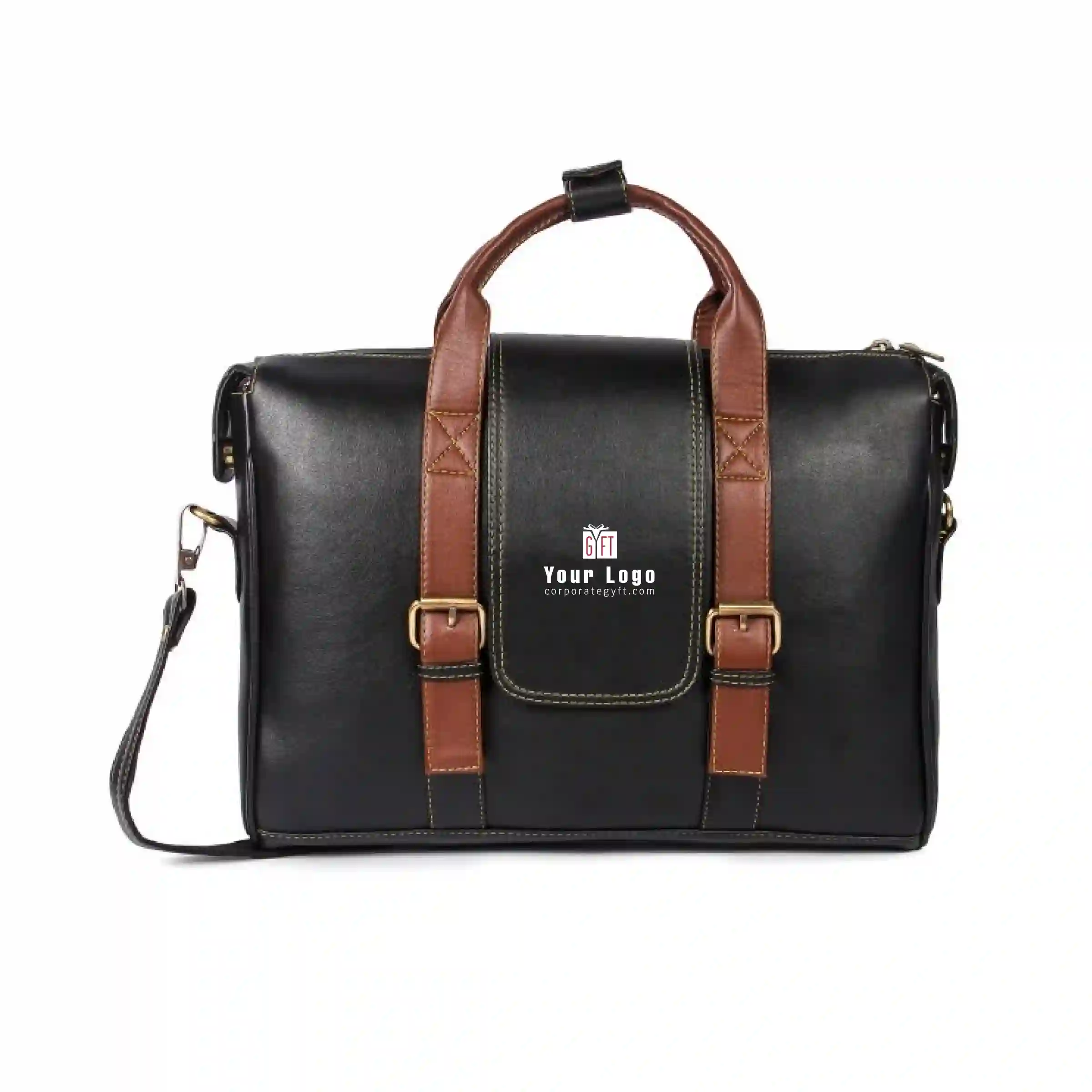 This executive bag is crafted from premium vegan leather, offering a sophisticated and ethical choice for professionals. It features a secure zippered main compartment and a cushioned sleeve that safely holds laptops up to 15.6 inches. Designed for convenience, it includes both sturdy carry handles and a removable, adjustable shoulder strap for versatile portability. Multiple internal pockets ensure all your documents and accessories stay neatly organized. This sleek bag is an ideal choice for daily office use, corporate gifting, or branding, with ample space for custom logo printing.