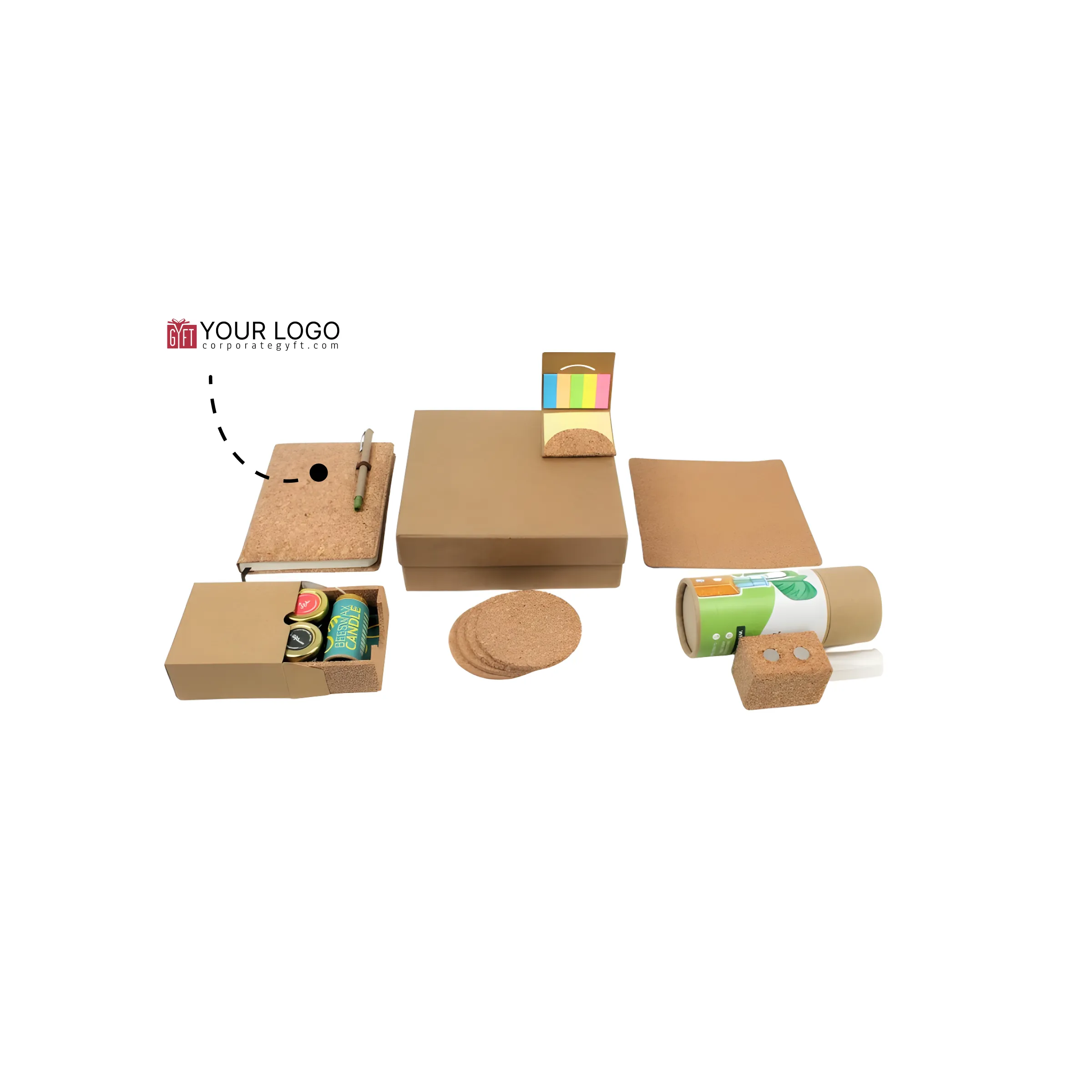 DE-1000 – eco-friendly cork gift hamper thoughtfully curated to deliver a premium yet sustainable gifting experience, combining everyday desk essentials with wellness-inspired elements for a balanced lifestyle. The hamper includes 3-inch cork sticky notes for quick reminders, a magnetic tube planter that adds a refreshing green touch, an Ozone executive eco pen for smooth writing, and plain cork coasters sized 98 × 5 mm that enhance desk aesthetics. A square cork mousepad measuring 7.7″ × 7.7″ and an A5 diary with 192 pages and an integrated pen holder support daily productivity, while the addition of two honey bottles paired with a beeswax candle in a mini tray brings a thoughtful wellness element to the set. All components are securely packed in a rigid brown box sized 23 × 23 × 8 cm, ensuring a sturdy and premium presentation. With space available for custom logo and design printing, this hamper is an ideal choice for eco-conscious promotions, corporate gifting, and festive giveaways where sustainability, utility, and brand visibility come together seamlessly.
