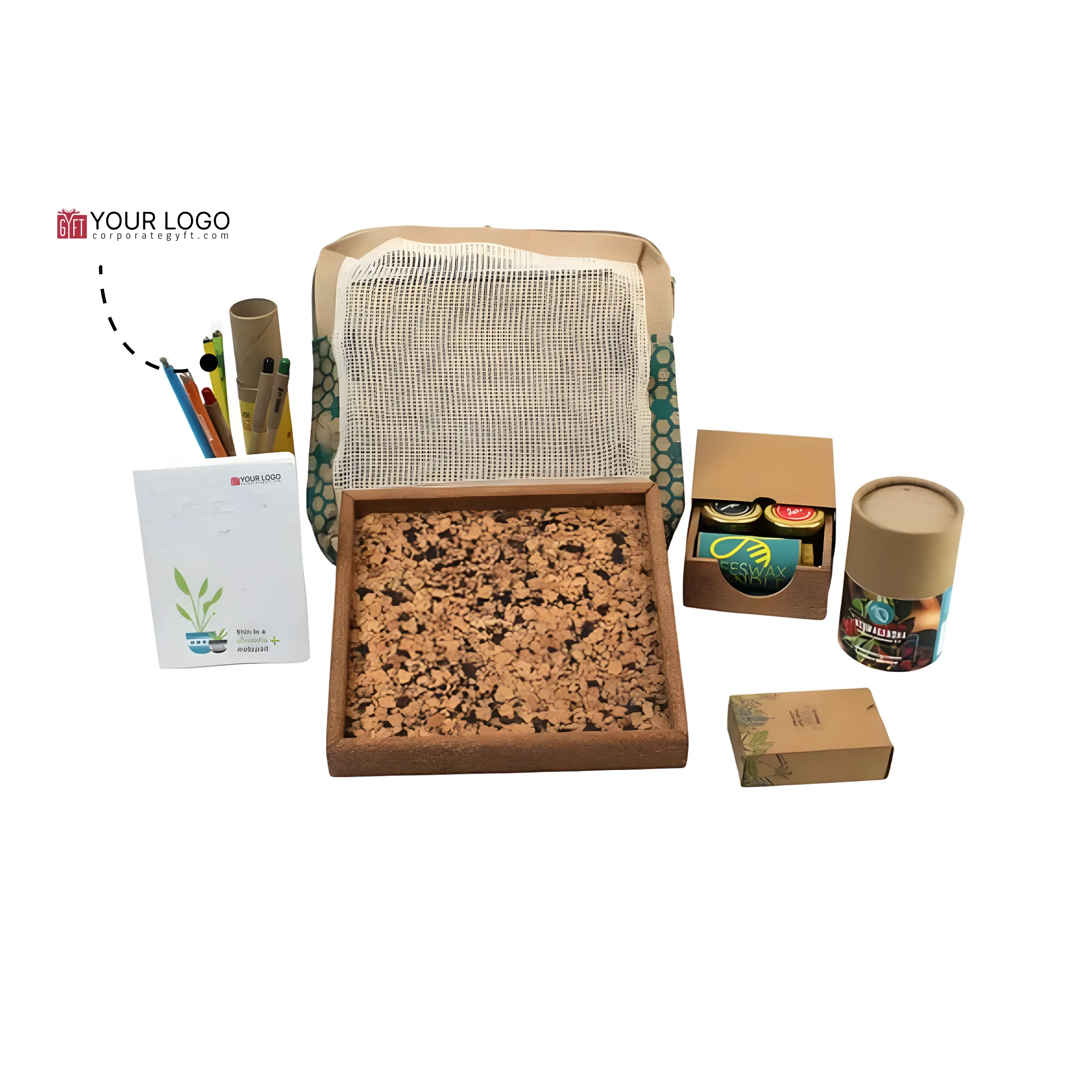 EC-48 – an eco-friendly gift set thoughtfully curated to celebrate sustainability while delivering a premium gifting experience, bringing together a full 9″ × 9″ cork tray that adds a natural and elegant base to the collection. The set includes eco-friendly playing cards for mindful entertainment, a mini grow-it-yourself kit with a round 2″ cocopot and peat to encourage simple planting, and a green memo pad sized 4″ × 6″ with 144 pages for everyday notes and ideas. Complementing the stationery elements are two honey bottles paired with a beeswax candle neatly placed in a mini tray, adding a warm and wellness-inspired touch. The Growmazing plantable pen and pencil set in a 4 + 4 combination reinforces conscious usage by extending value beyond writing. All elements are neatly packed in a premium 10″ × 10″ mega jute bag, ensuring a sturdy yet eco-conscious presentation. With space available for custom logo and design printing, this gift set is an ideal choice for festive gifting, corporate celebrations, and eco-conscious events where sustainability, utility and thoughtful presentation come together seamlessly.