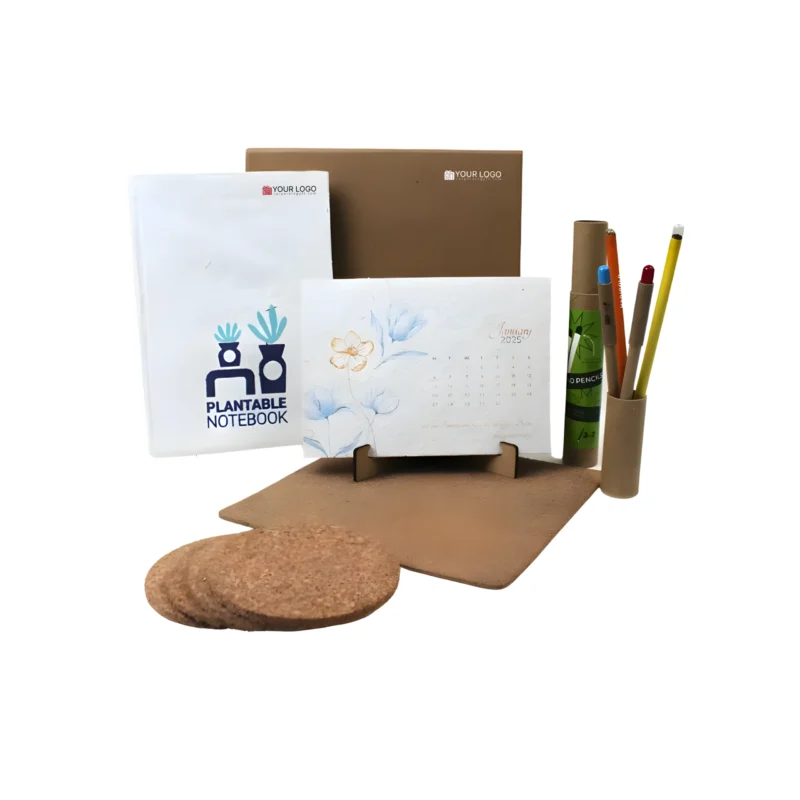 BG24-63 – Eco-friendly gift hamper designed to blend sustainability with everyday workplace essentials, curated with a thoughtful mix of functional and plantable products that promote conscious gifting and green values, featuring an A5 diary with 192 pages for daily planning, a plantable calendar sized 5″ × 7″ supported by an MDF stand, cork coasters in a set of 4 sized 98 × 5 mm, a cork square mousepad measuring 7.7″ × 7.7″, and a plantable pen and pencil set in a 2 + 2 combination, all neatly organized and securely packed inside a rigid brown box sized 23 × 23 × 8 cm, offering space for custom logo and design printing to enhance brand visibility, making it an ideal choice for corporate gifting, employee kits and eco-friendly workspaces focused on sustainability and mindful living.