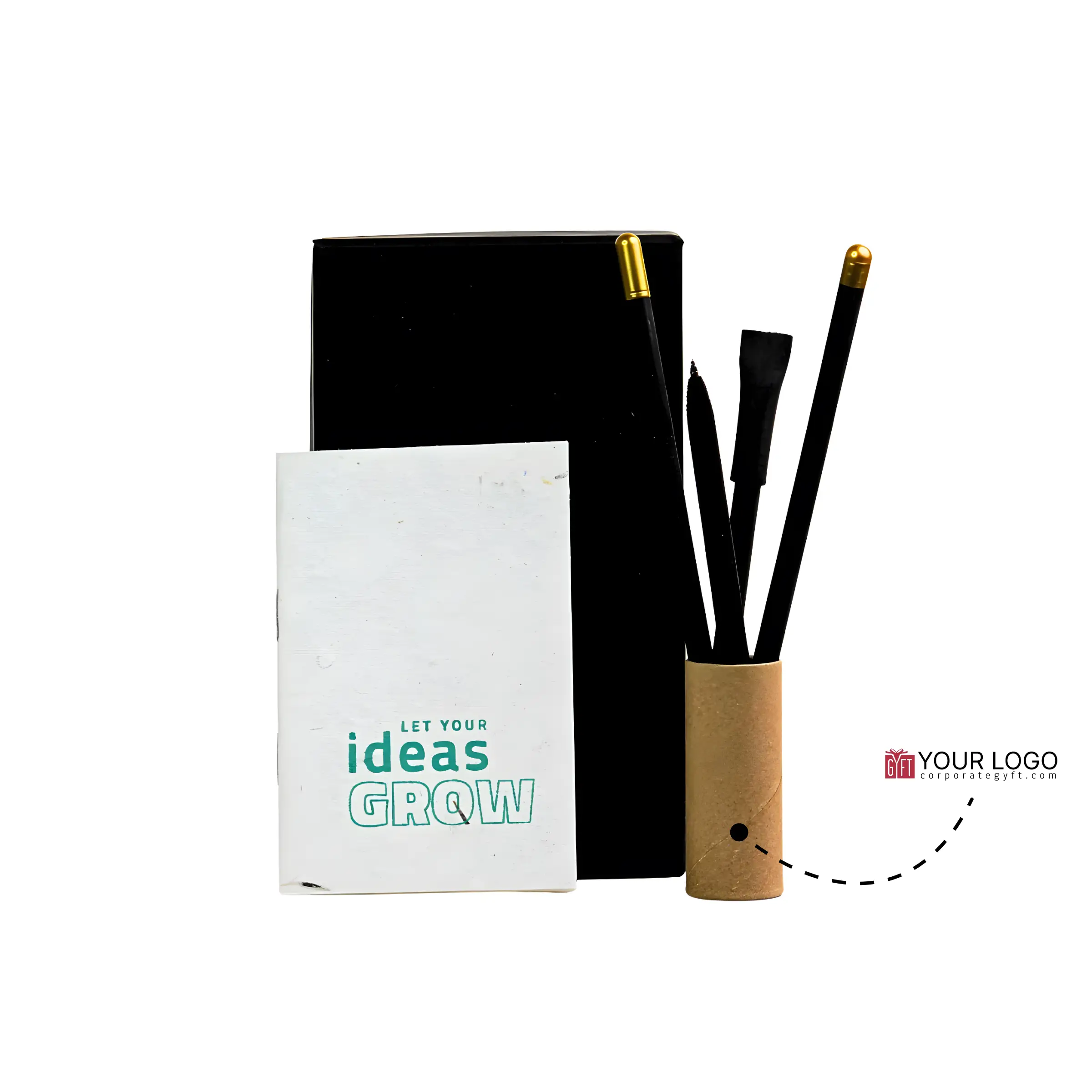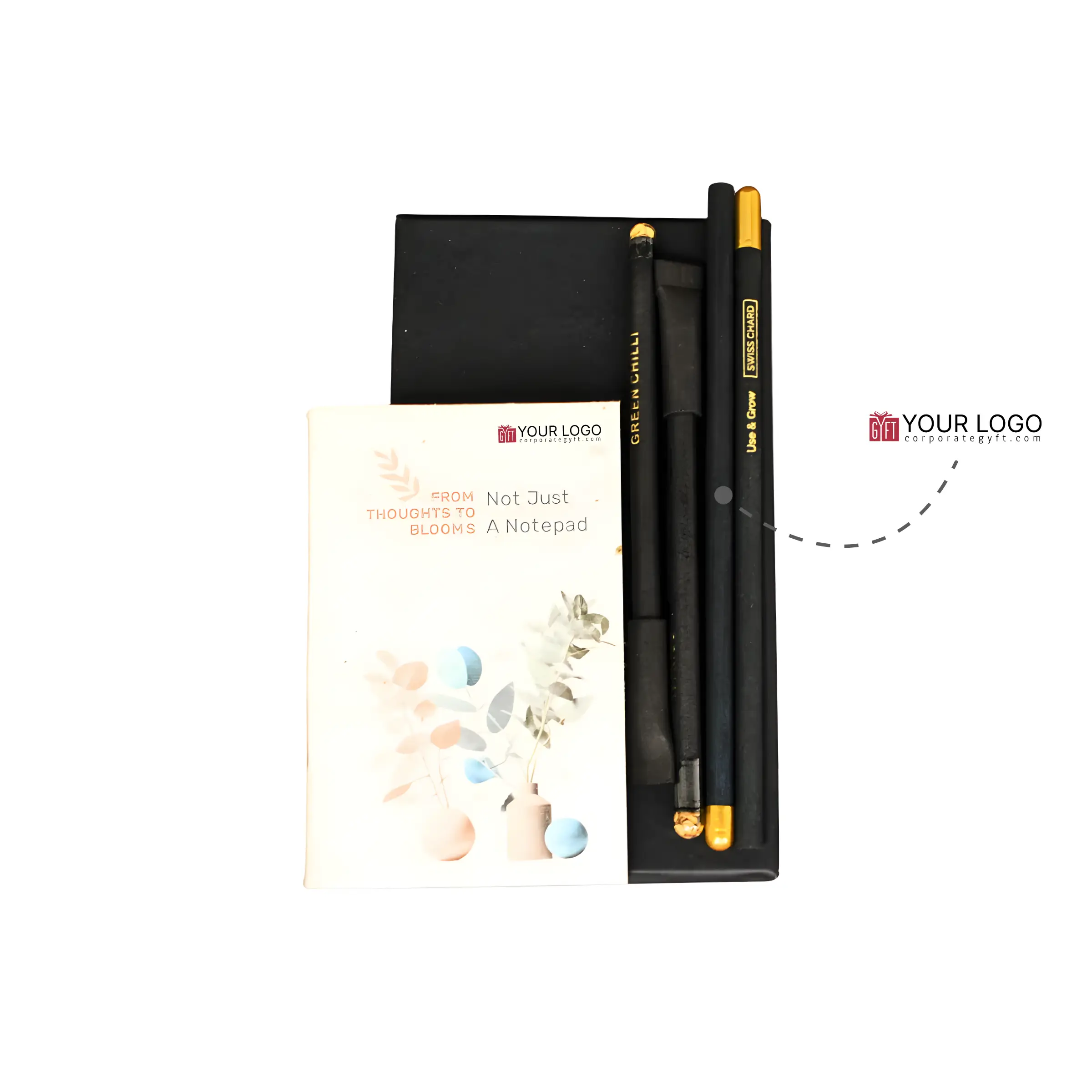 GZ33-2 – Eco-friendly gift set thoughtfully curated to support sustainable everyday use and impactful corporate gifting, featuring a compact 3.5″ × 5″ plantable notepad with 40 center pin–bound pages that encourages conscious writing habits while reducing environmental impact. The set includes two Growmazing paper pens in black and two plantable seed pencils with black bodies and gold capsules, reinforcing a mindful stationery experience that continues even after use through planting. Neatly packed in a pocket black hardboard box, the gift set offers a sleek, premium presentation suitable for professional environments. With space available for custom logo and design printing, it serves as an ideal choice for corporate gifting, employee onboarding, and event giveaways where sustainability, practicality, and brand visibility come together seamlessly.