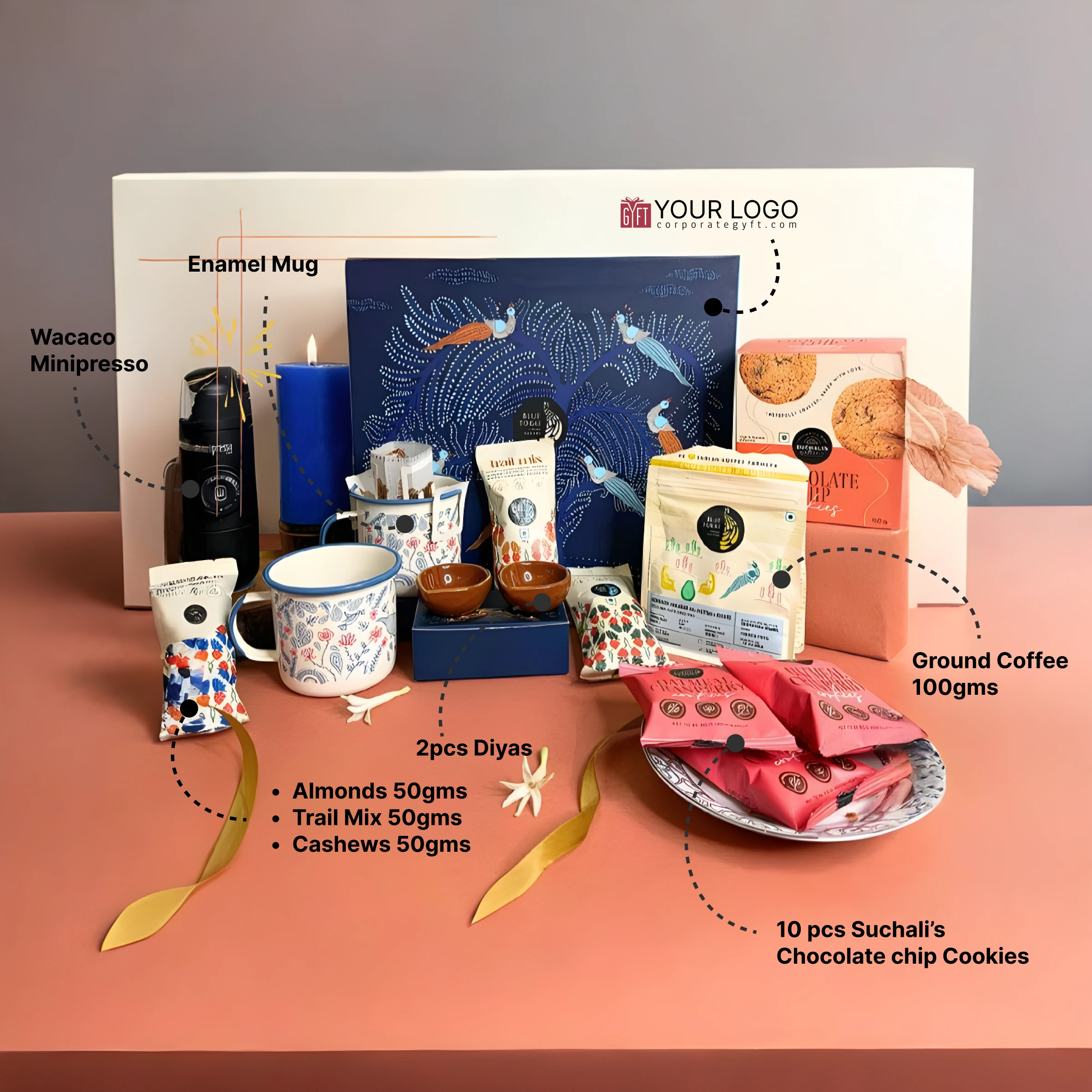 Make Diwali special with a thoughtfully curated hamper blending smart coffee brewing and gourmet treats. It features the Wacaco Minipresso, artisanal cookies, premium ground coffee, dry fruits, and a set of enamel mugs for a complete beverage experience. The decorative diyas add a warm festive glow to any home. Packaged in an elegant premium gift box with space for personalized branding, this hamper is perfect for gifting to friends, family, employees, and clients, making celebrations memorable.