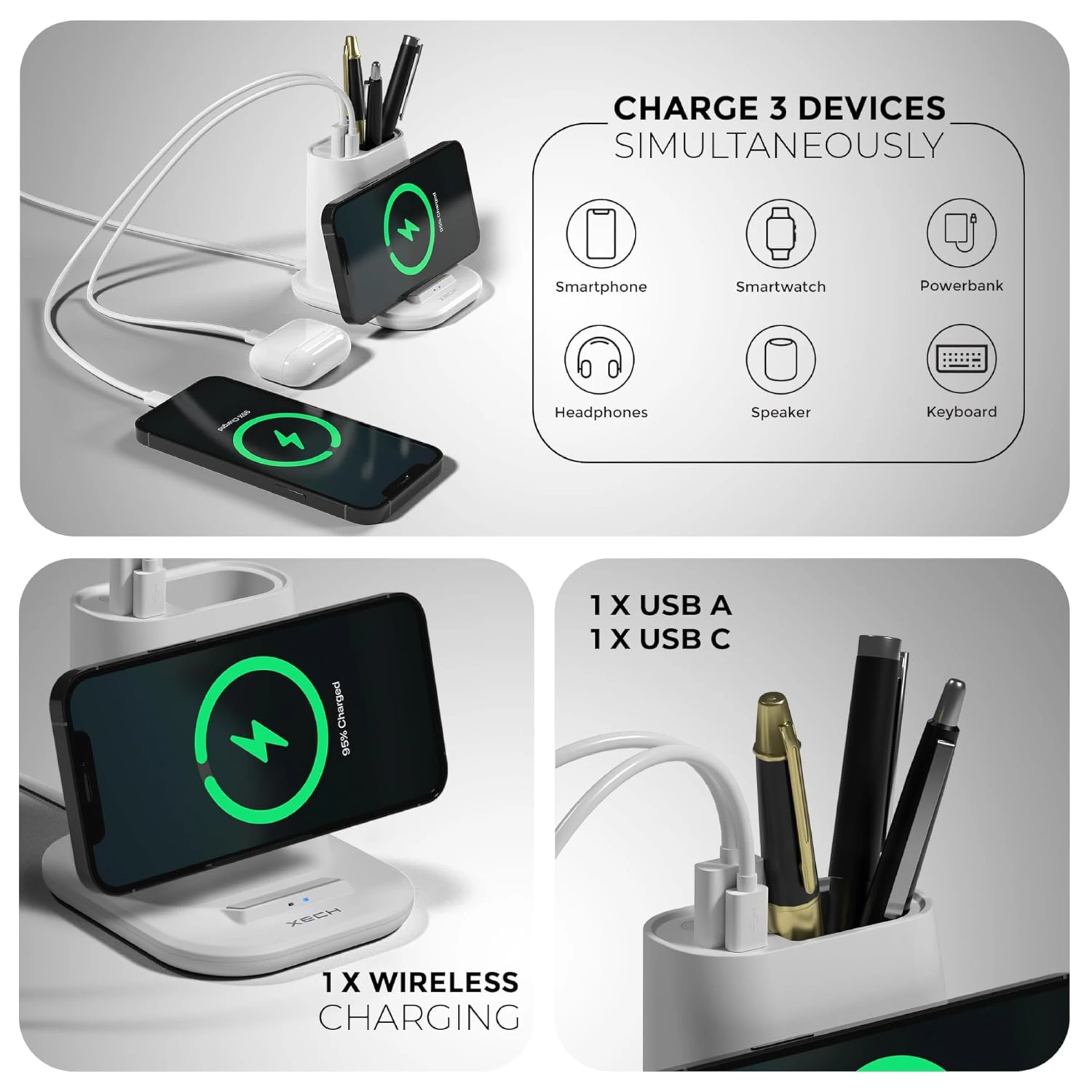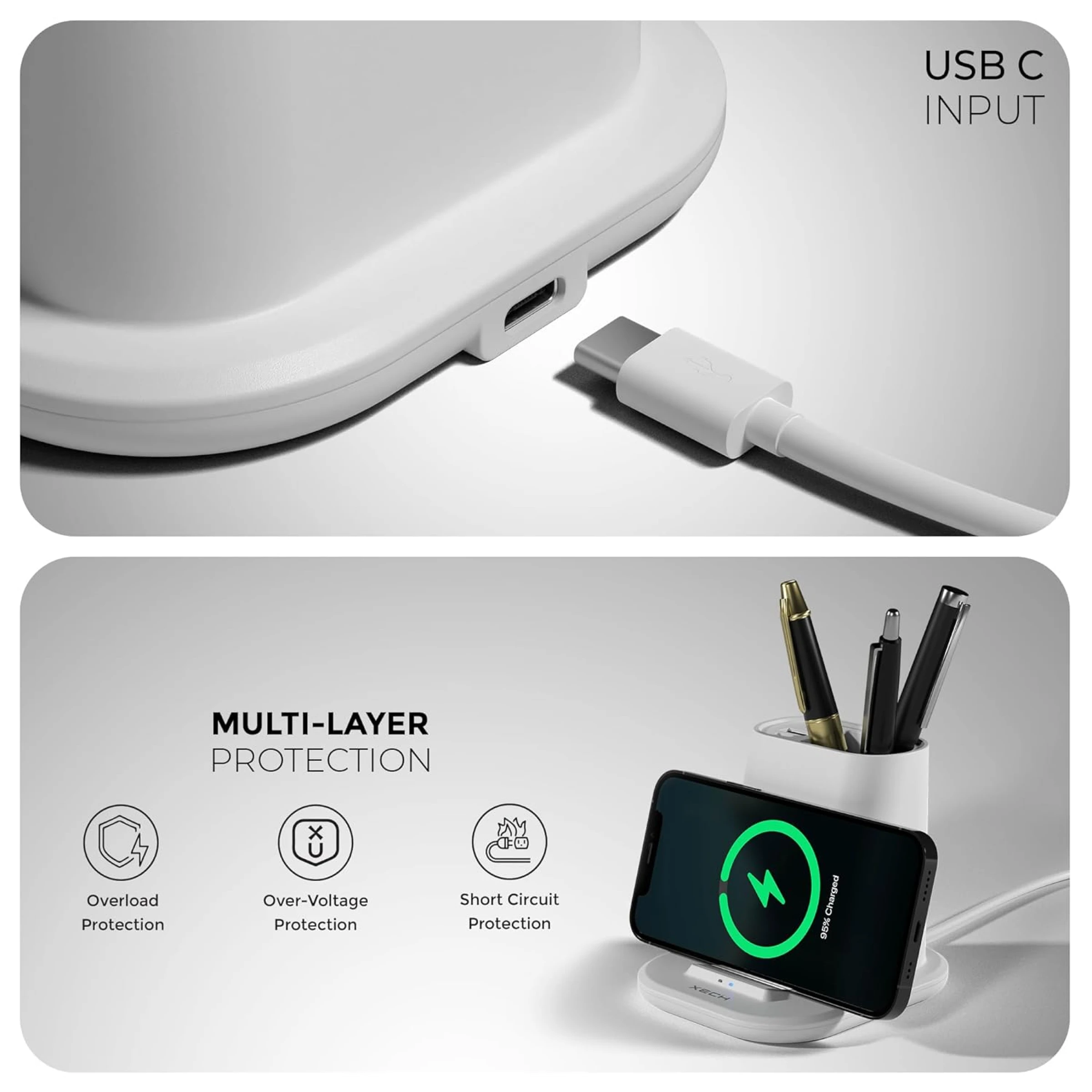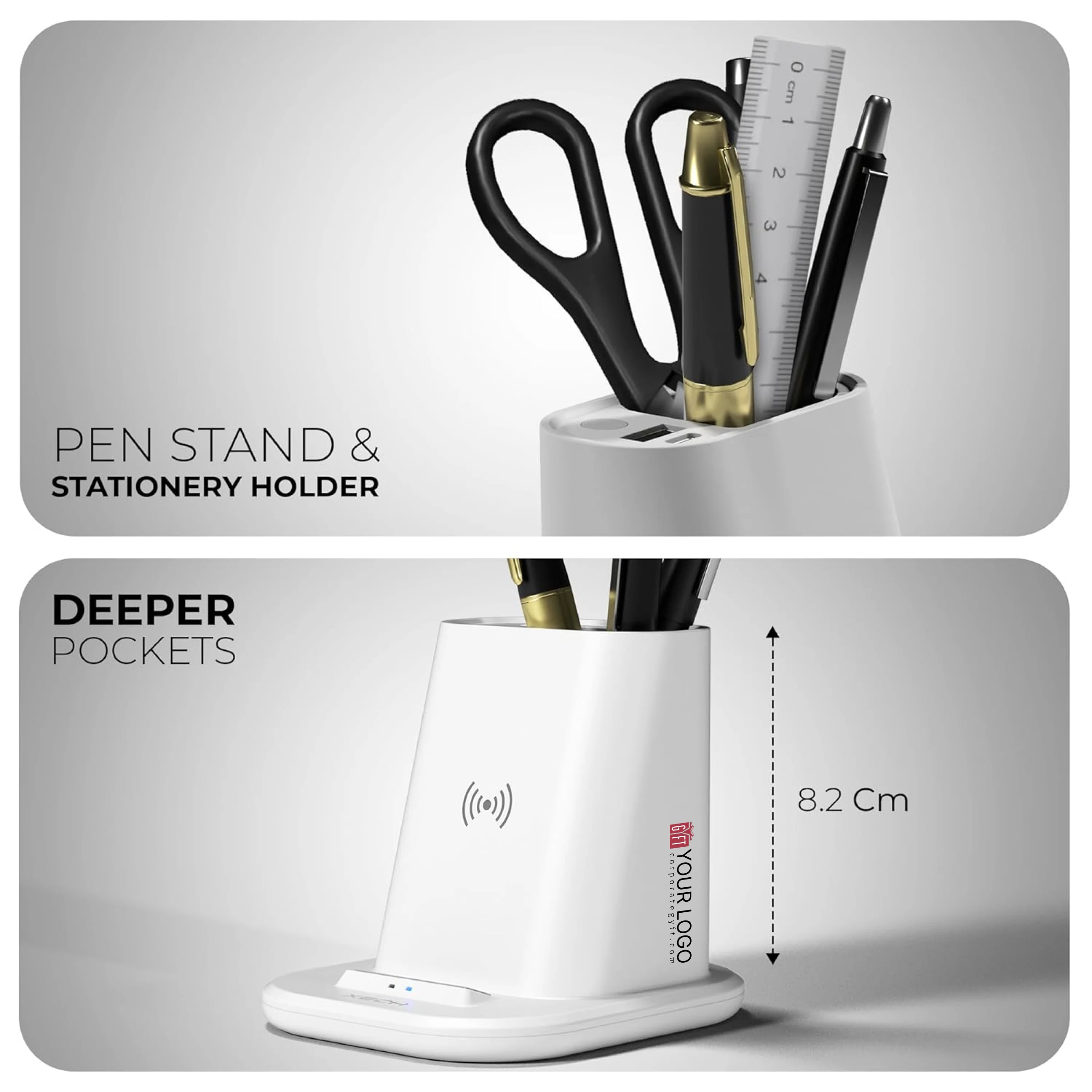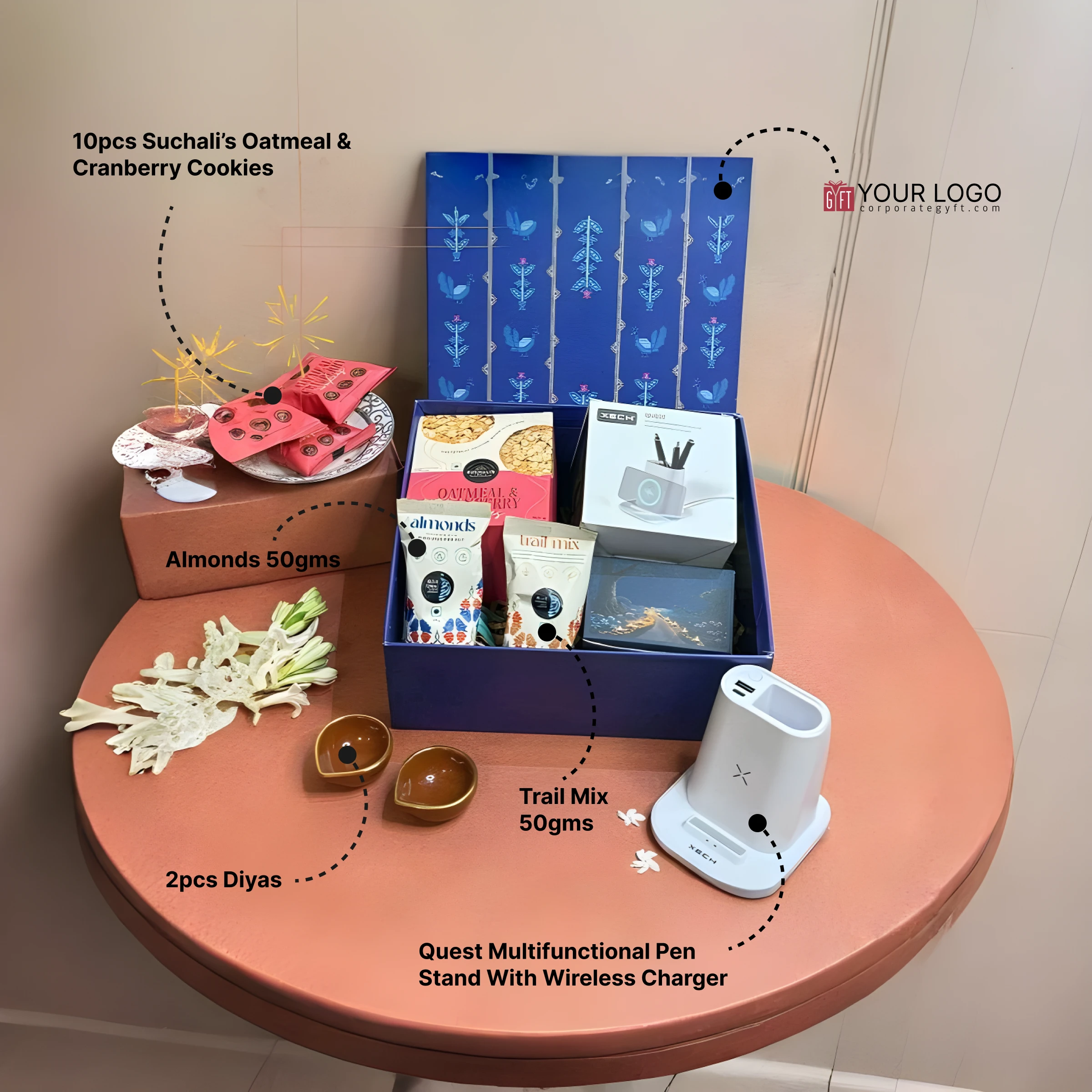 This festive gift hamper is a perfect blend of utility and indulgence, ideal for Diwali or corporate gifting. It features the Quest multifunctional pen stand with a 15W wireless charger and USB-A and USB-C ports, allowing convenient charging of multiple devices. The hamper also includes 10 pieces of Suchali’s oatmeal & cranberry cookies, a 50 gms pack of almonds, a 50 gms pack of trail mix, and 2 traditional diyas for a festive touch. Neatly arranged in a premium gift box with space for custom logo placement, this hamper makes a thoughtful gift for clients, employees, or loved ones.