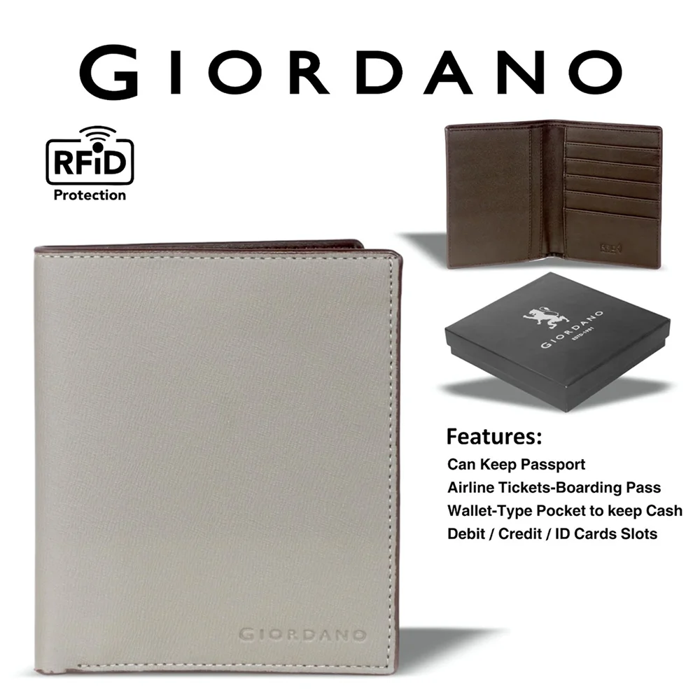 Travel with style and security using the Giordano passport cover with RFID protection. Crafted with a smooth textured finish, it keeps your passport, tickets, cards, and cash organized in one place. The slim design ensures easy portability, while RFID protection safeguards your sensitive data. Packed in a premium gift box, it makes a thoughtful choice for travellers and gifting occasions alike.