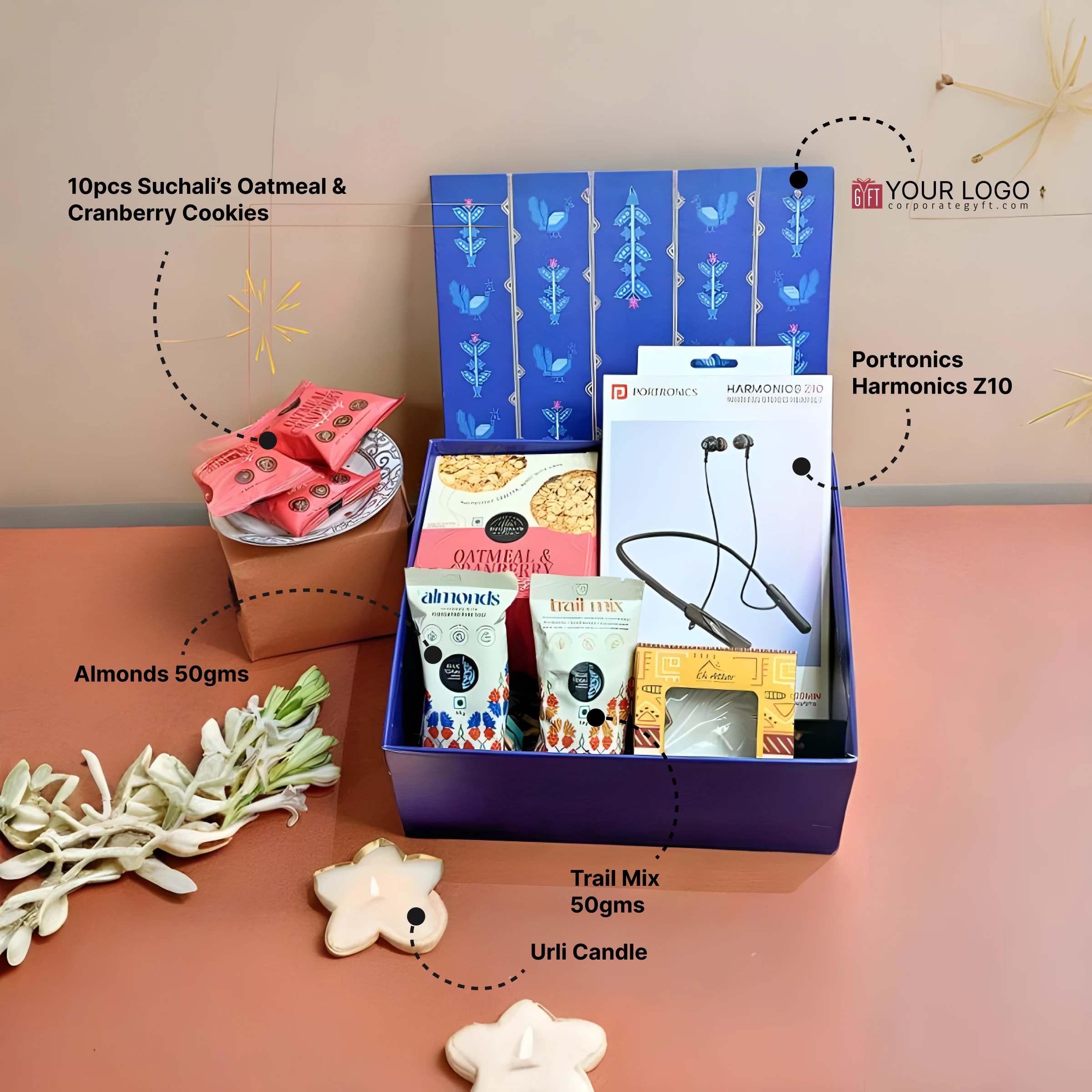This festive gift hamper is a perfect blend of gourmet treats and thoughtful gifting essentials, ideal for Diwali, corporate gifting, or special occasions. It features Portronics Harmonics Twins S13 true wireless earbuds for superior sound, alongside 10 pieces of freshly baked Suchali’s oatmeal and cranberry cookies. The hamper also includes 50 gms of almonds, 50 gms of trail mix, and a beautifully crafted Urli candle to add a festive touch. Neatly arranged in a premium gift box, this hamper is both elegant and practical, making it an ideal gift for clients, employees, or lifestyle enthusiasts.