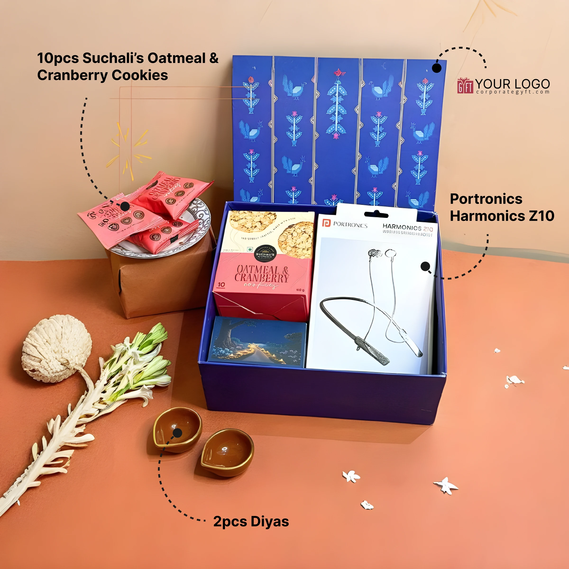 This festive gift hamper is a perfect blend of indulgence and utility, ideal for Diwali or corporate gifting. It features the Portronics harmonics Z10 wireless headset with a neckband design, offering up to 35 hours of playback, clear sound, and water-resistant durability. The hamper also includes a pack of 10 artisanal Suchali oatmeal & cranberry cookies, providing a healthy and gourmet snacking option. Two traditional clay diyas add a decorative and festive touch. Neatly packaged in a premium gift hamper with space for custom logo placement, it is perfect for corporate gifting, client appreciation, or festive celebrations.