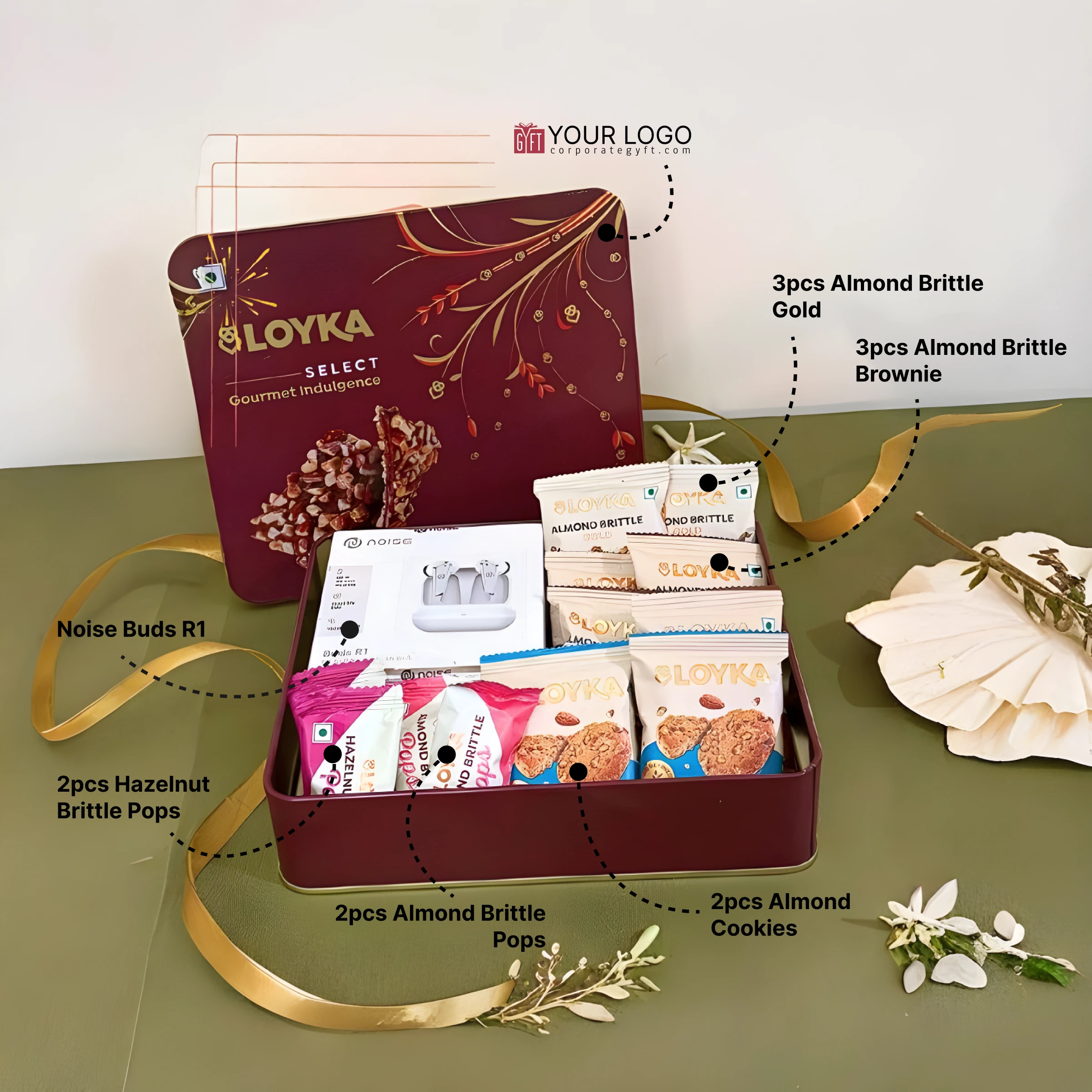 Celebrate Diwali with a thoughtfully curated hamper that blends modern technology and rich indulgence. Featuring Noise buds R1 wireless earbuds along with an assortment of Loyka brittles, cookies, and pops, this hamper brings together utility and festive flavors in perfect harmony. Elegantly packaged in a premium gift box with options for personalized branding, it makes an ideal choice for corporate gifting, employee rewards, client appreciation, or sharing festive joy with loved ones.