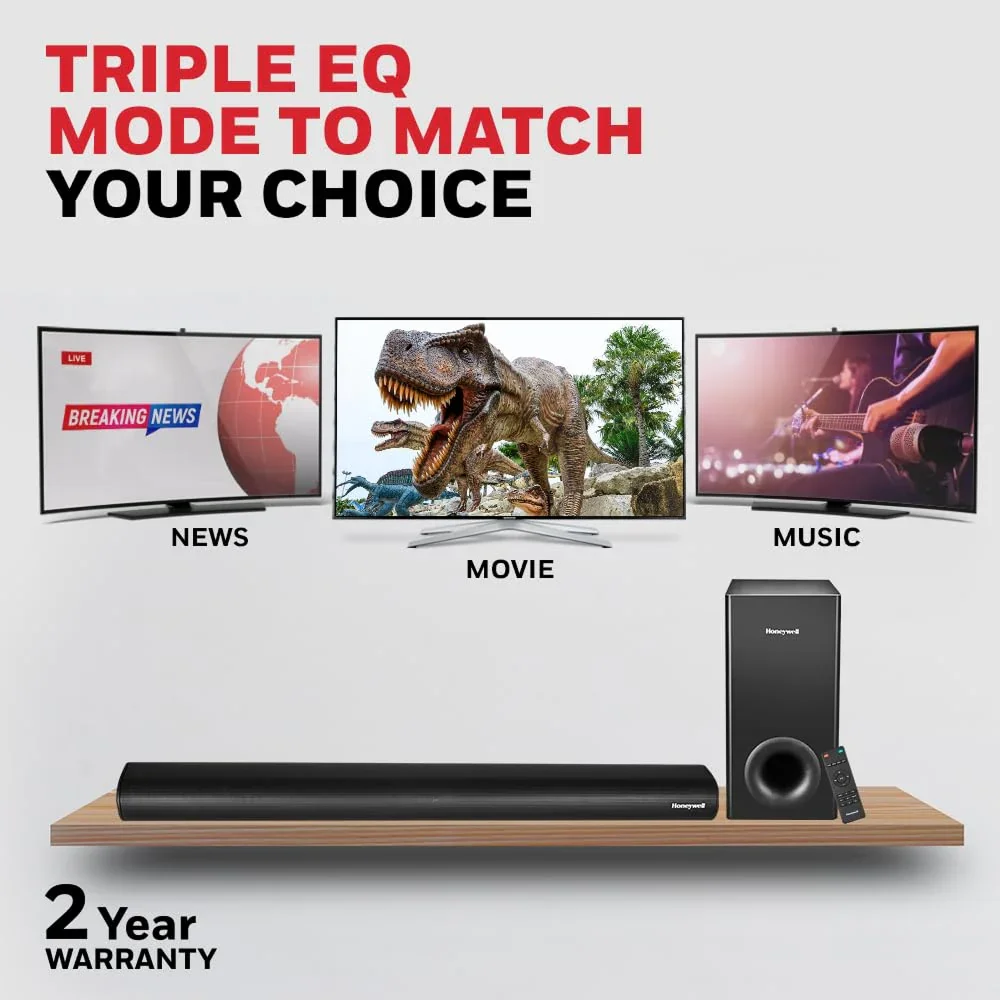 Experience powerful, cinema-like audio with the Honeywell Trueno U3000 Soundbar, delivering 160 W output through four 57.15 mm soundbar drivers and a robust 165.1 mm subwoofer for deep, immersive bass. Enjoy seamless wireless streaming via Bluetooth V5.0+EDR up to 10 m, or use multiple play modes including AUX, USB, Optical, and HDMI ARC for versatile connectivity. Compatible with smartphones, PCs, tablets, and TVs, it comes with a user-friendly remote control for effortless operation. The sleek black glossy minimalist design enhances any room decor while offering high-performance sound. Perfect for home theatre, gaming, movies, music, parties, office use, and corporate gifting, the Trueno U3000 delivers style, convenience, and premium audio in one compact unit.