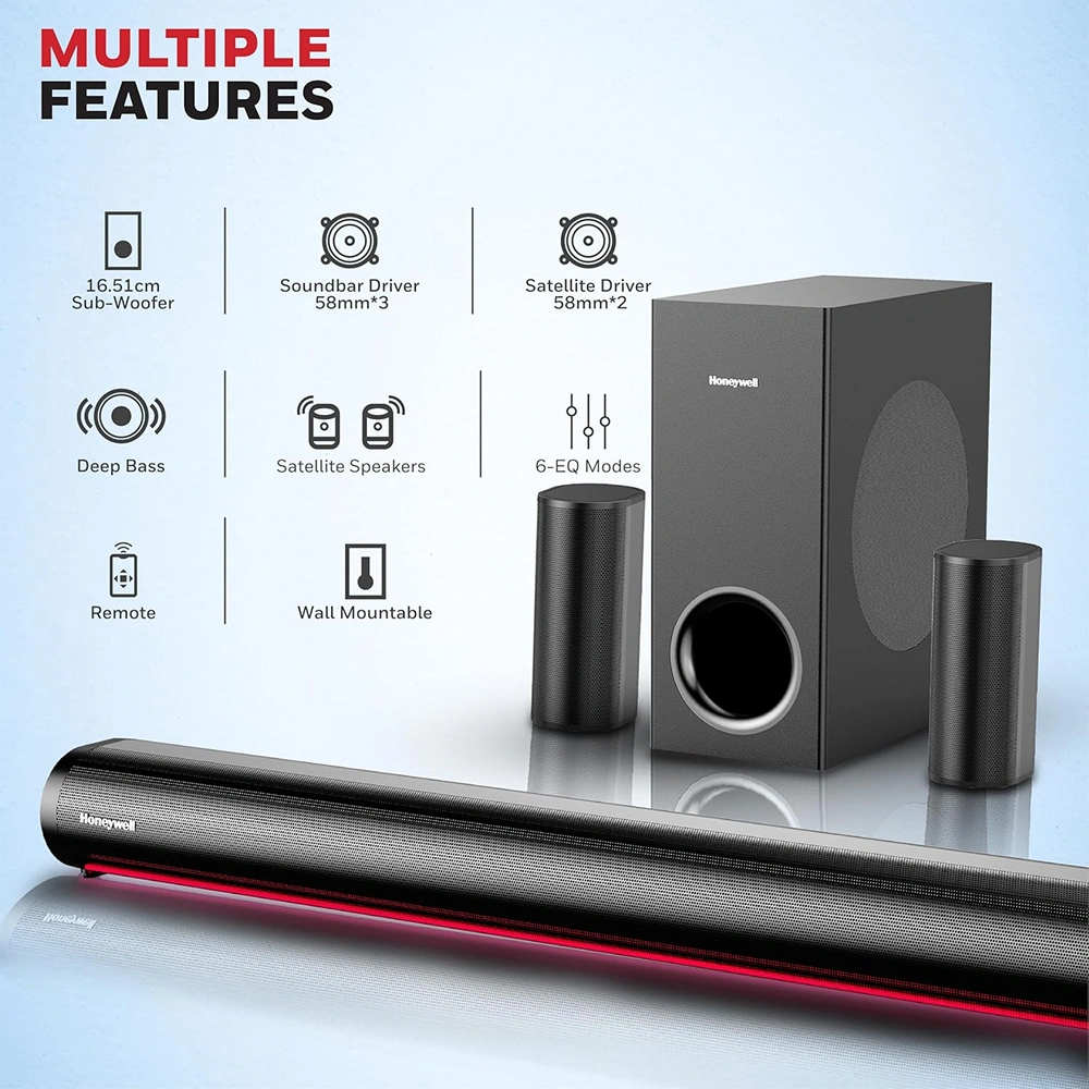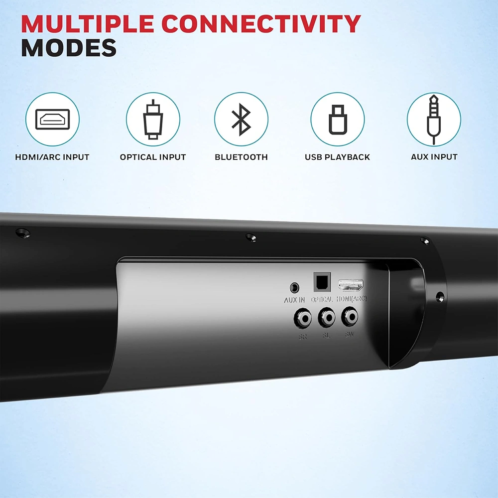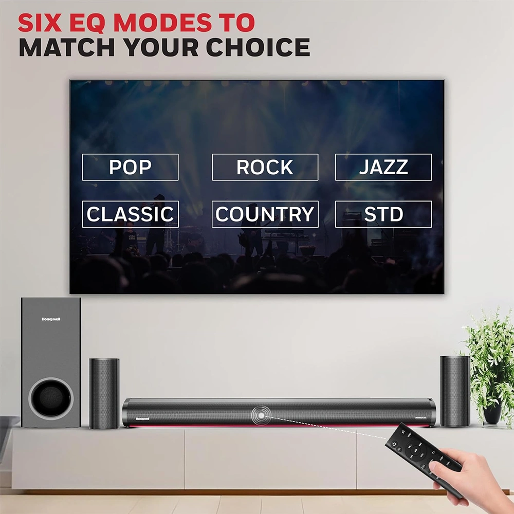 The ultimate series soundbar engineered for immersive home entertainment delivers powerful 500 W output power through a 5.1 channel surround system, creating a cinematic audio environment for movies, gaming, and music sessions. Dolby audio tuning, combined with true 3D surround sound, enhances clarity and depth across rooms. precision tuned 58 mm soundbar drivers paired with dual 58 mm satellite drivers ensure balanced sound distribution, while the dedicated subwoofer with 165.10 mm driver produces deep impactful bass, Bluetooth v5.3 plus EDR enables stable wireless audio streaming up to 10 m range, multiple play modes via Bluetooth, AUX, USB, Optical, HDMI ARC offer flexible connectivity across devices, six EQ modes including POP, ROCK, JAZZ, CLASSIC, COUNTRY, STD allow sound customization based on content preference, user friendly remote control simplifies daily operation, premium black glossy minimalist finish adds a refined aesthetic suitable for modern interiors, thoughtfully designed with space available for custom logo plus design printing, ideal for home theatres, living rooms, gaming setups and premium entertainment spaces.