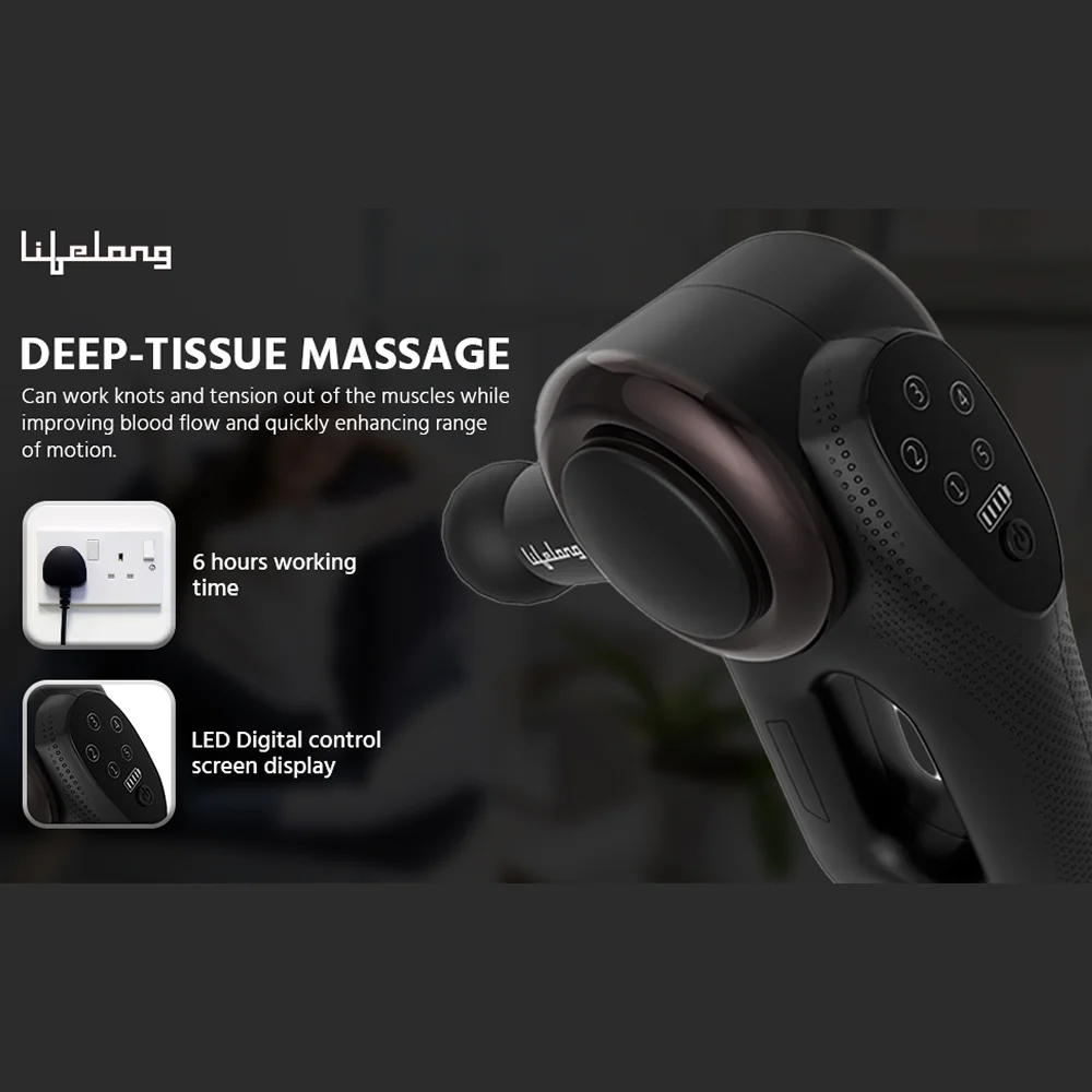 The Lifelong wireless gun massager is designed to deliver deep tissue relief with powerful percussive therapy. Crafted from premium, skin-safe material, it offers a soft, non-slip grip for comfortable use. With 7 detachable attachments, it targets multiple muscle groups effectively. Its cordless and lightweight design ensures easy handling and portability. The hot and cold heads add versatile therapy options for faster recovery. Ideal for athletes, professionals, and home use, it helps relieve pain, ease tension, and boost blood circulation. Perfect for daily relaxation and gifting.