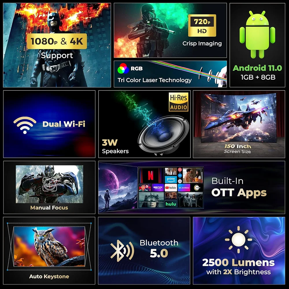 - Display: 1920 × 1080 Full HD, 720P Native, Up to 120 inch