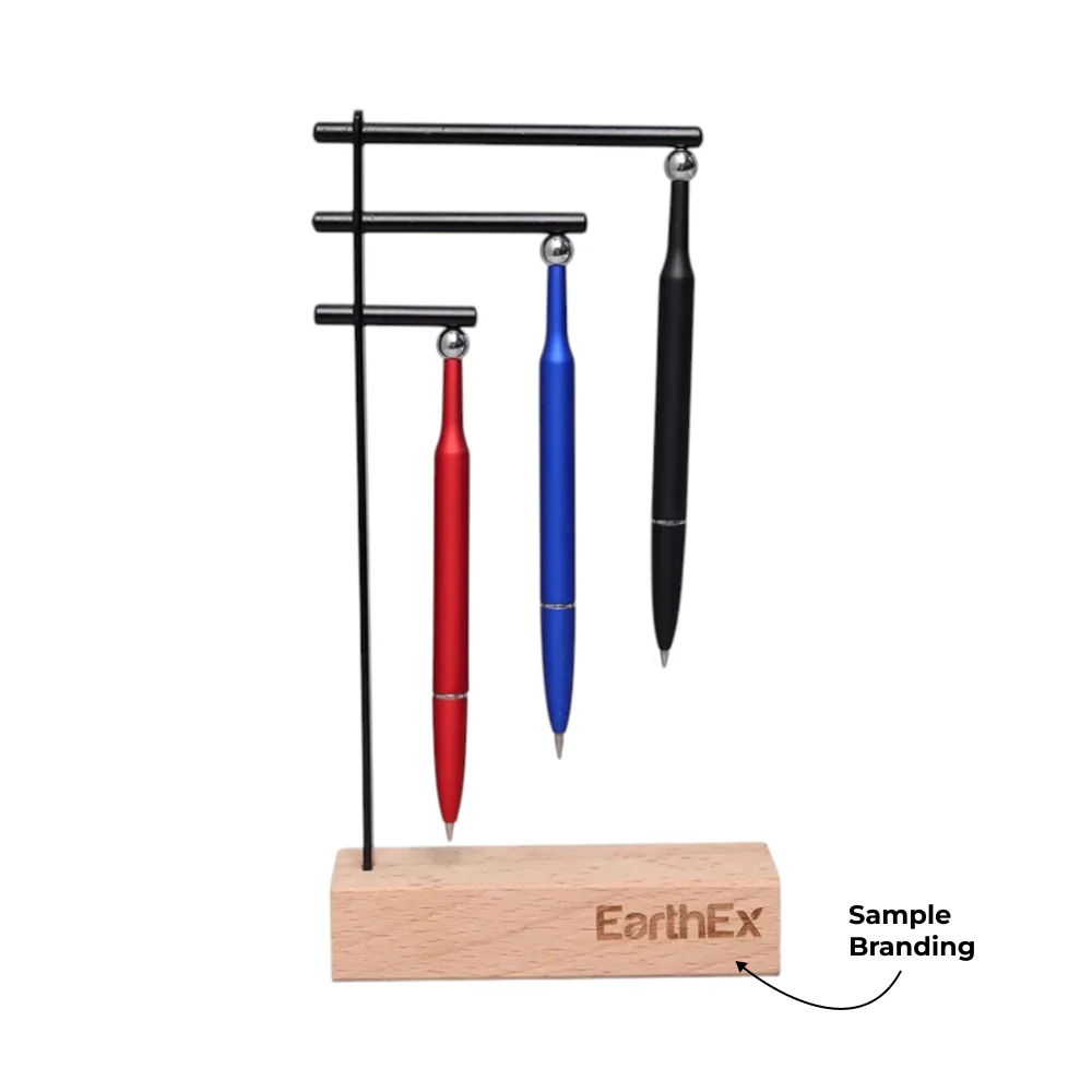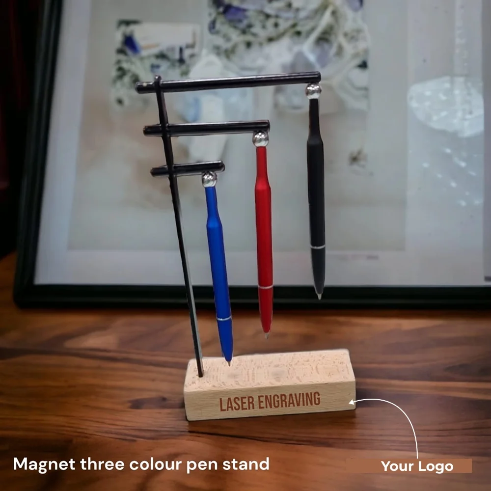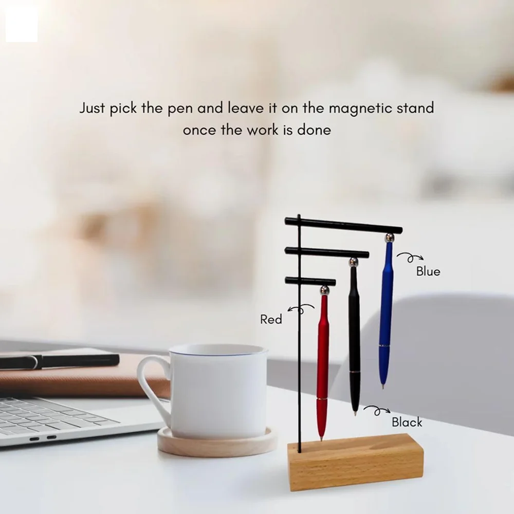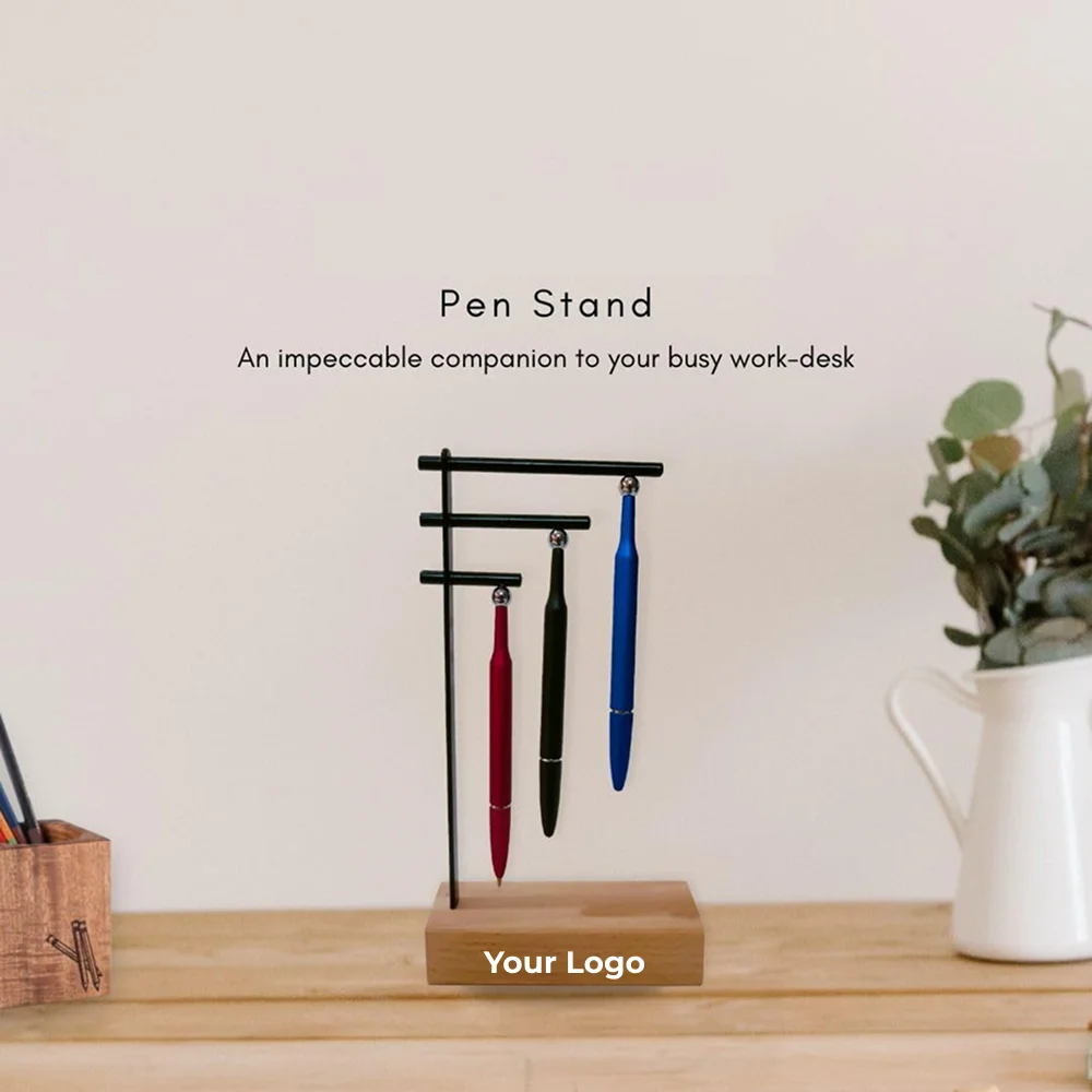 Designed for elegance and utility, this pen stand combines a sturdy metal frame with a polished wooden base to elevate any executive desk. The magnetic holding mechanism ensures your pen is always within reach, while the compact size fits seamlessly into professional settings. Available in blue, red, and black, it offers ample branding space—perfect for client gifting, premium giveaways, and executive workstations.