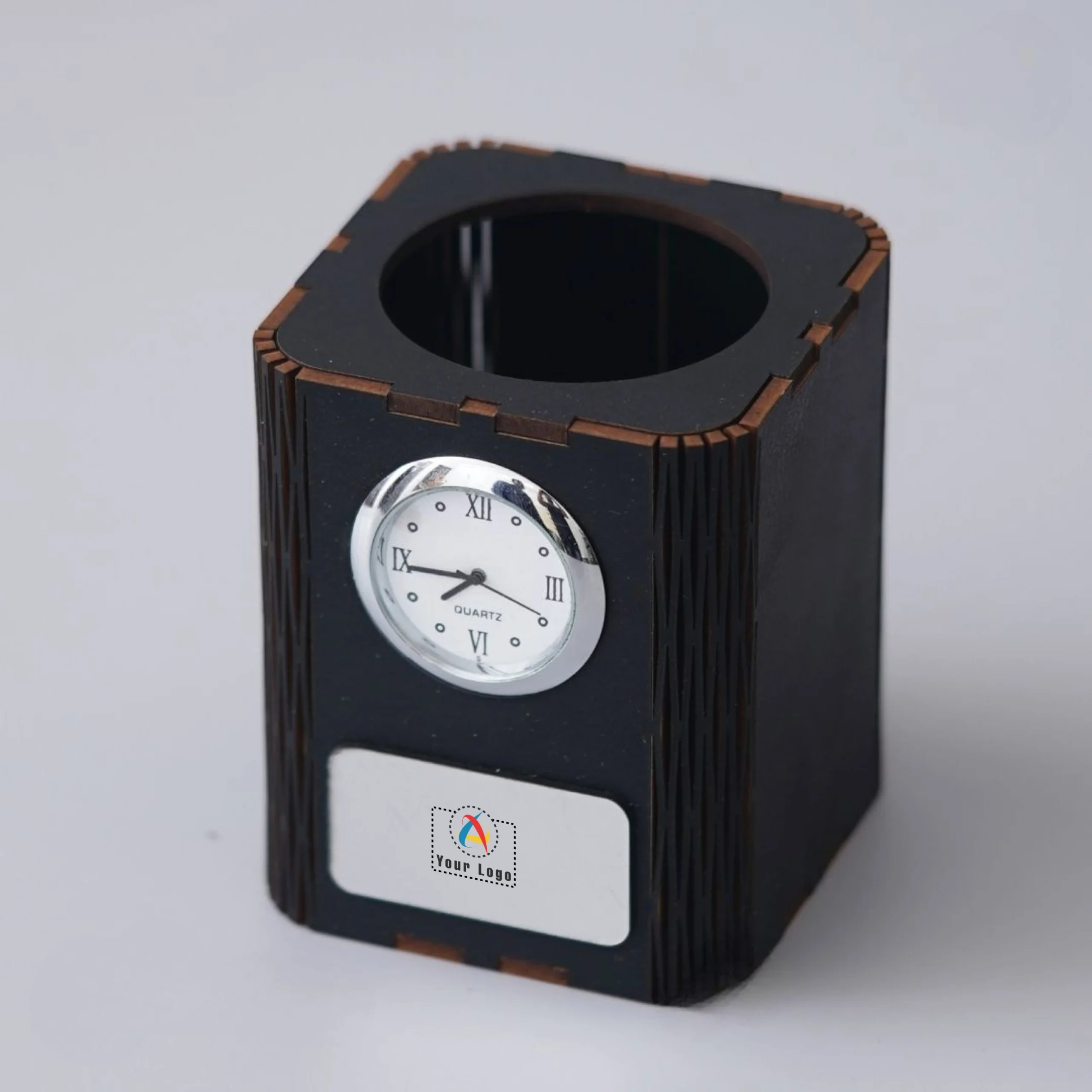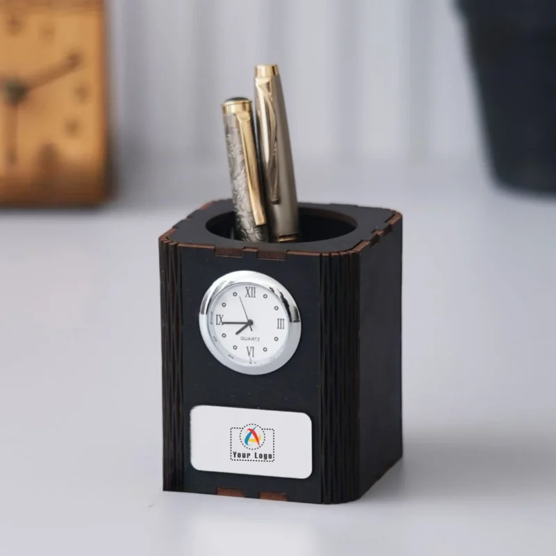 Compact MDF pen stand integrated with a clock, ideal for keeping desks tidy while adding a touch of utility. Lightweight yet durable, this piece is perfect for office desks, employee onboarding, and promotional gifting where lasting visibility of your brand matters.