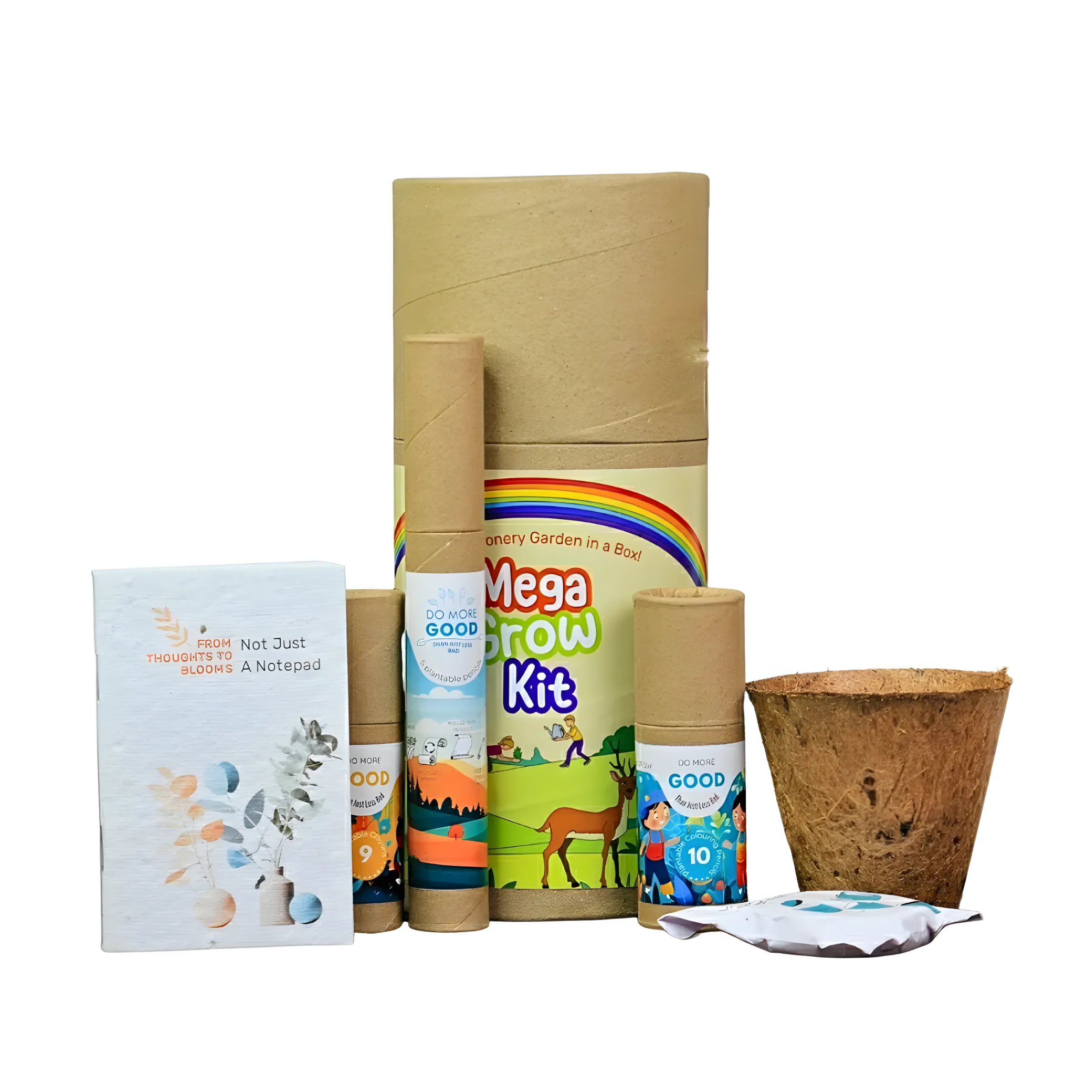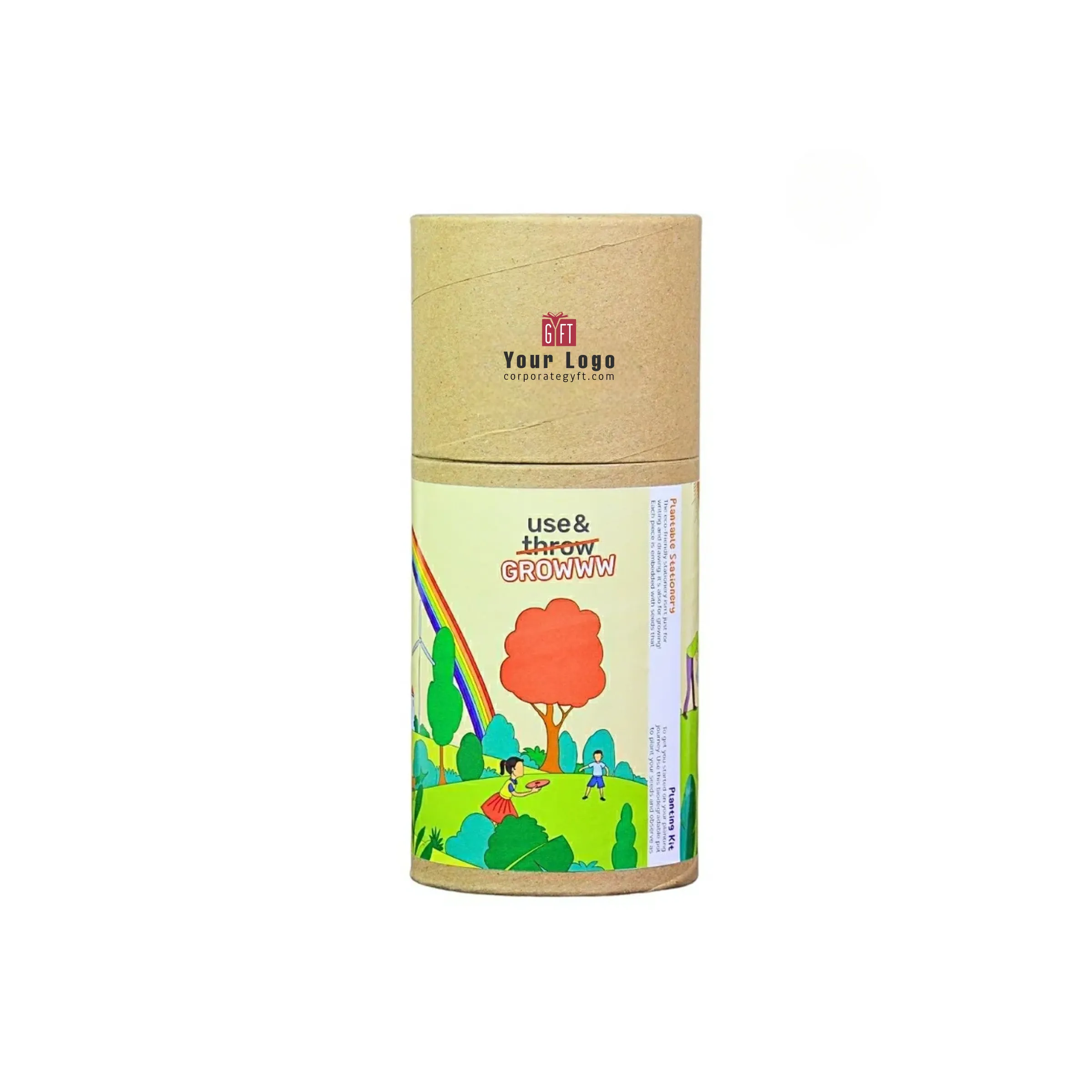 KC35-C – plantable stationery kit thoughtfully curated for eco conscious learning combines creativity with sustainability by featuring a compact recycled paper tube sized 4″ × 10″ that neatly houses a 3.5″ × 5″ notepad designed with 40 pages and center pin binding for smooth writing, along with a set of 5 pencils for everyday use, a pack of 9 crayons to encourage artistic expression, a 3″ cocopot with cocopeat to introduce hands on planting activities, and a pack of 10 mini colouring seed pencils that blend fun with environmental awareness, all supported by space for custom logo and design printing to enhance brand visibility, making the kit suitable for kids’ eco activity kits, nature learning programs and sustainable gifting.