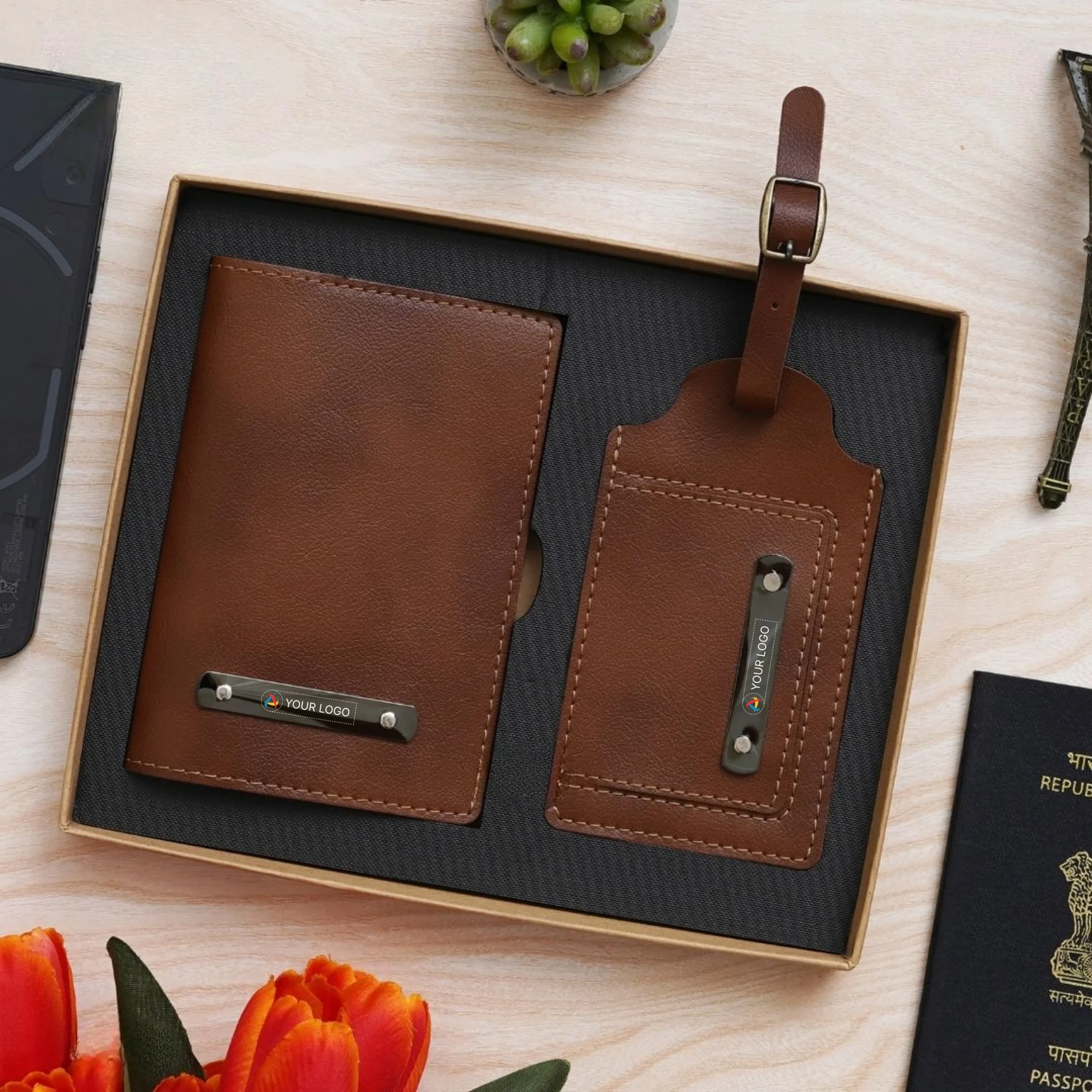 Designed for practical travel use, the set includes a passport holder and luggage tag made from smooth, durable vegan leather. The compact build ensures easy portability, while the premium finish adds a professional touch. Ideal for corporate gifting, client giveaways and festive hampers, with custom branding options available.
