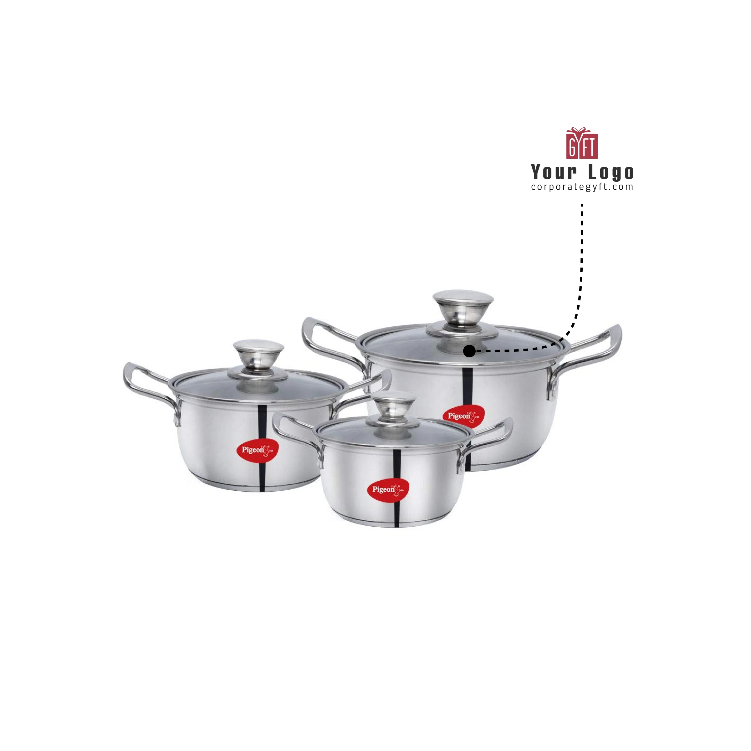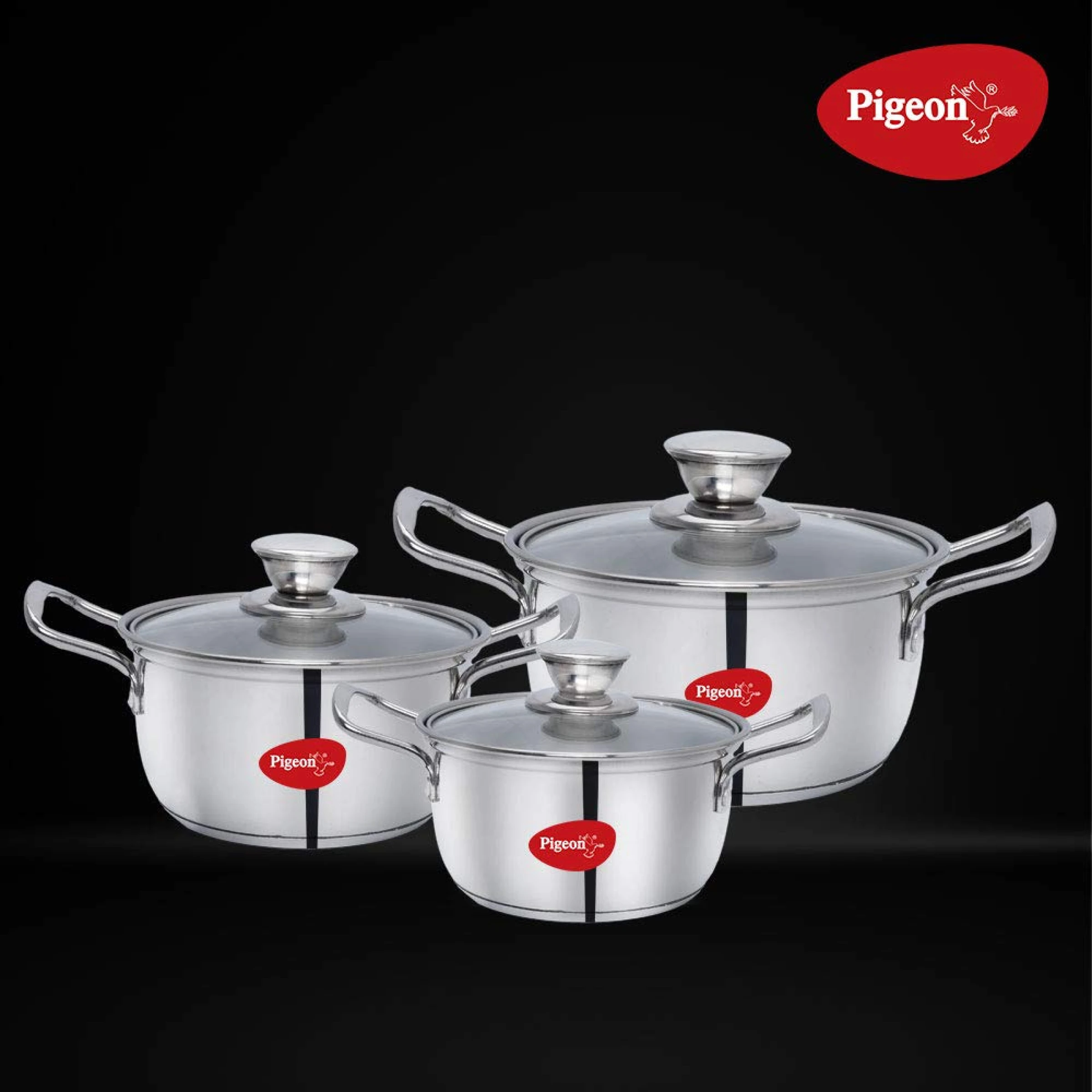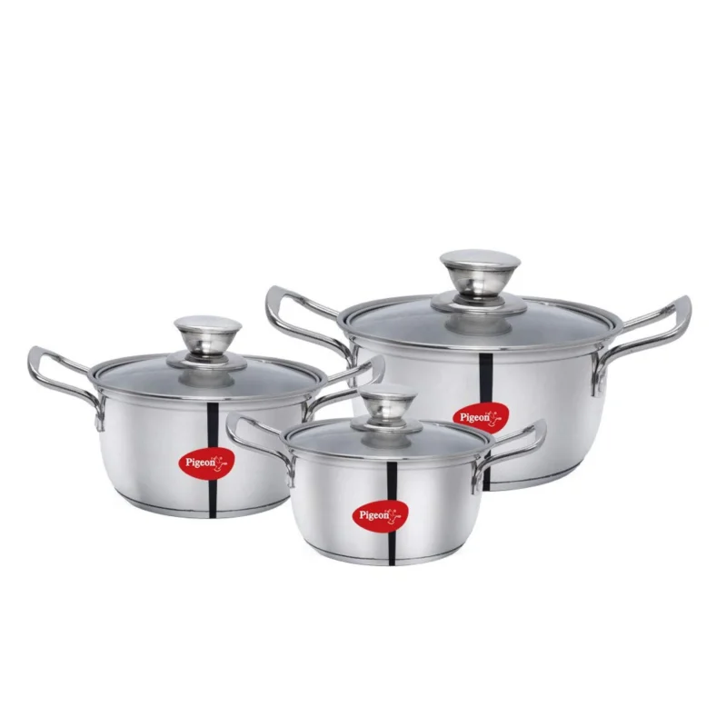Elegant stainless steel casseroles by Pigeon are designed to bring efficiency and versatility to everyday cooking. The set includes three practical sizes that make it easy to prepare different quantities of soups curries vegetables and other home style dishes. Induction compatible bases promote even heating on both gas and induction cooktops while transparent lids help monitor cooking without lifting the cover. Sturdy handles provide safe and comfortable handling during cooking and serving. A polished silver finish gives the set a refined look making it suitable not only for daily kitchen use but also for corporate gifting branded hampers and customized kitchen gift collections.
