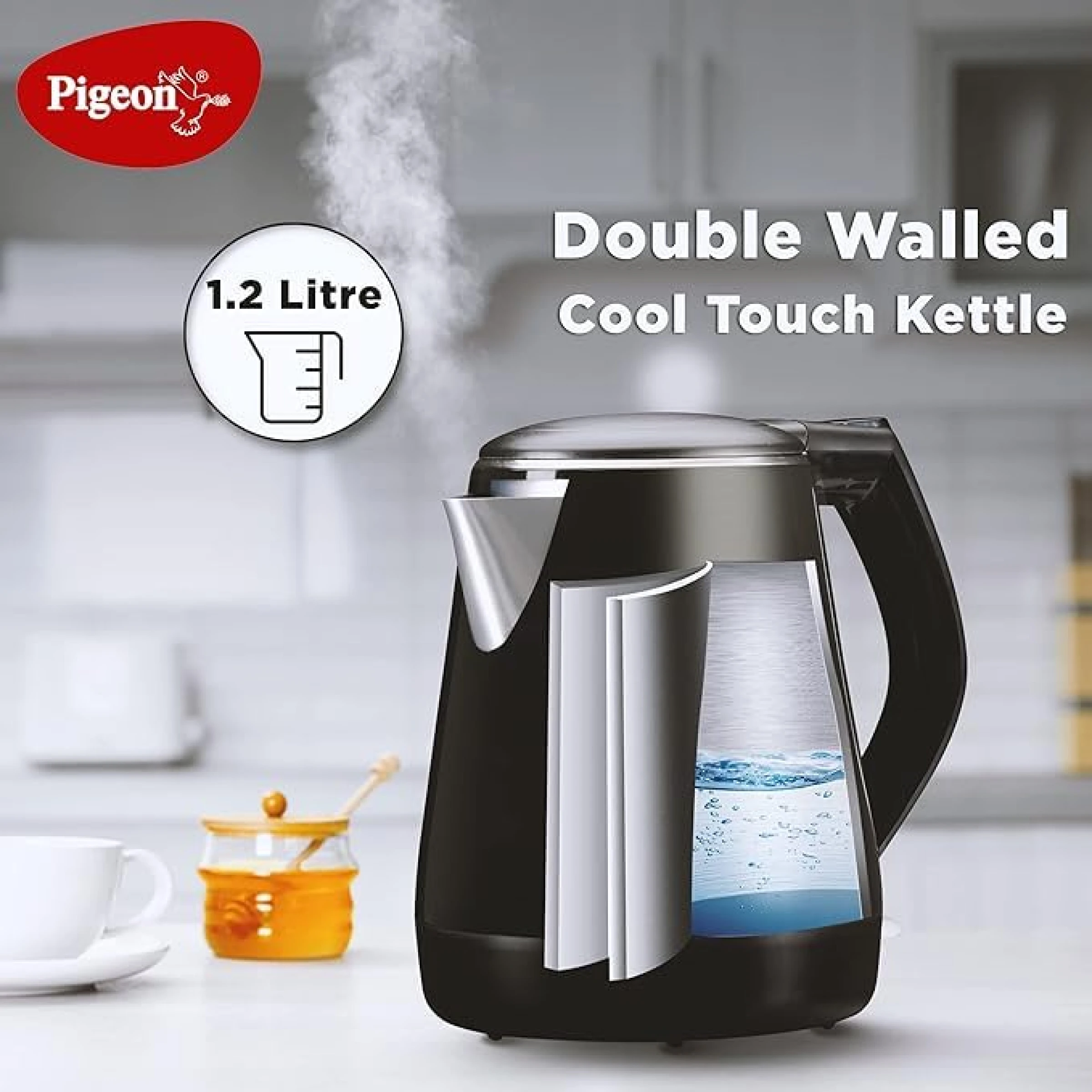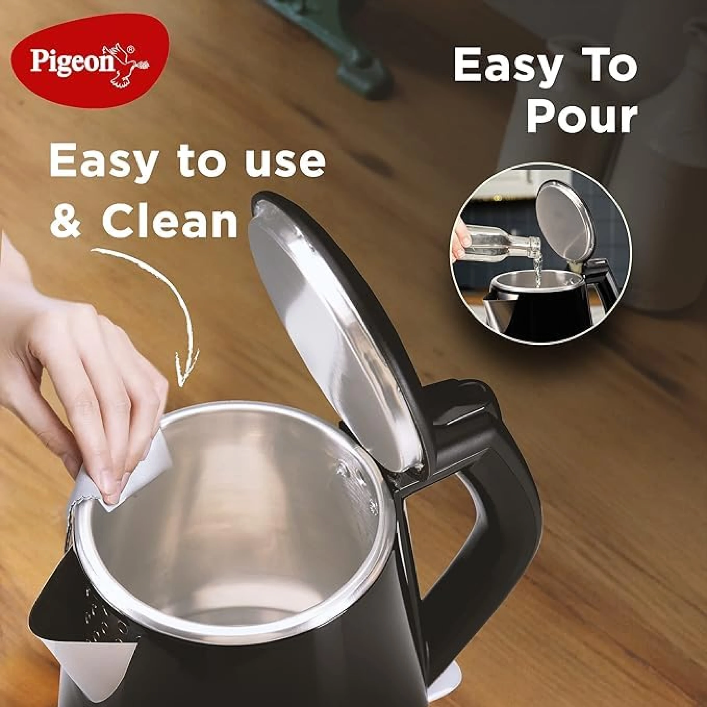 The Pigeon spark 1.2L electric kettle is designed for safe, quick, and convenient boiling, perfect for everyday use at home, office, hostel, or travel. Its stainless steel inner tank ensures hygiene and durability, while the cool-touch insulated outer body protects your hands from accidental burns. With a cordless 360° swivel base, it offers effortless handling and storage. The wide mouth makes filling, pouring, and cleaning smooth and hassle-free. Featuring boil-dry protection and an automatic shut-off function, this kettle provides reliable safety and energy-efficient performance every time you use it.
