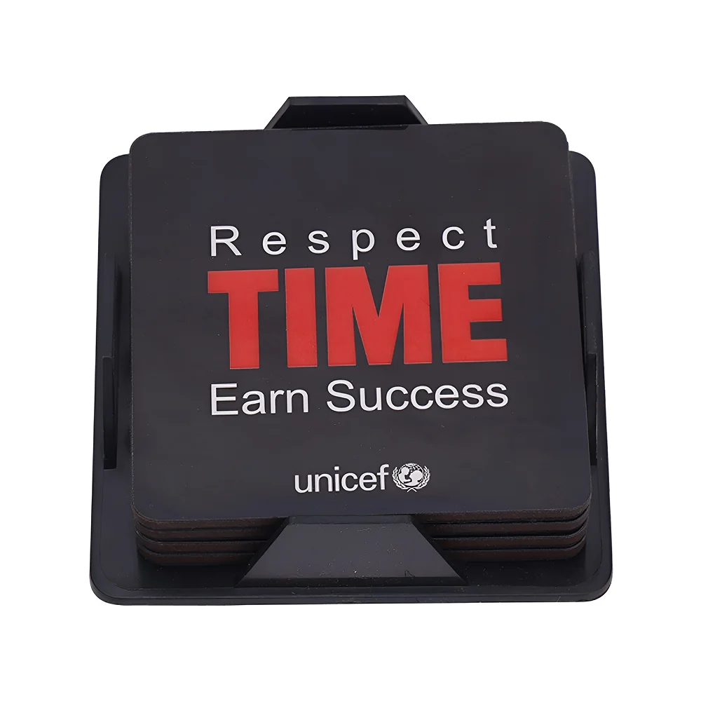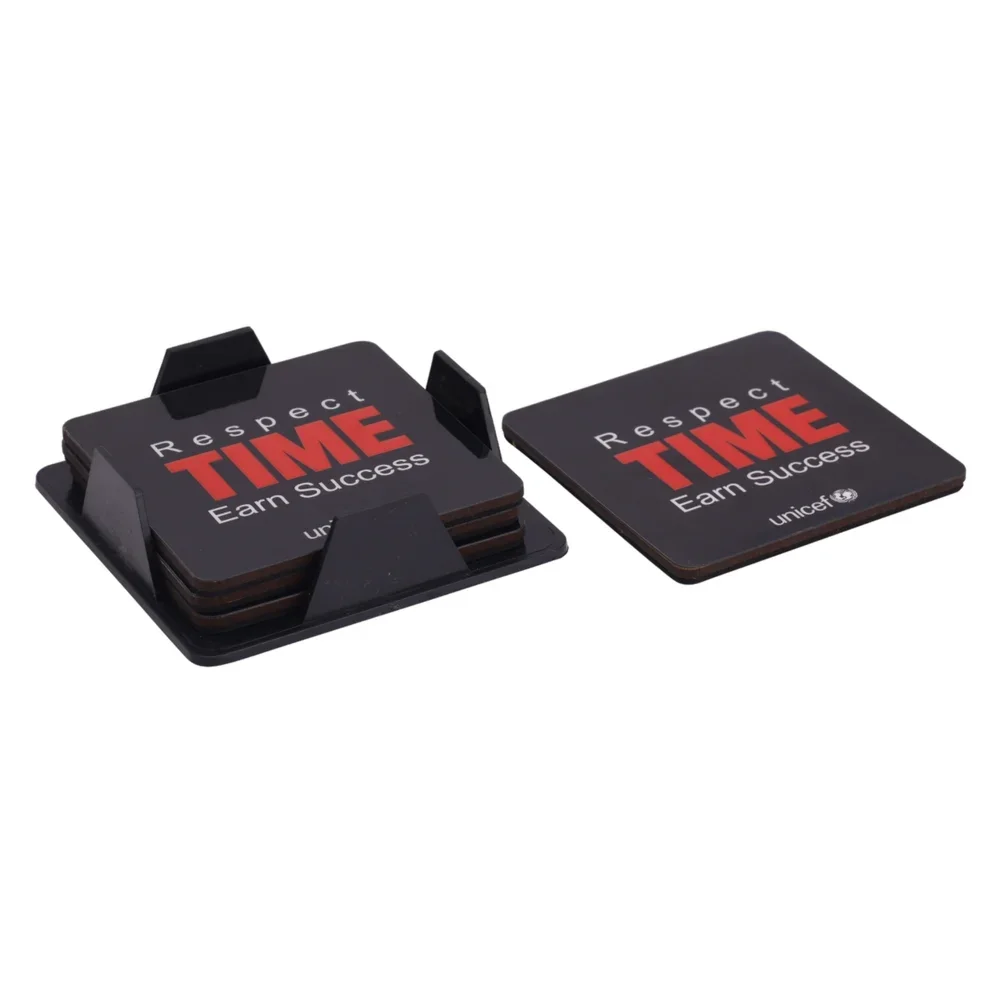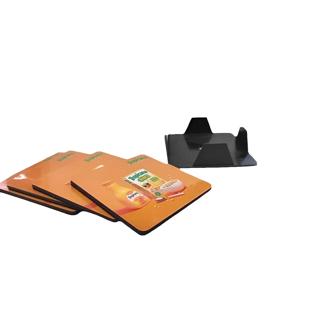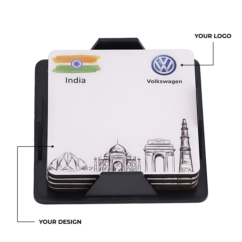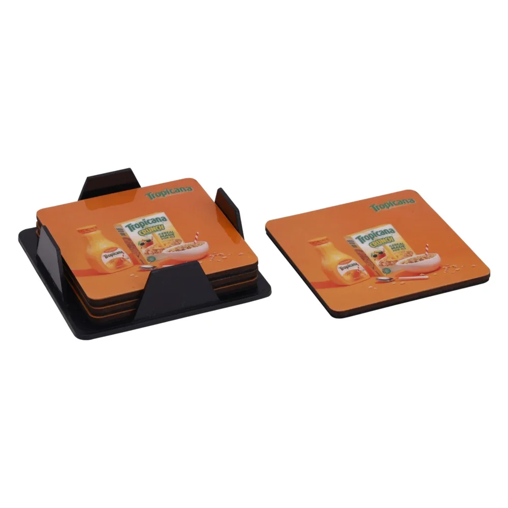 This premium coaster set combines stylish high-gloss MDF with an anti-skid EVA backing to keep surfaces protected from heat marks, stains, and scratches. Designed with a large customizable branding area, these square coasters are perfect for promotional use and everyday functionality. Lightweight, durable, and easy to clean, they are ideal for home, office, cafés, and corporate gifting occasions. Neatly available in sets of 4 with optional stand and storage box for better organization. The glossy finish adds a modern touch to any table setup. A smart and practical way to keep your brand visible every day.