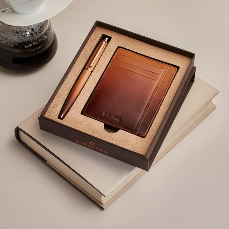 Elevate your gifting experience with the Sheaffer® coffee edition gift set, combining a sleek coffee-colored ballpoint pen with a premium leather card holder. The pen features smooth writing, durable brass construction, and elegant PVD brown trims with the Sheaffer insignia. The card holder offers six slots, dual-toned leather, RFID protection, and refined jacquard lining with copper accents. Presented in a premium gift box, this set is perfect for professionals, corporate gifting, and special occasions.