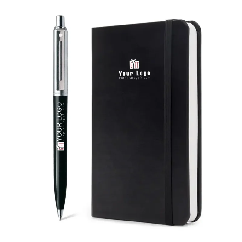 This sheaffer® gift set pairs the sleek sentinel black 321 ballpoint pen with a hardbound medium notebook. The pen features a clickable push-button mechanism and slim profile for comfortable everyday writing. The notebook offers 160 ruled pages of 90gsm fountain pen-friendly paper in a durable leatherette cover. Packaged in a premium recyclable hangsell box, it’s perfect for gifting.