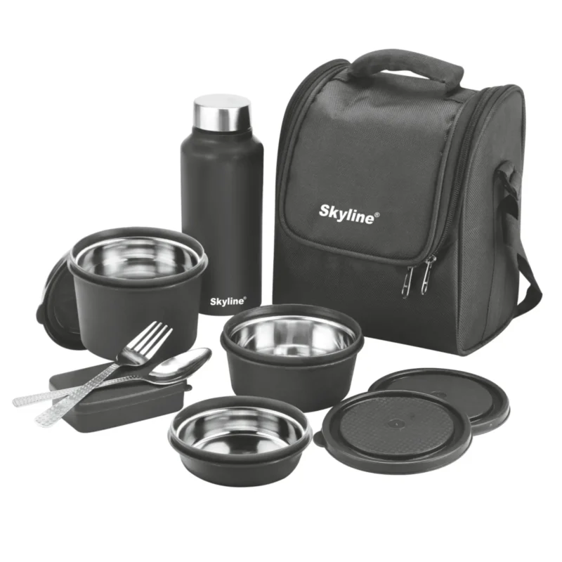 Make mealtime convenient and stylish with the Skyline office lunch box set. This all-in-one set includes 3 microwave-safe containers, a plastic pickle box, a 750ml stainless steel bottle, a steel spoon & fork, and a premium insulated bag. The insulated bag keeps meals fresh, while the microwave-safe containers allow hassle-free reheating. Compact, durable, and travel-friendly, this lunch set is perfect for office, school, picnics, or travel. Neatly packed, it also makes a thoughtful and practical gift.