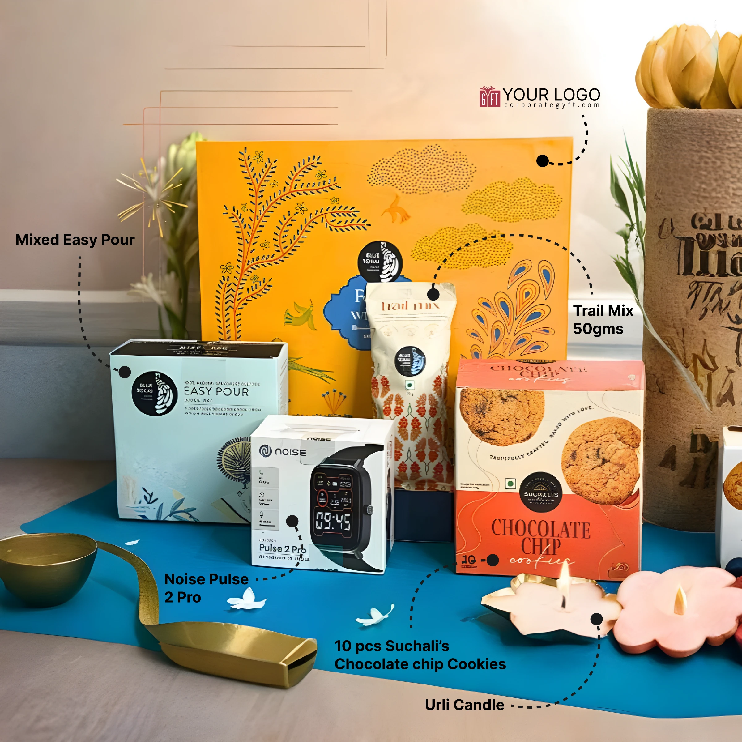 This premium lifestyle gift hamper is thoughtfully curated to blend technology, gourmet treats, and festive charm, making it perfect for celebrations and corporate gifting. It features the Noise Pulse 2 Pro smartwatch for fitness tracking and smart notifications, a 5-pack of mixed easy pour coffee for fresh brews, 10 pieces of delicious chocolate chip cookies, a 50-gram trail mix of nuts, seeds, and cranberries, and a decorative Urli candle to add a festive touch. Packaged in a premium festive gift box, the hamper combines style, convenience, and indulgence. With space for custom logo or branding, it is ideal for Diwali, corporate gifting, employee rewards, and special festive occasions.