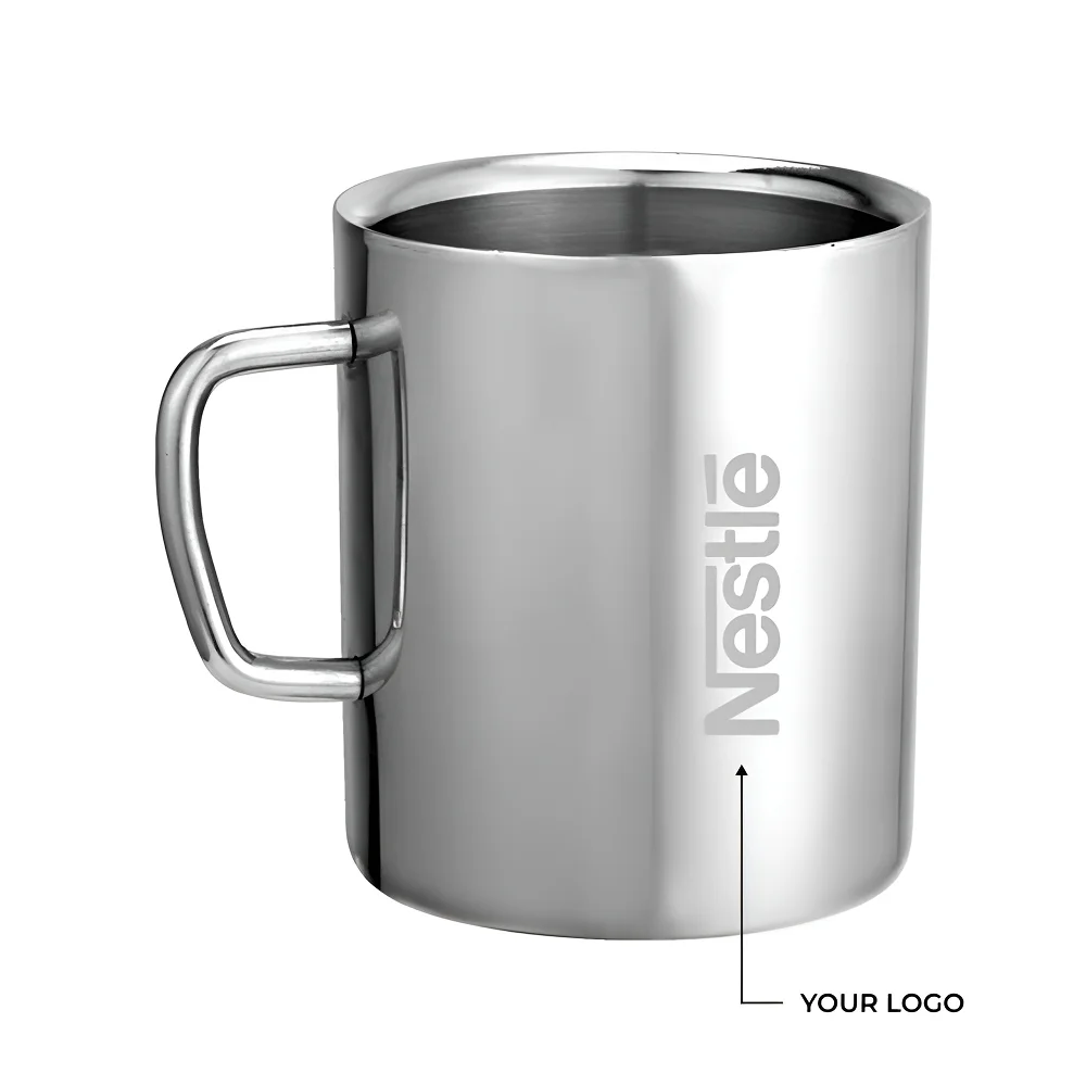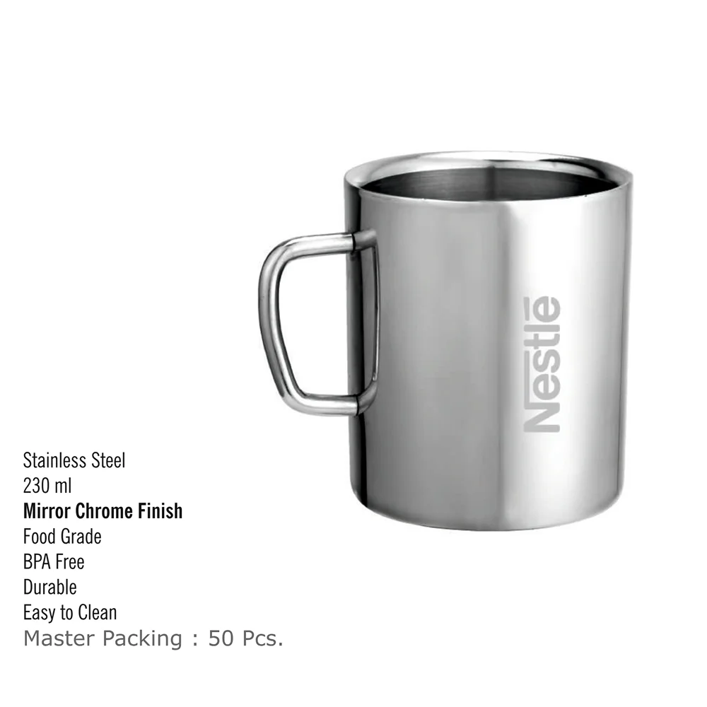 Designed for everyday convenience and modern style, this double wall stainless steel cup is a practical choice for enjoying hot or cold beverages. Crafted from durable food grade stainless steel, it is BPA free for safe daily use. The double wall construction helps maintain drink temperature longer while providing a comfortable grip. Its polished mirror chrome finish gives it a sleek and premium appearance suitable for office desks, homes, and meeting spaces. With a 230 ml capacity, it is ideal for serving coffee, tea, milk, and other beverages. Easy to clean and built for long-lasting use, this reusable cup combines utility with elegance. It also makes an excellent option for promotional campaigns and corporate gifting with custom branding possibilities.