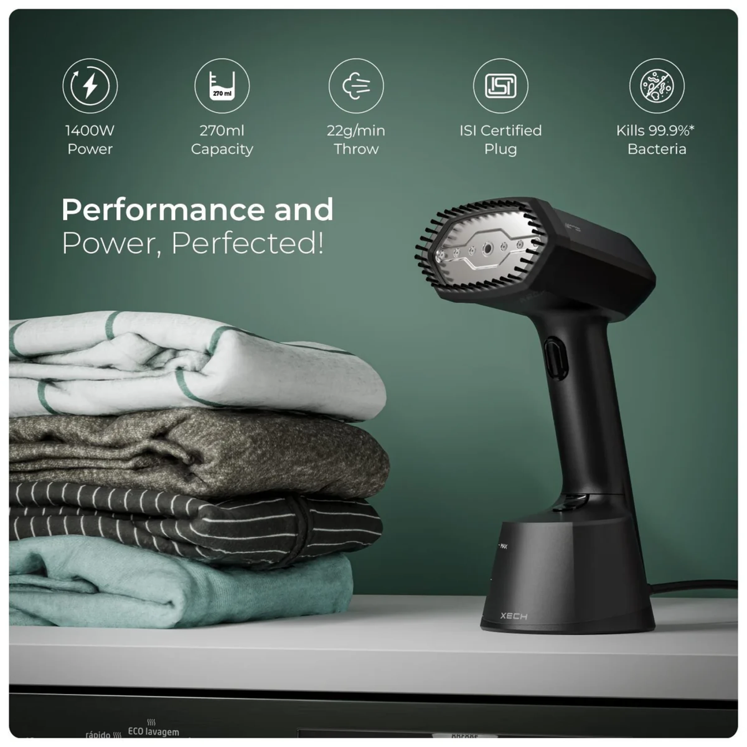 Designed for convenient fabric care on the go, Xech original merchandise handheld garment steamer delivers reliable 1400W high power performance with 22g per minute continuous steam to smooth wrinkles quickly. Suitable for all fabrics, one button control system ensures effortless operation while brush plus mesh attachment support versatile steaming needs. Large 270ml water tank allows longer steaming sessions without frequent refills. Clean exterior surface provides space for custom logo printing plus design branding, making it suitable for corporate gifting, festive giveaways, home use plus travel use where practicality meets modern presentation.