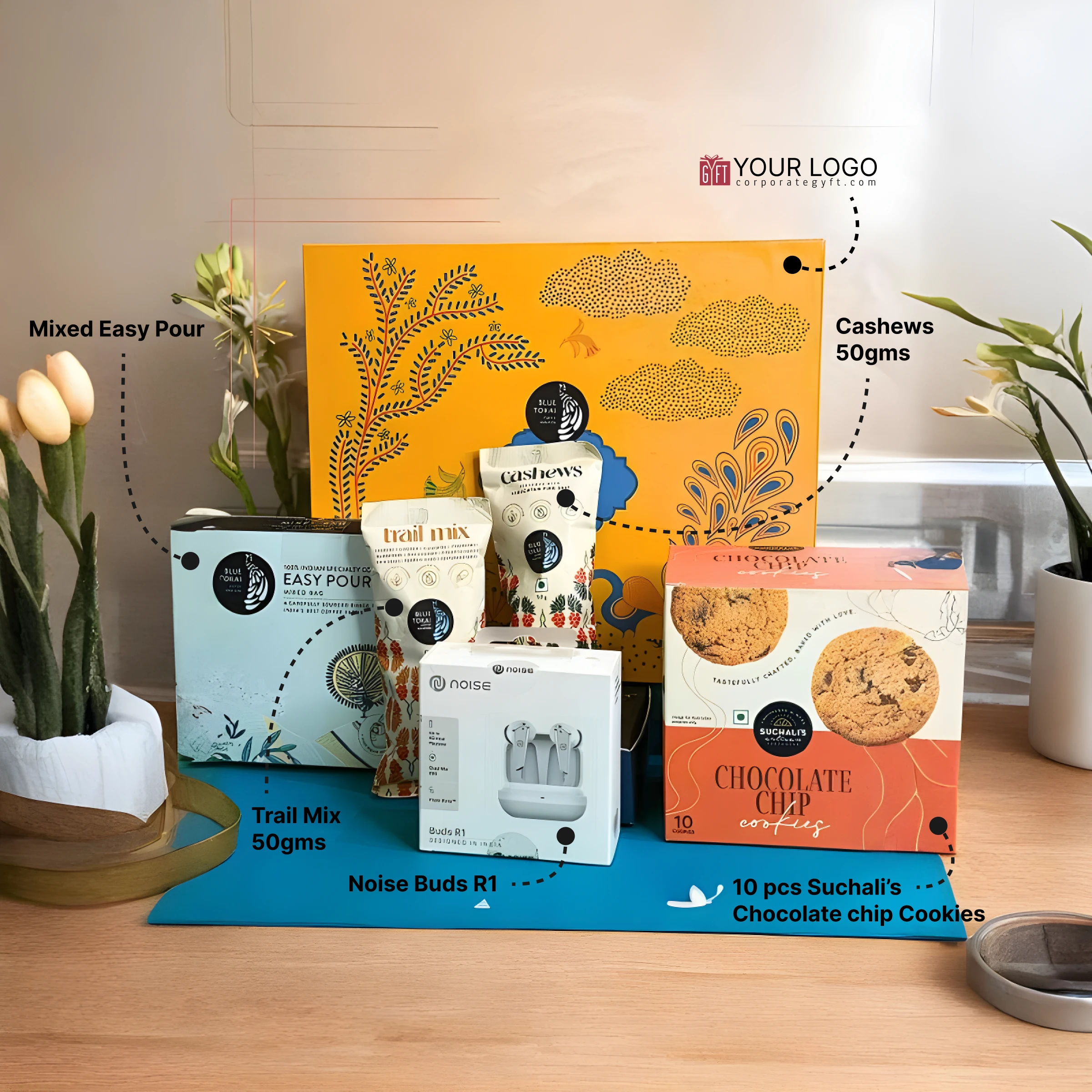This luxury corporate hamper brings together modern tech and gourmet indulgence in one elegant package. Featuring the Noise buds R1 wireless earbuds for an immersive audio experience with long-lasting battery life, it perfectly complements the Blue Tokai mixed easy pour coffee pack of 5, delivering freshly brewed café-style coffee in minutes. Paired with Suchali’s chocolate chip cookies (10 pieces), premium roasted almonds with Himalayan pink salt (50 gms), and a nutritious trail mix (50 gms), this hamper balances taste, health, and sophistication. Thoughtfully curated for corporate gifting, festive celebrations, and employee rewards, it also offers branding customization to add a premium, personalized touch.
