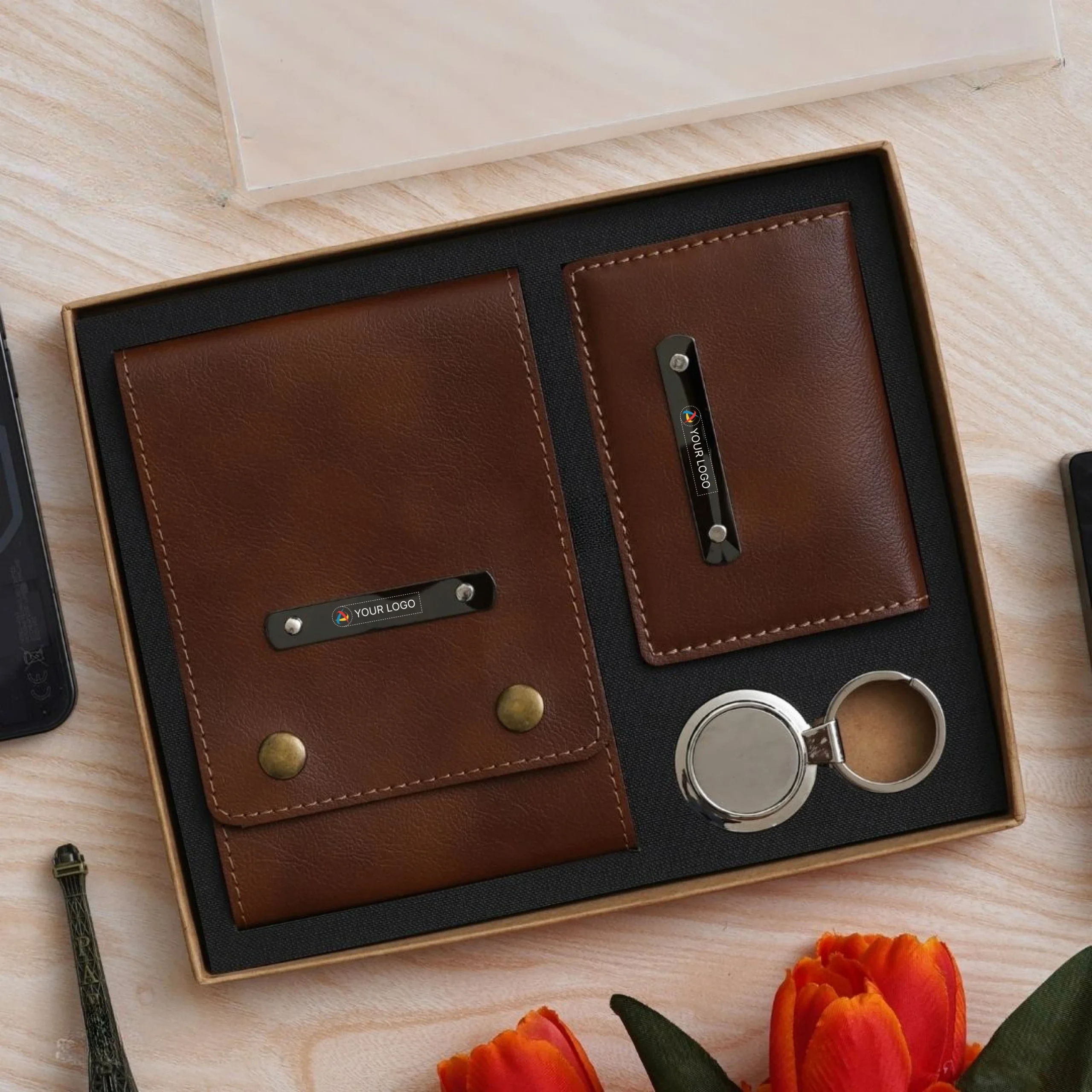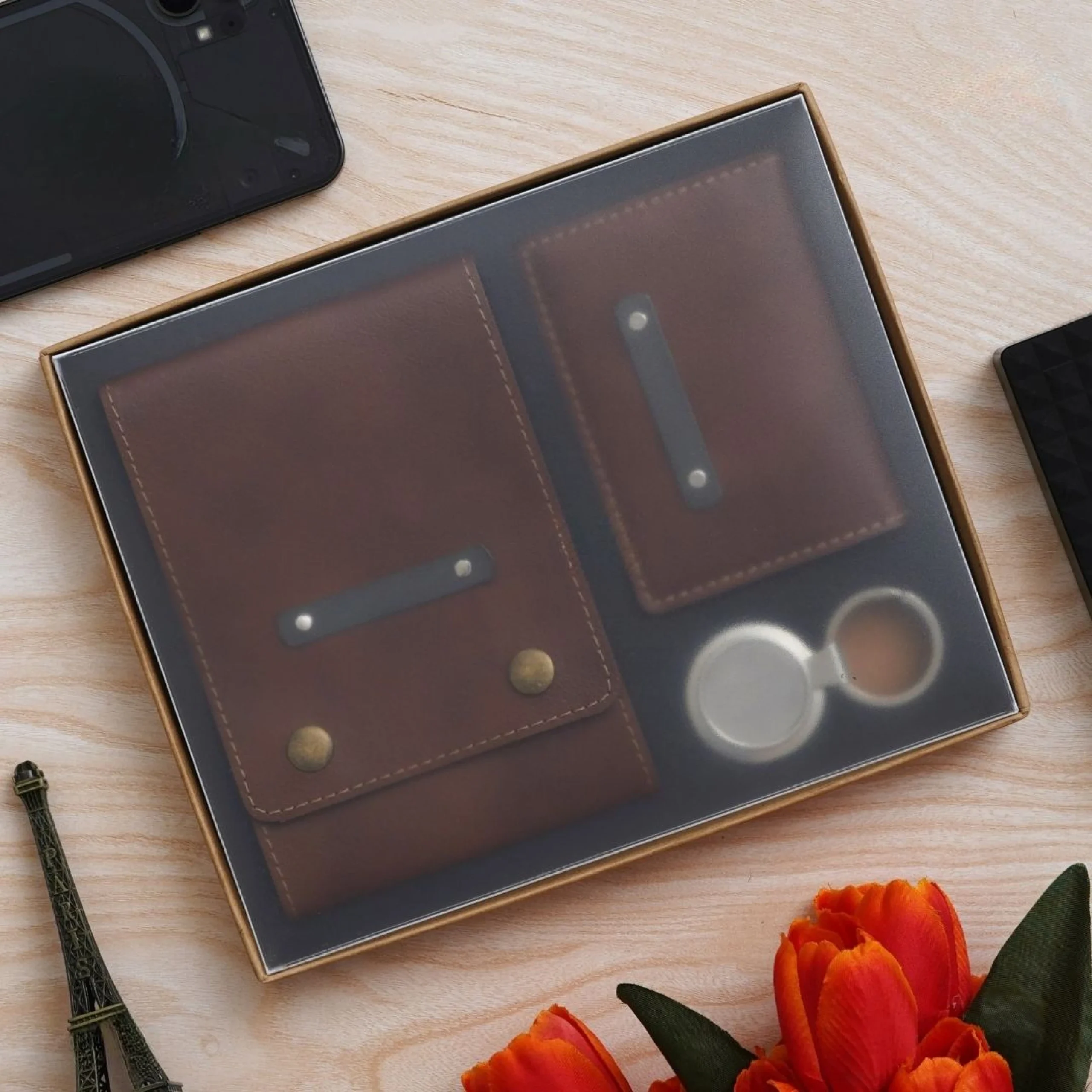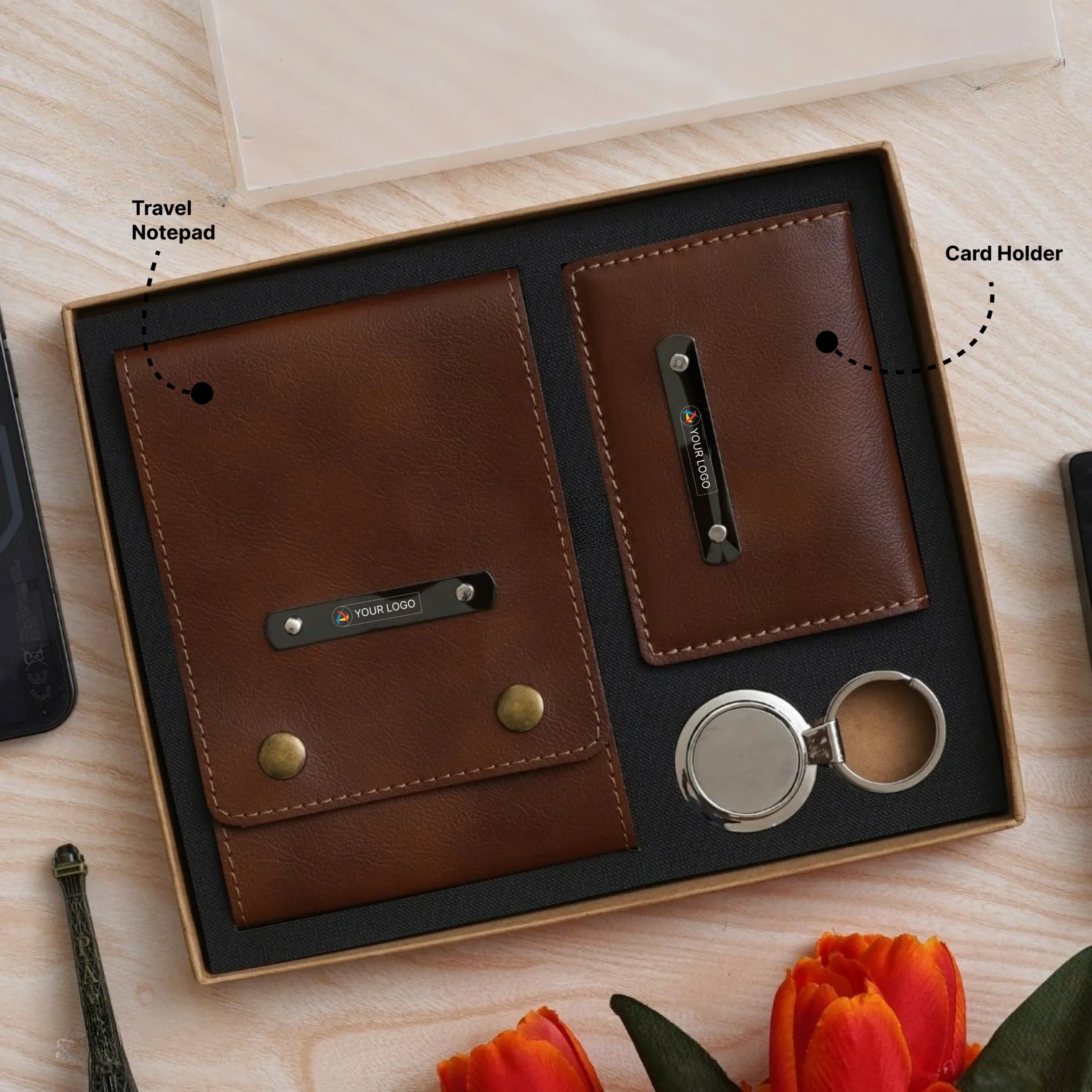 Crafted from durable vegan leather, this compact gift set includes a notepad, card holder and keychain designed for everyday utility and long-term use. Smooth texture and reinforced finish ensure a refined gifting experience for executives and clients alike. Suitable for onboarding kits, festive giveaways and premium brand promotions.