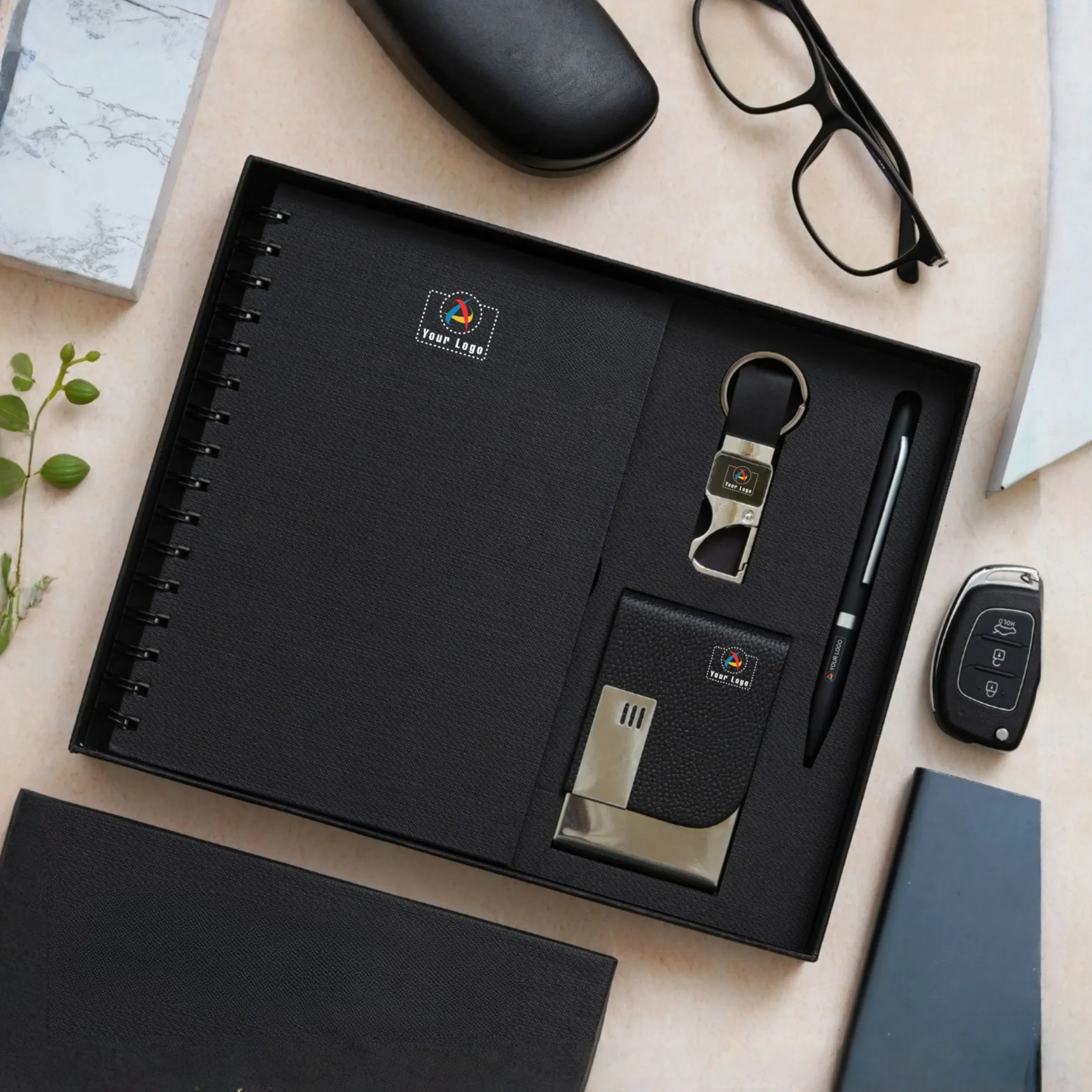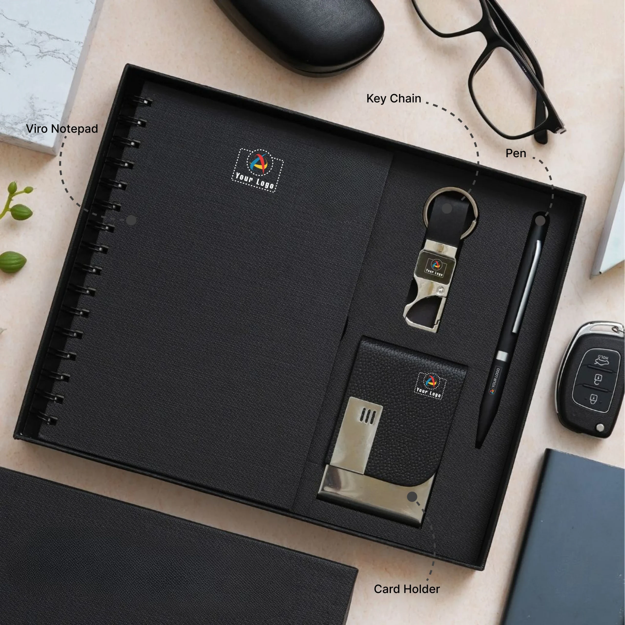 Thoughtfully assembled to enhance everyday efficiency, this vegan leather gift set includes a viro notebook, pen, keychain, and card holder. Compact yet impactful, it’s ideal for onboarding kits, festive giveaways, and executive gifting—offering ample space for custom branding to align with your company’s identity.