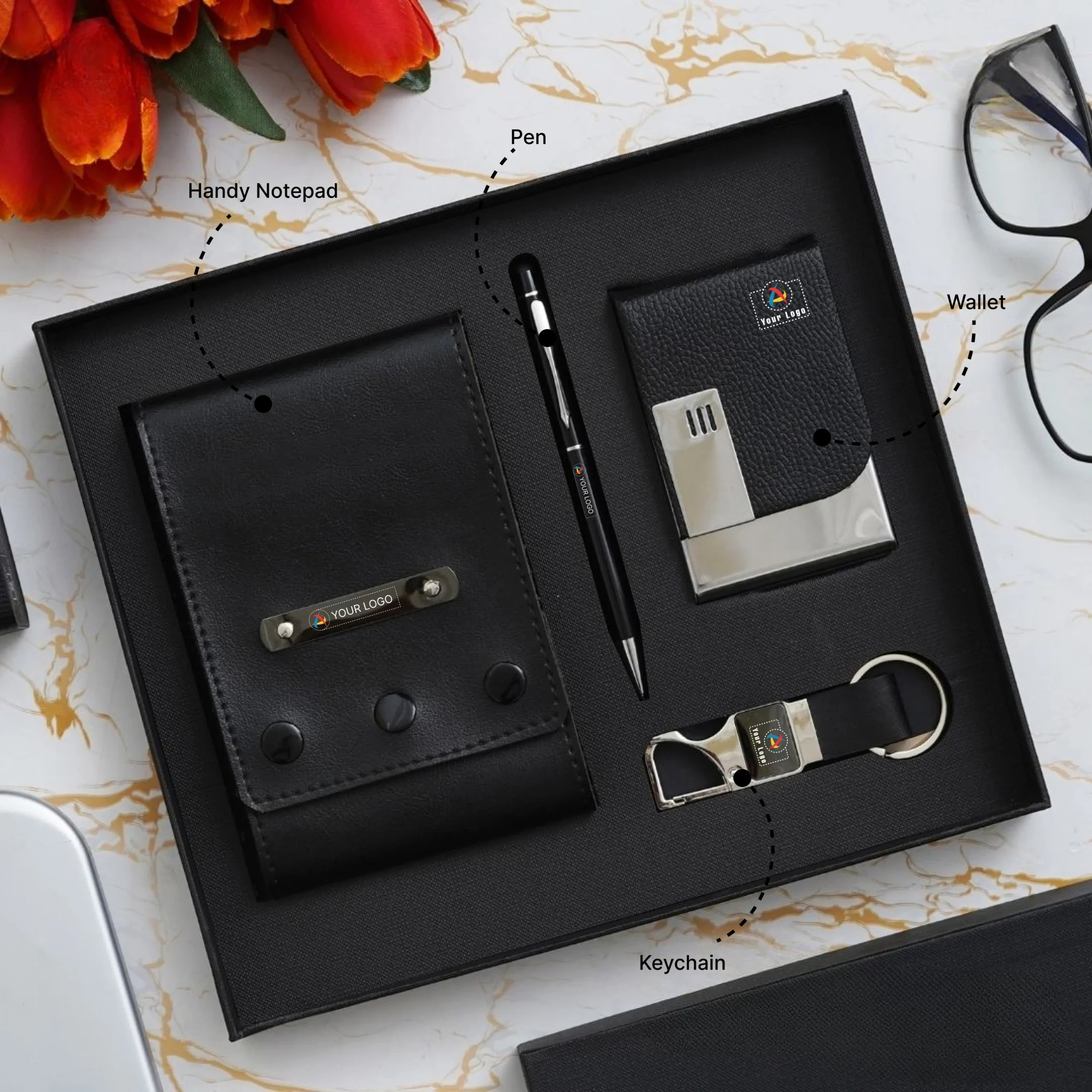 Curated for impactful corporate gifting, this vegan leather gift set includes a notepad, pen, wallet, and keychain—each designed to combine daily utility with a premium feel. Ideal for onboarding kits, festive giveaways, and client appreciation, it also offers space for custom branding to reflect your company’s identity.