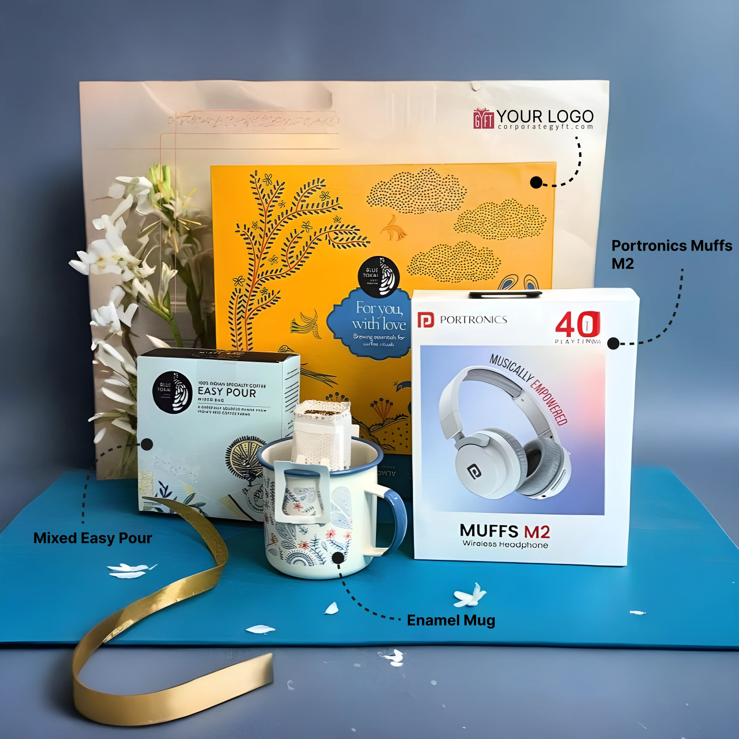 This curated gift hamper is perfect for corporate or personal gifting, combining tech, gourmet, and practical items in one elegant package. It features the portronics muffs M2 wireless over-ear headphones, delivering superior sound with 40mm dynamic drivers, up to 40 hours of playtime, and environmental noise cancellation for clear calls and immersive listening. The hamper also includes a pack of 5 mixed easy pour single-serve coffee or beverage sachets, ideal for a quick and flavorful drink. A sturdy and decorative enamel mug is included, making it convenient to enjoy beverages anywhere. All items are presented in a stylish gift box for custom branding, making it a thoughtful and versatile gift for employees, clients, or loved ones.