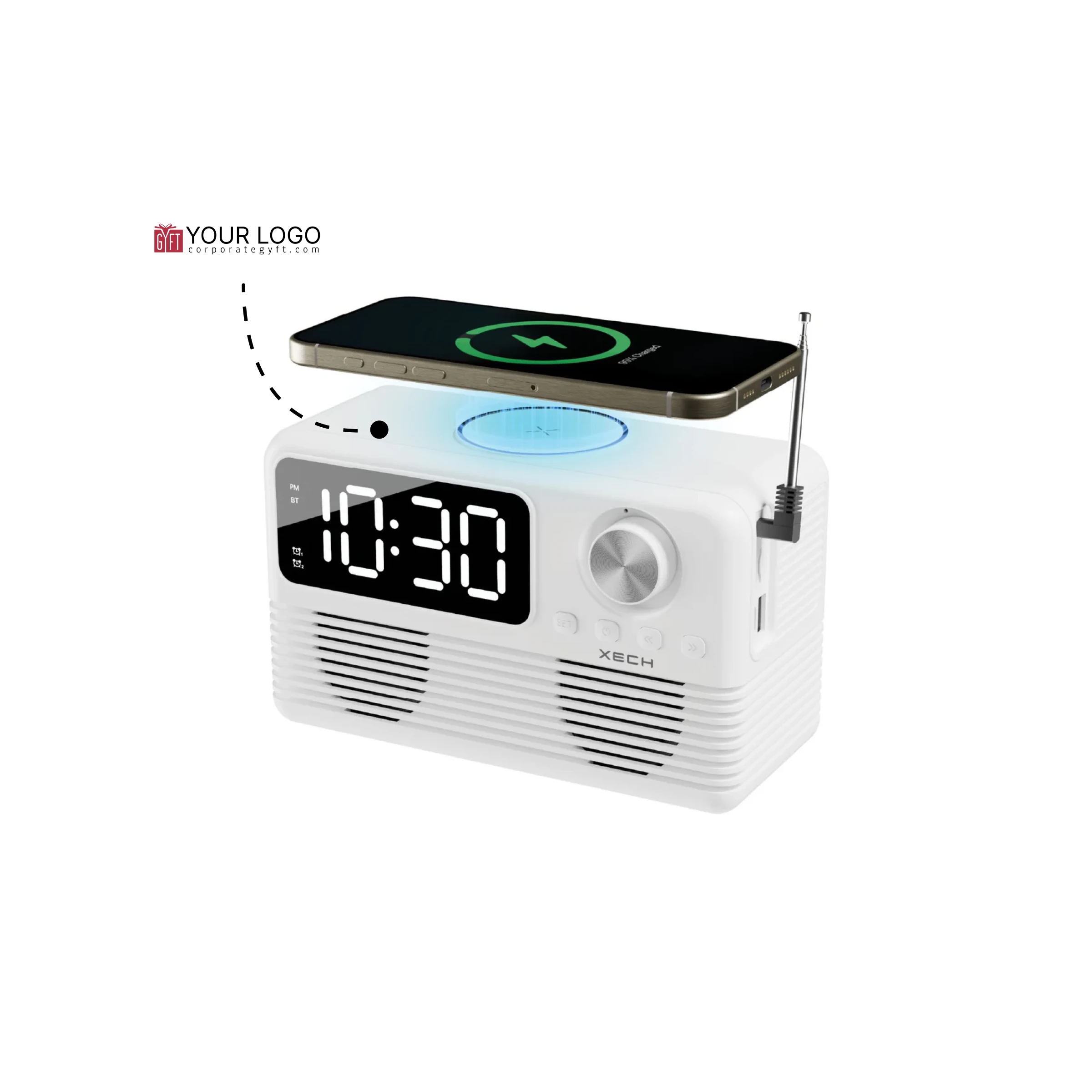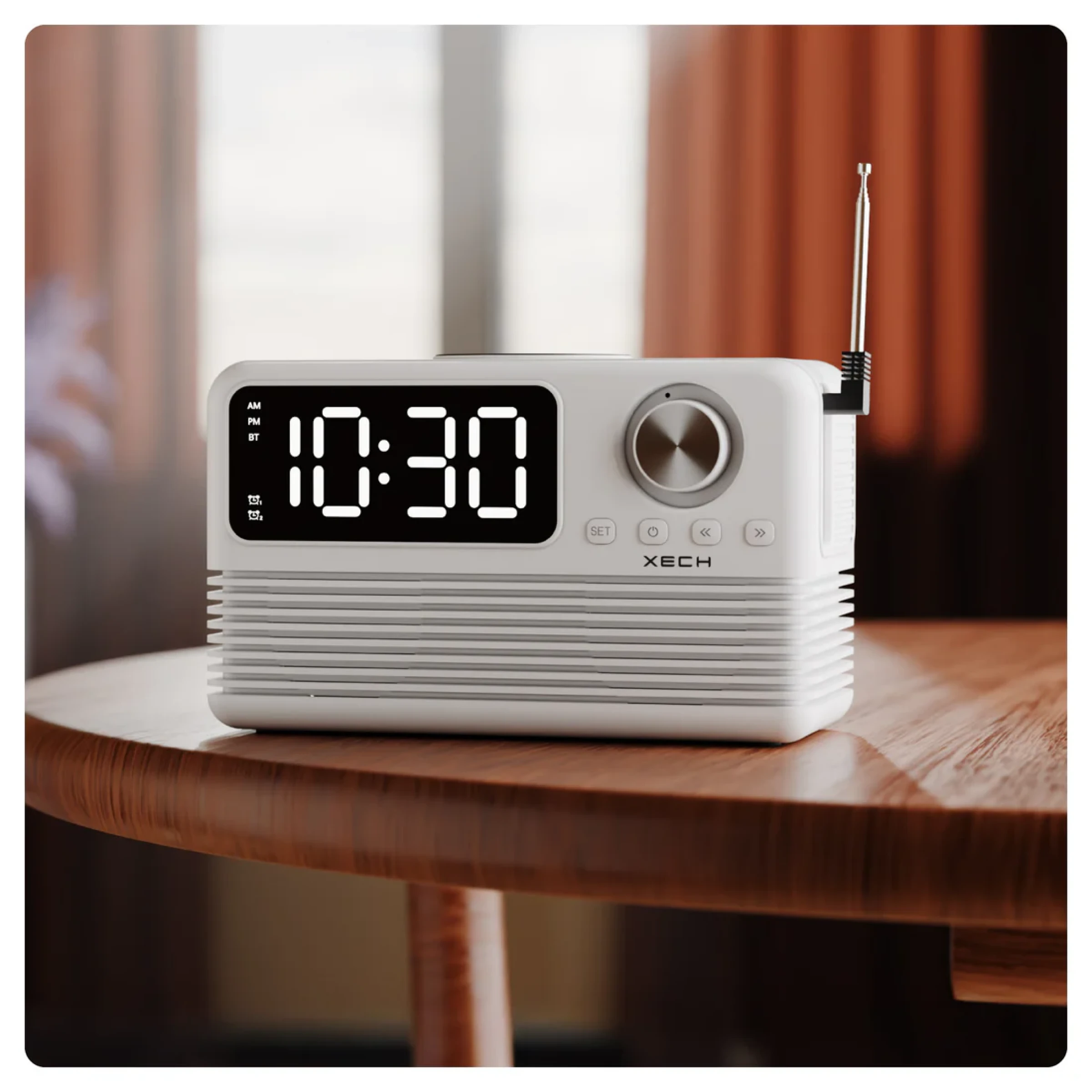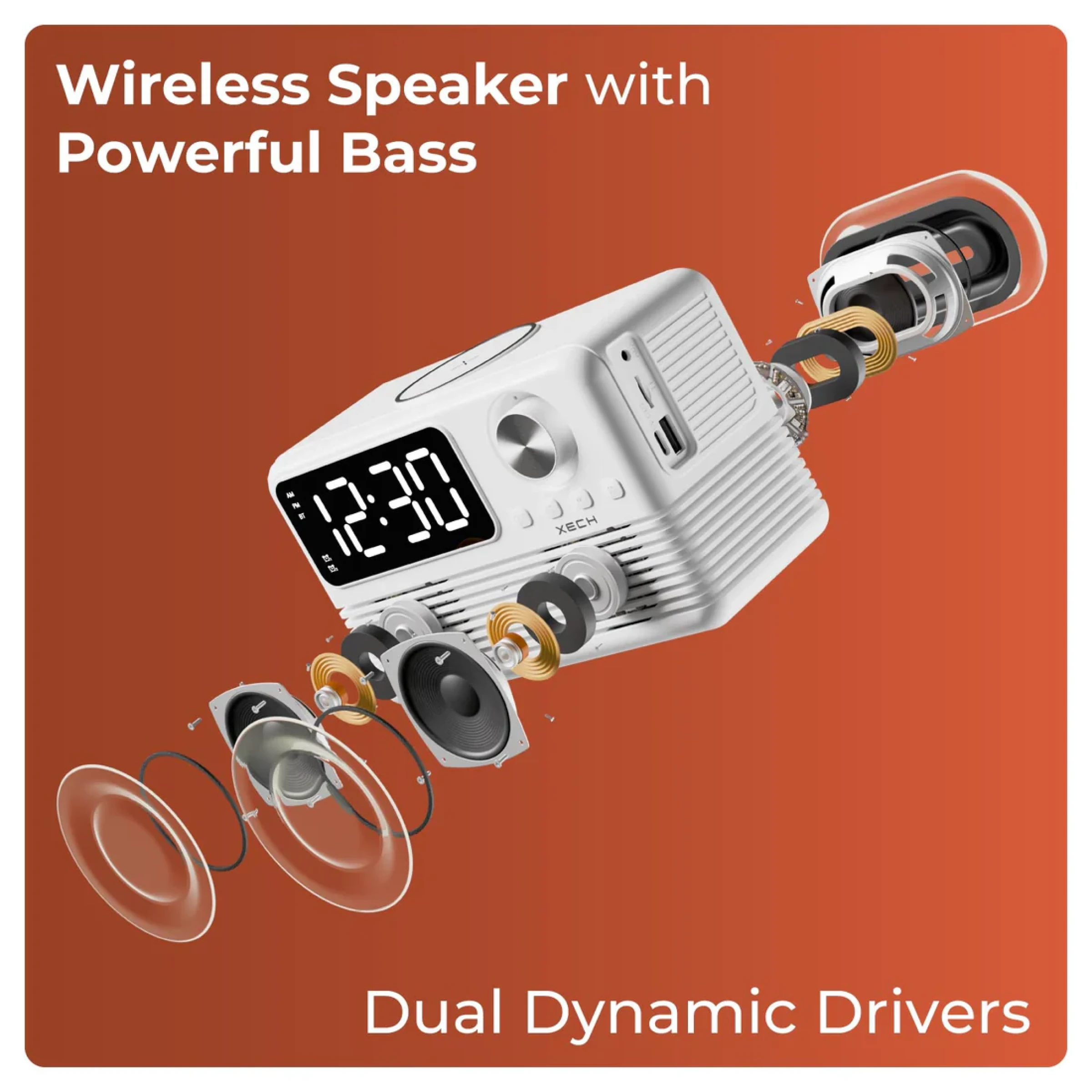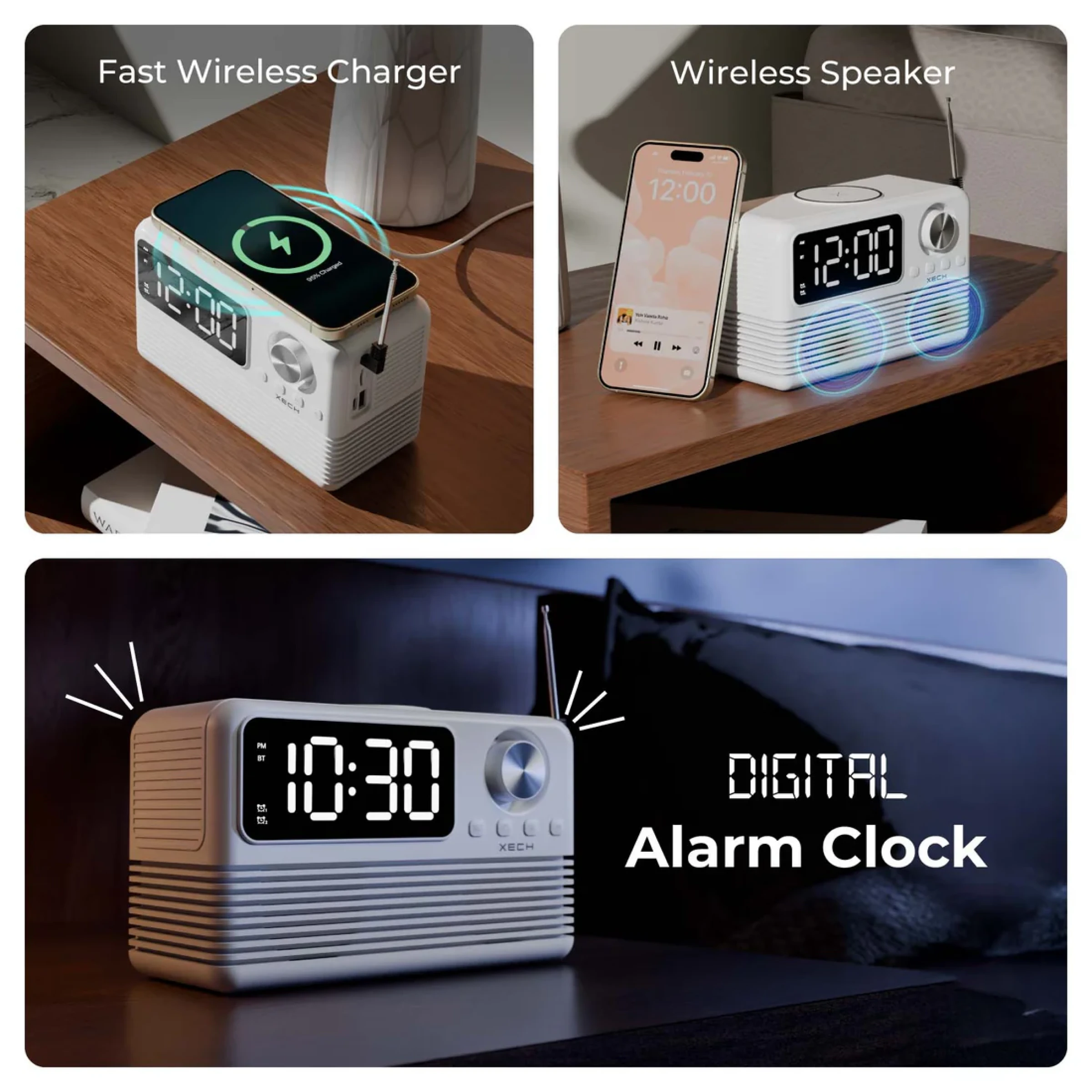 Bring style, sound, and smart functionality to your space with the Xech EON max retro clock speaker with wireless Charger. Designed with a nostalgic retro radio look and modern features, it combines a digital alarm clock, Bluetooth 5.3 speaker, FM radio, and wireless charging dock in one compact device. The dual alarm function with snooze helps keep your schedule on track, while the adjustable flicker free LED display offers clear visibility by day and a softer glow at night. Equipped with dual dynamic drivers and 10W room filling sound, it delivers an enjoyable audio experience for music, podcasts, or radio. Multiple playback options including Bluetooth, AUX, and TF card support ensure versatile entertainment, while built in USB A and USB C ports allow additional device charging. Its sleek design makes it perfect for bedside tables, study desks, office spaces, and modern interiors. Combining convenience, sound quality, and timeless aesthetics, it is also an excellent choice for premium gifting and corporate gifting.