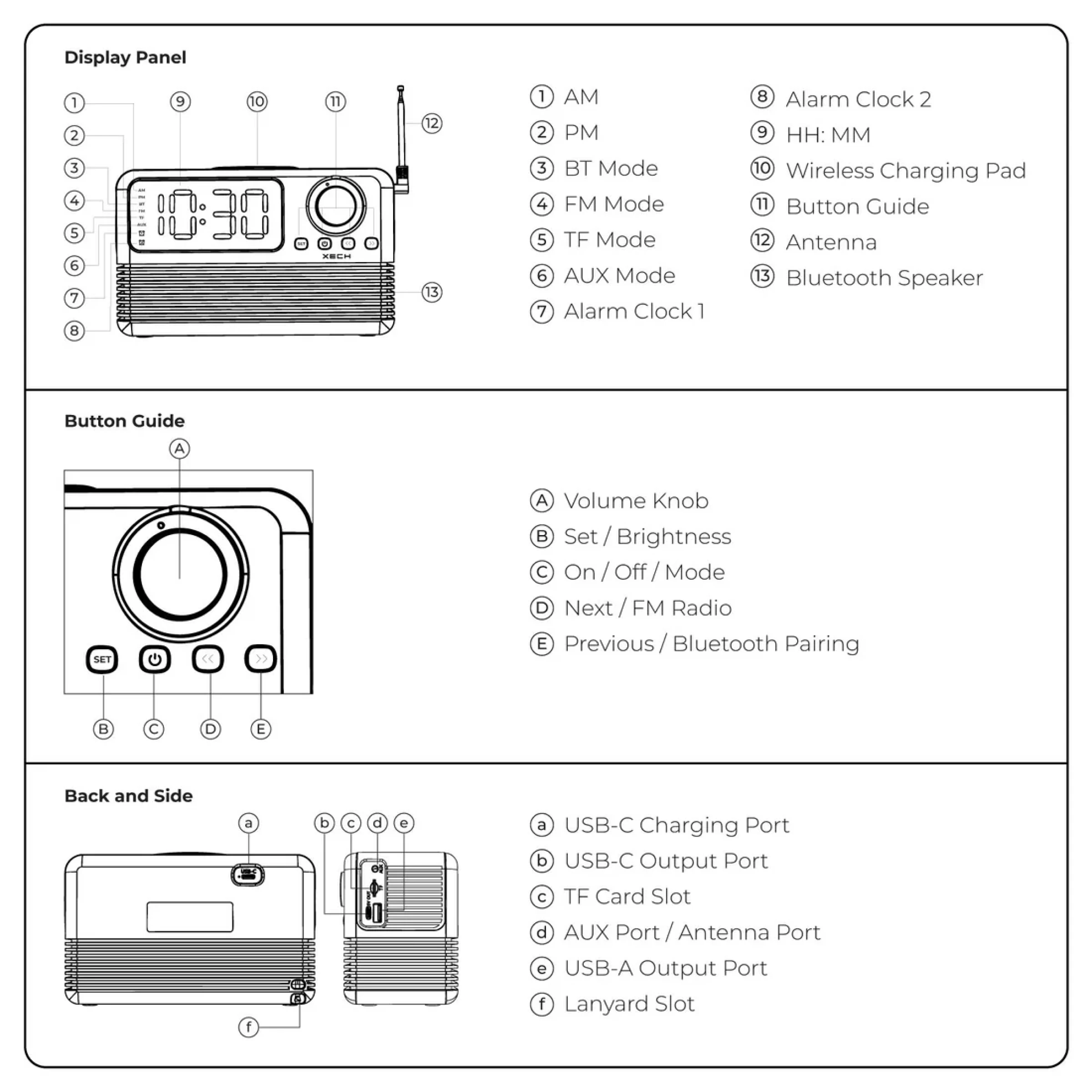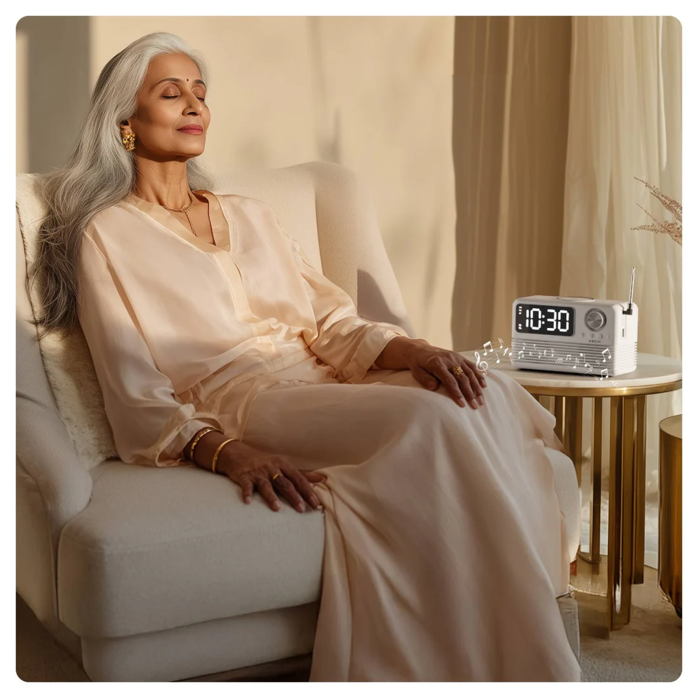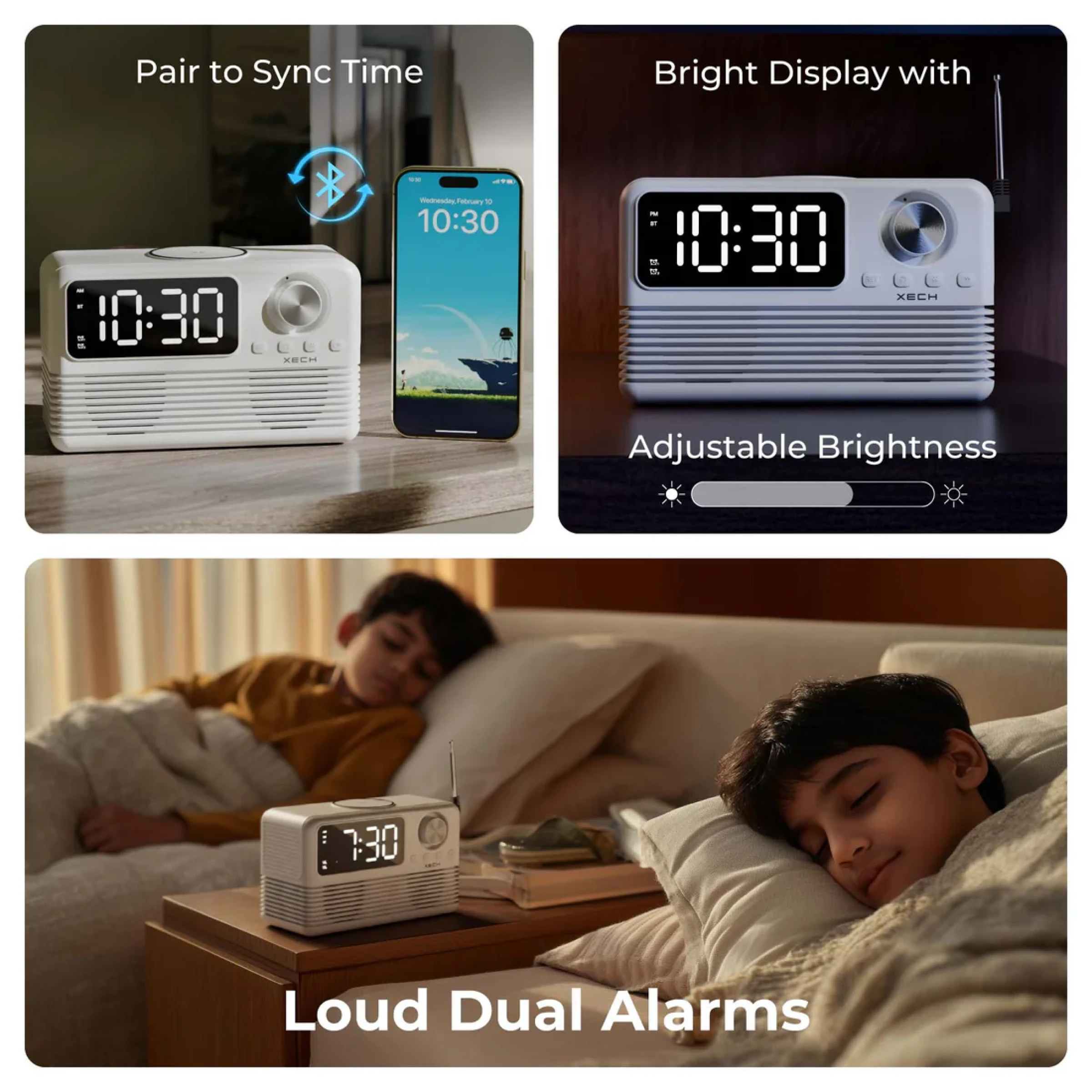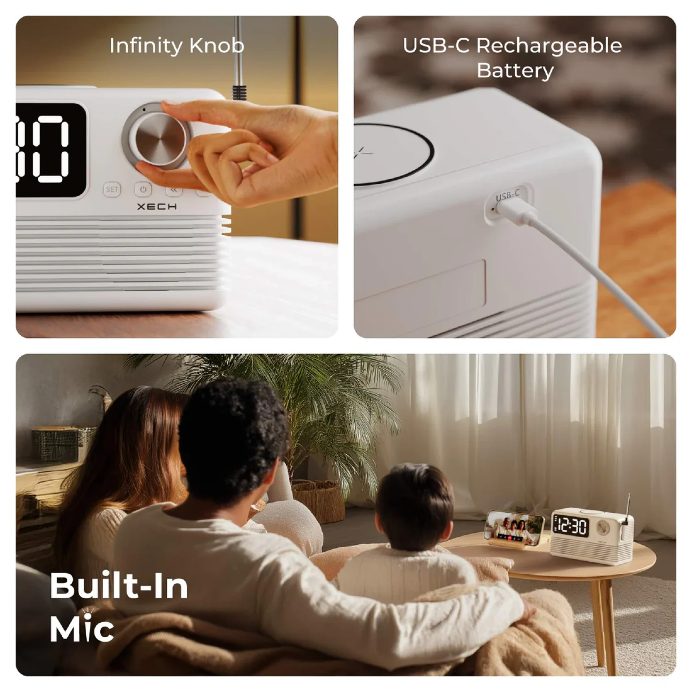 Bring style, sound, and smart functionality to your space with the Xech EON max retro clock speaker with wireless Charger. Designed with a nostalgic retro radio look and modern features, it combines a digital alarm clock, Bluetooth 5.3 speaker, FM radio, and wireless charging dock in one compact device. The dual alarm function with snooze helps keep your schedule on track, while the adjustable flicker free LED display offers clear visibility by day and a softer glow at night. Equipped with dual dynamic drivers and 10W room filling sound, it delivers an enjoyable audio experience for music, podcasts, or radio. Multiple playback options including Bluetooth, AUX, and TF card support ensure versatile entertainment, while built in USB A and USB C ports allow additional device charging. Its sleek design makes it perfect for bedside tables, study desks, office spaces, and modern interiors. Combining convenience, sound quality, and timeless aesthetics, it is also an excellent choice for premium gifting and corporate gifting.