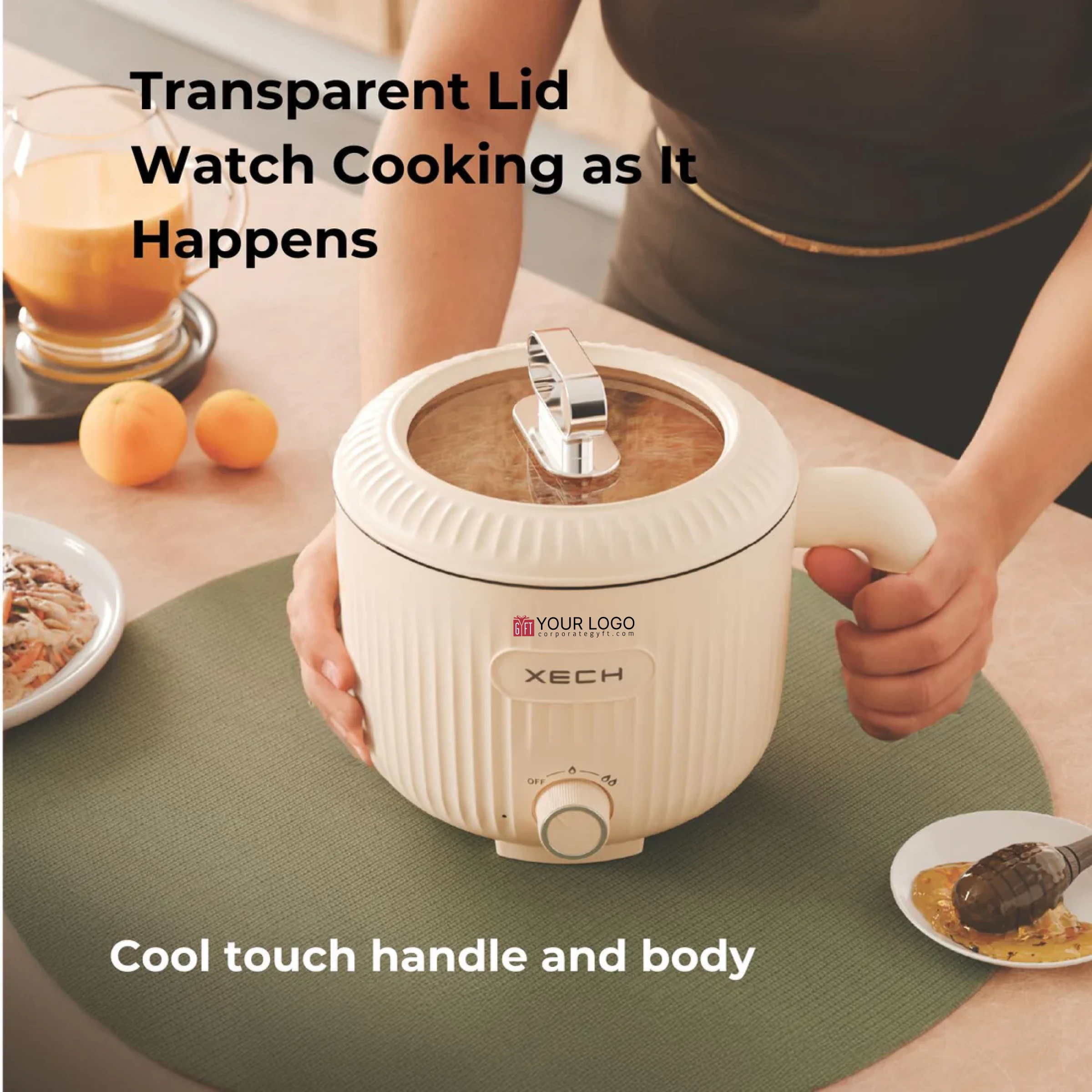 The electric cooker from Xech offers a versatile cooking solution with a 2-litre capacity suitable for daily meals, steaming, boiling, and slow cooking. The stainless steel steamer with transparent lid supports healthy cooking, while heat lock technology ensures faster preparation with minimal energy loss. Ceramic-coated inner pot delivers non-stick performance with toxin-free cooking plus easy cleaning, while adjustable 300W-600W power control enables flexible use across recipes. The cool-touch body with wooden handle enhances safe handling, elevated base pads support effective heat dissipation, and the detachable power cord improves storage convenience. Custom logo design printing space makes it an excellent option for corporate gifting, festive giveaways, home use and cooking enthusiasts.