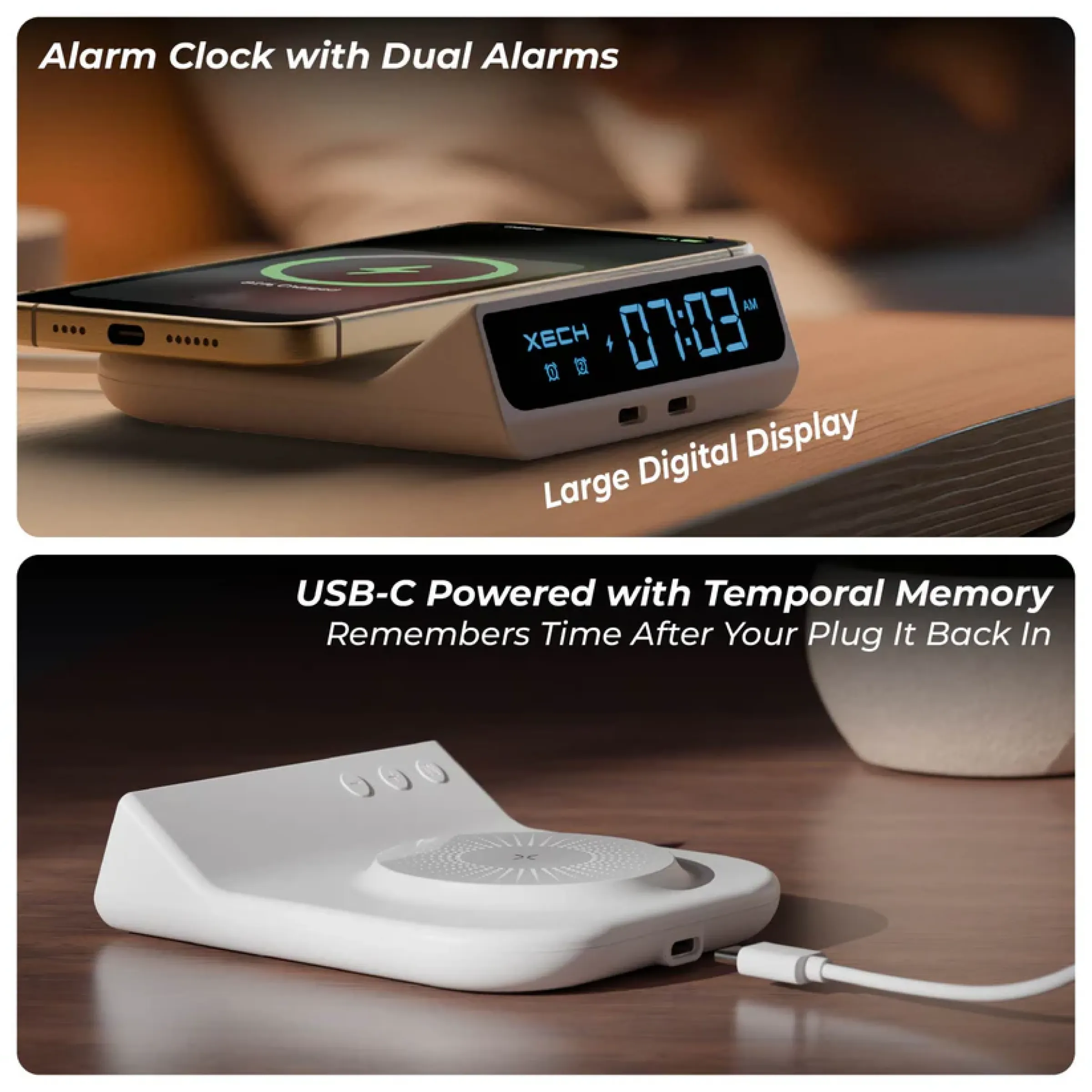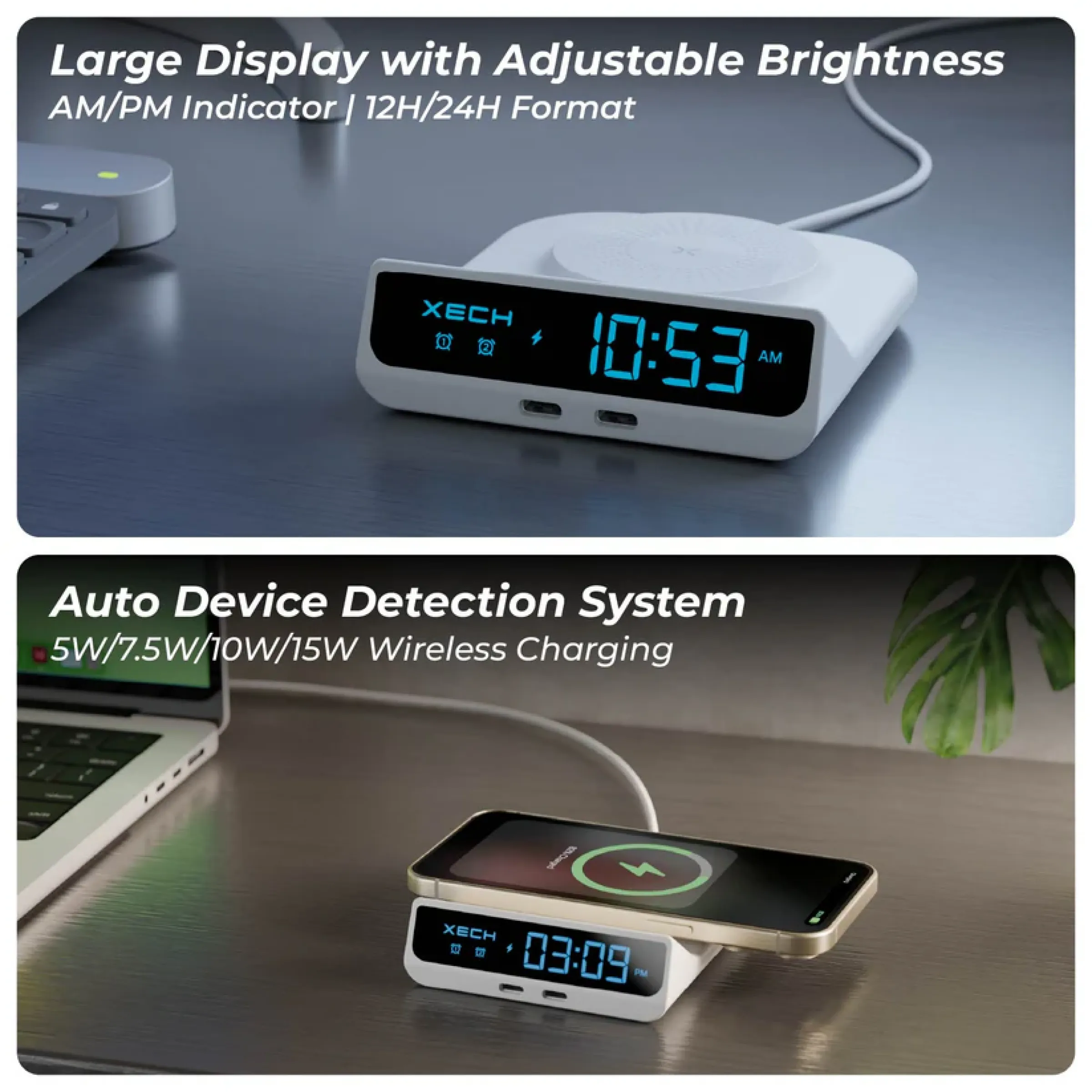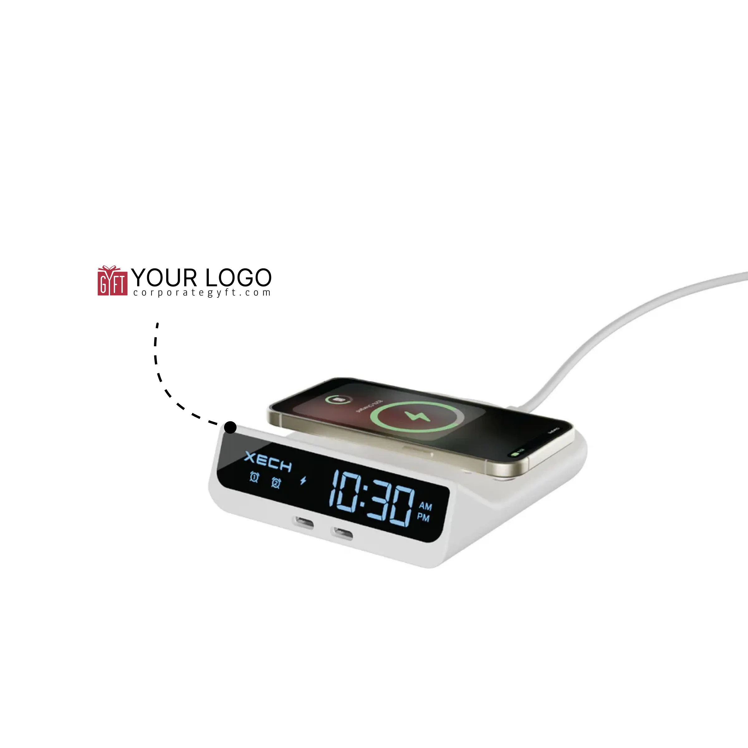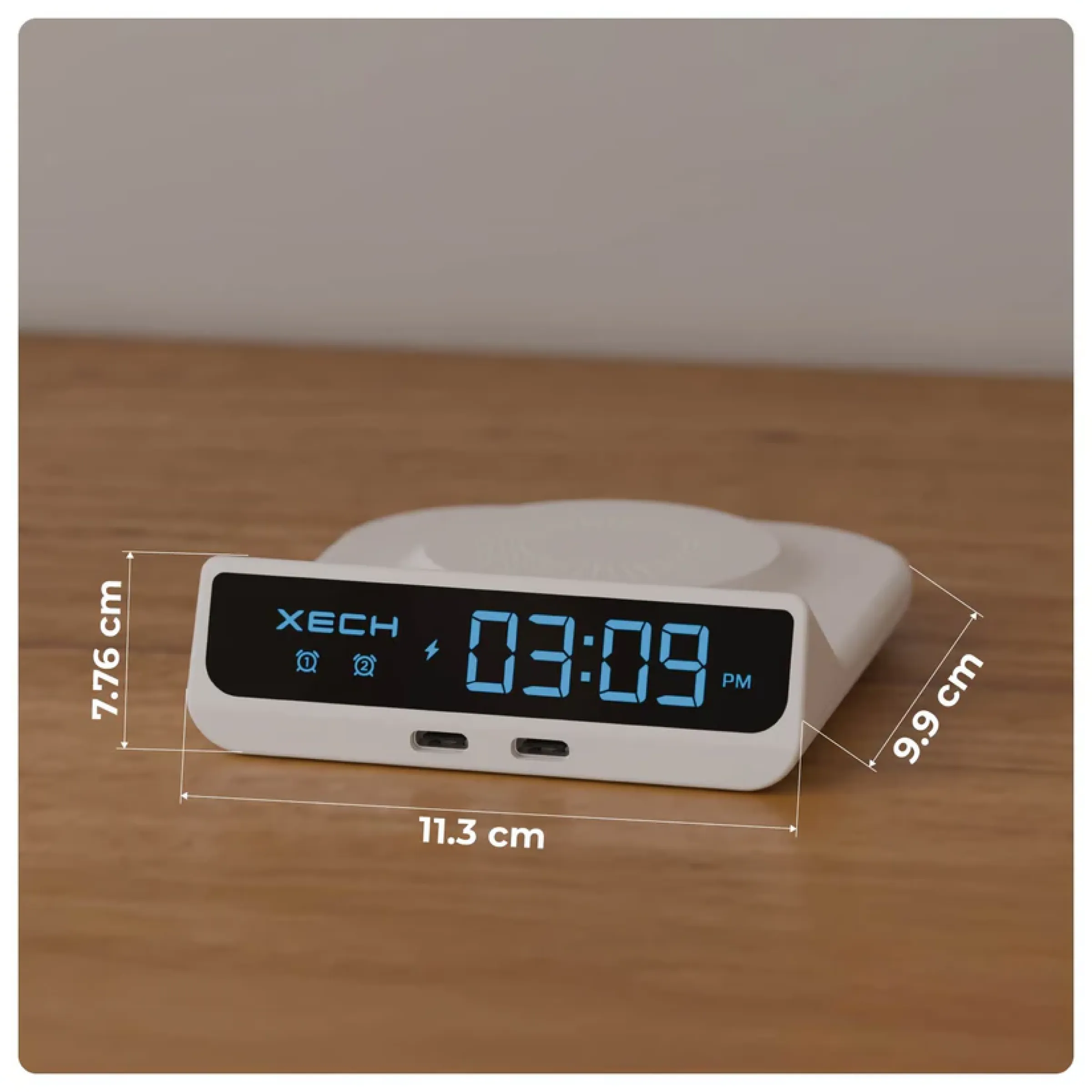 Designed to combine timekeeping and smart charging in a compact form, the Xech original merchandise alarm clock with wireless charger features a 15W fast wireless charging pad that supports charging up to three devices at once through wireless output and dual USB-C ports, making it highly efficient for everyday use. The compact size of 11.3 × 9.9 × 7.76 cm ensures easy portability while fitting neatly on bedside tables, office desks and workstations. Equipped with a clear digital LED time display and adjustable brightness, it offers comfortable visibility day or night along with a dual alarm function for reliable daily scheduling. USB-C power input and plug-and-play operation make setup simple and hassle-free, while the sturdy, easy-to-carry design adds convenience for both home and office environments. With dedicated space available for custom logo and design printing, it serves as a practical and premium choice for corporate gifting alongside regular personal use.